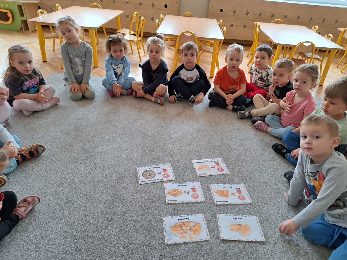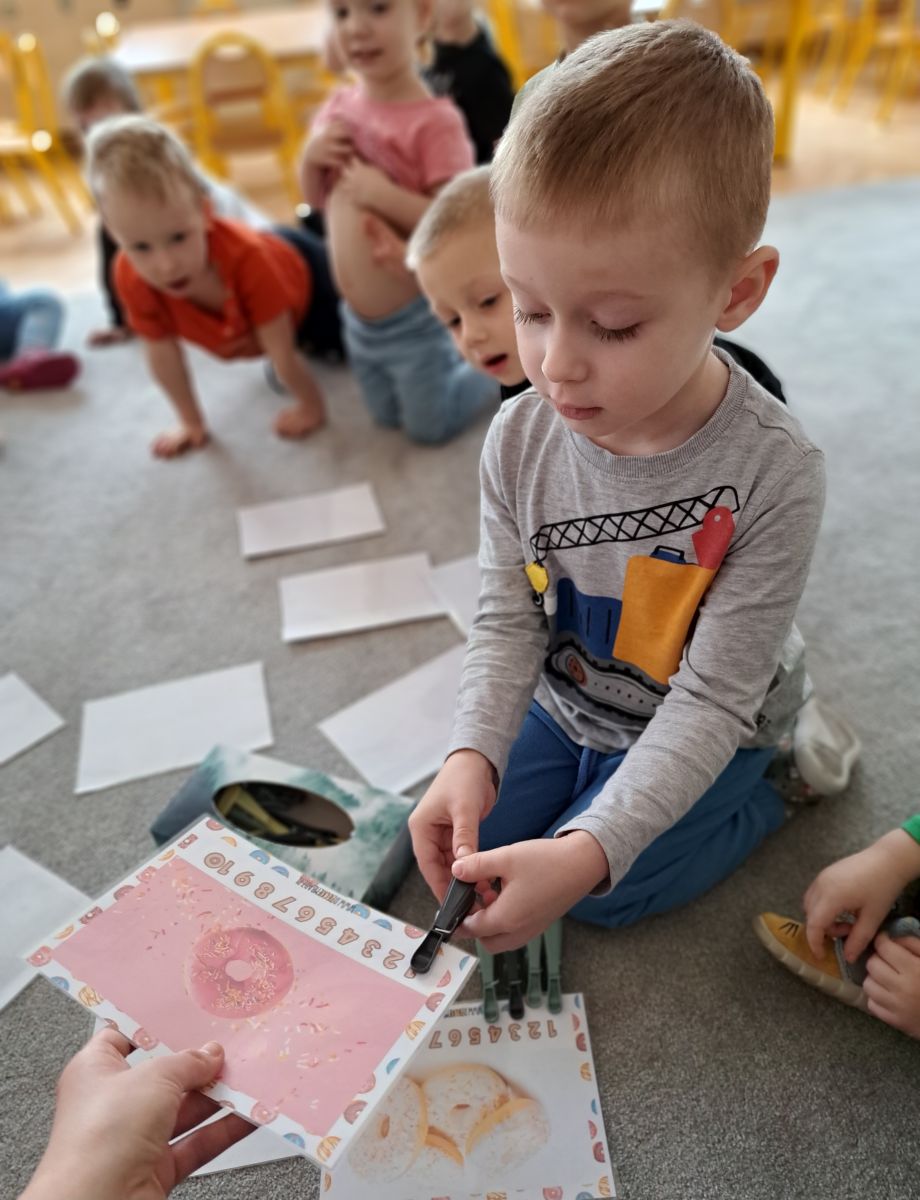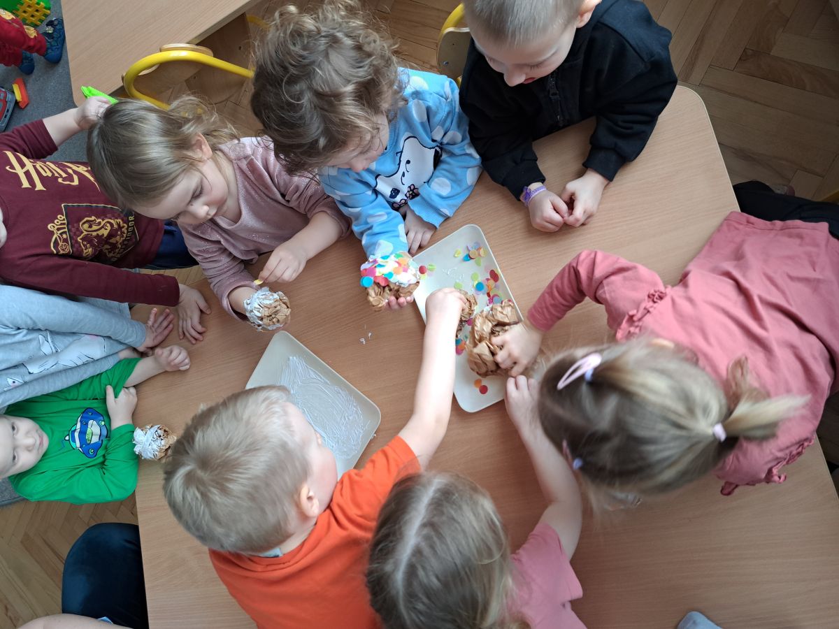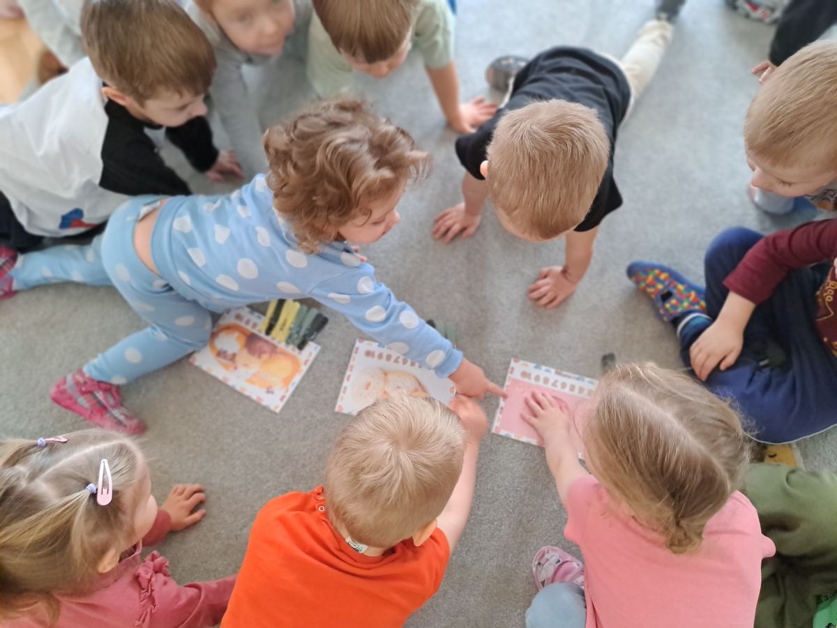 Dzieci poznały tradycje związane z tym dniem oraz porównywały wygląd słodkości z różnych krajów. Oglądały ilustracje pączków i innych wypieków, zwracając uwagę na ich kształt, kolor oraz sposób dekoracji.
