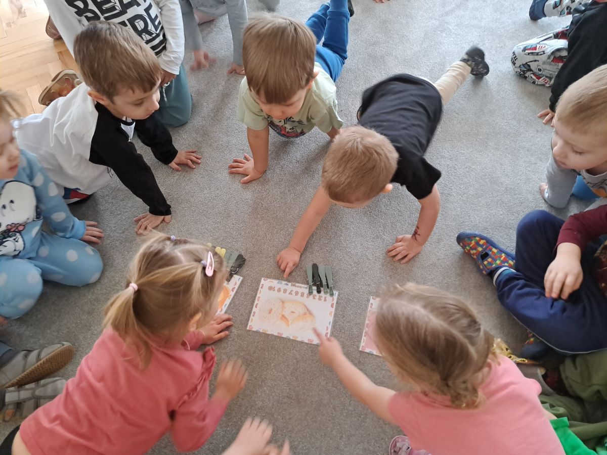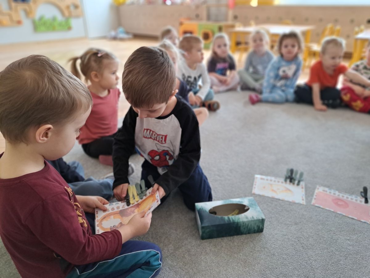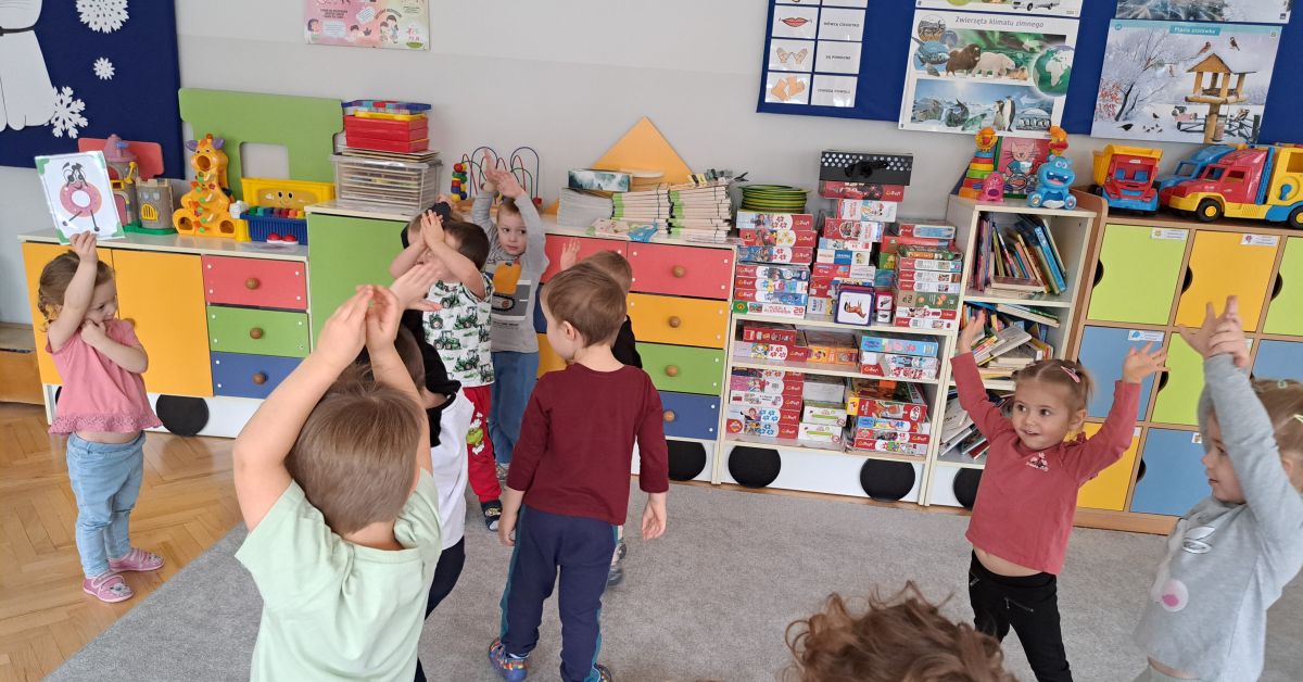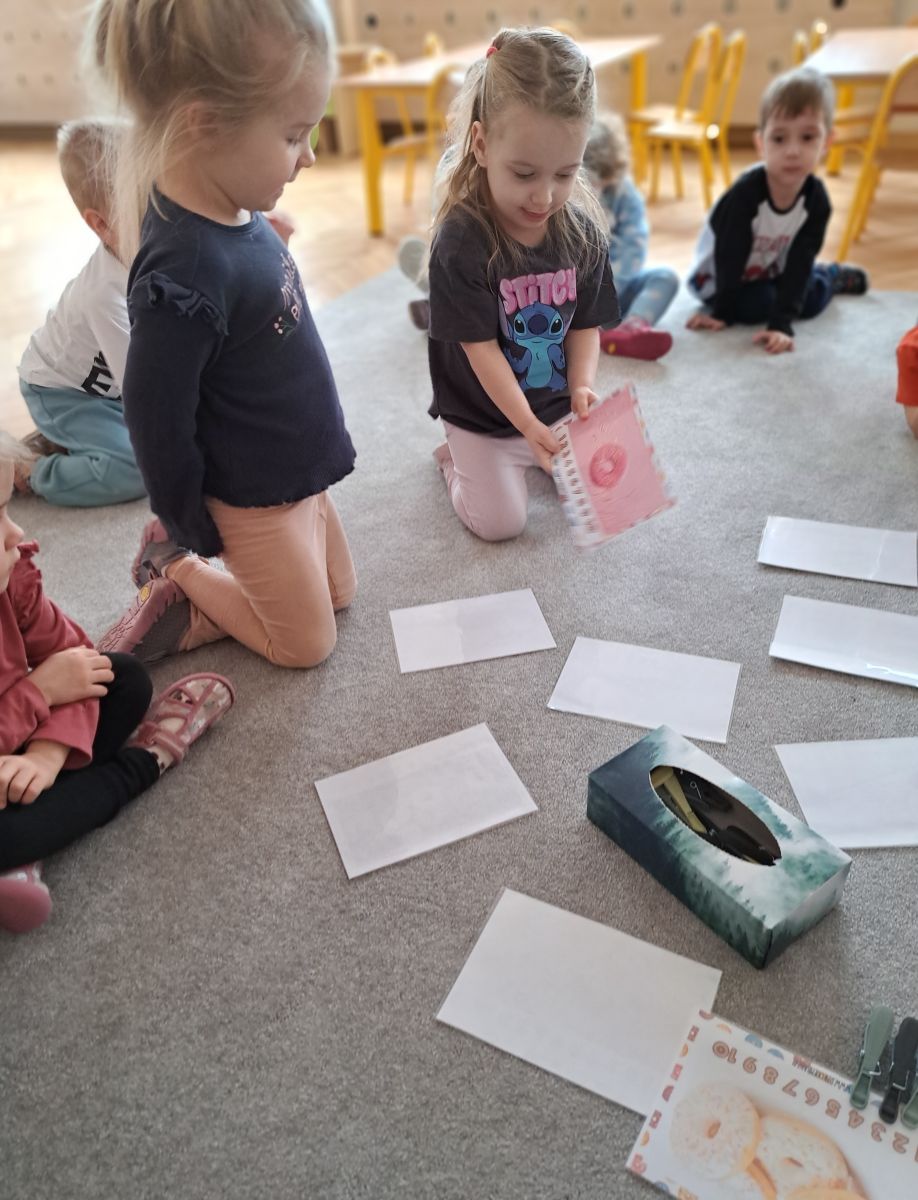 Podczas zajęć nie zabrakło również aktywności matematycznych – przedszkolaki przeliczały pączki i porównywały liczebność zbiorów, określając, gdzie jest więcej, mniej lub tyle samo. W liczeniu pomagały klamerki, dzięki czemu dzieci ćwiczyły również motorykę małą i sprawność dłoni.