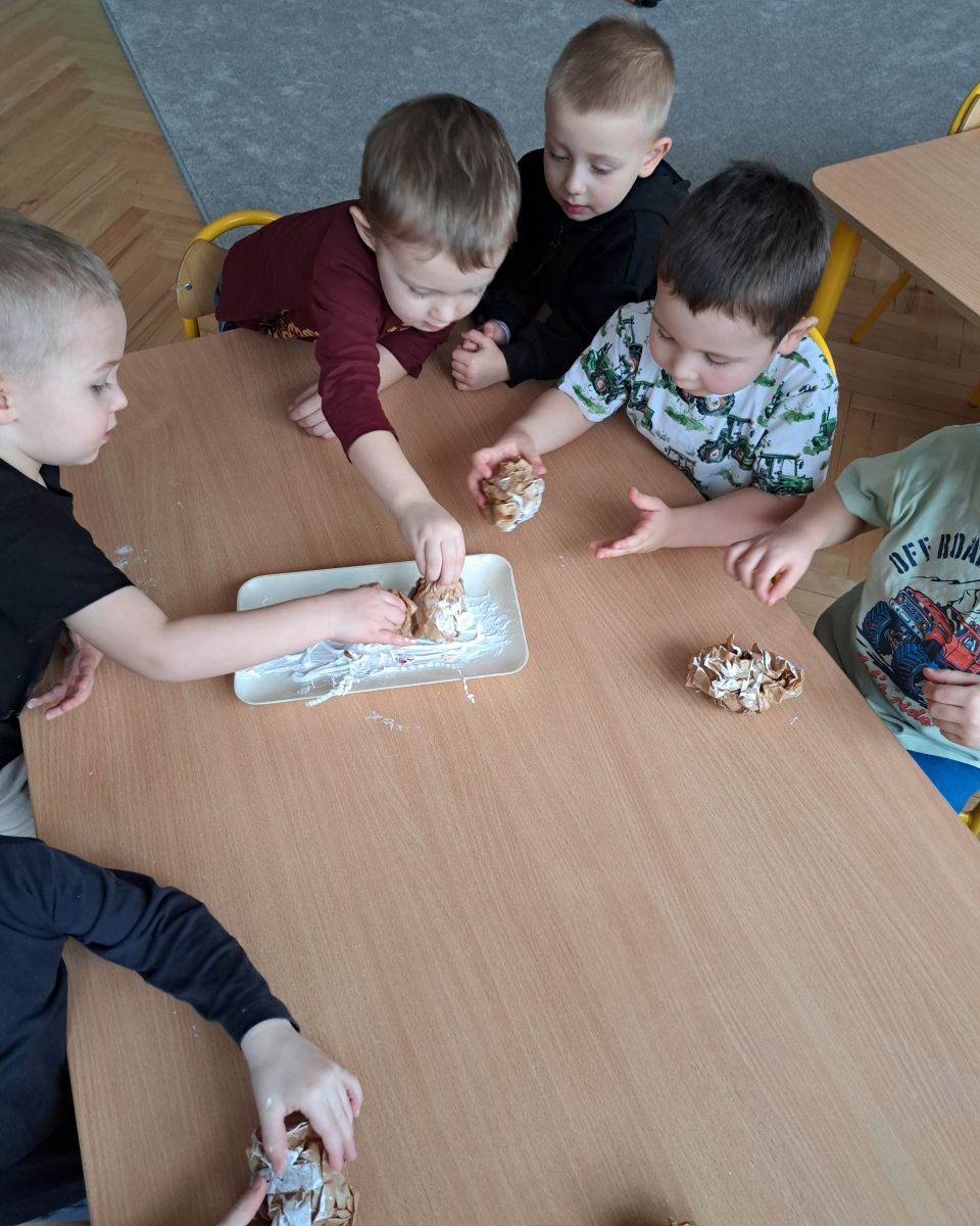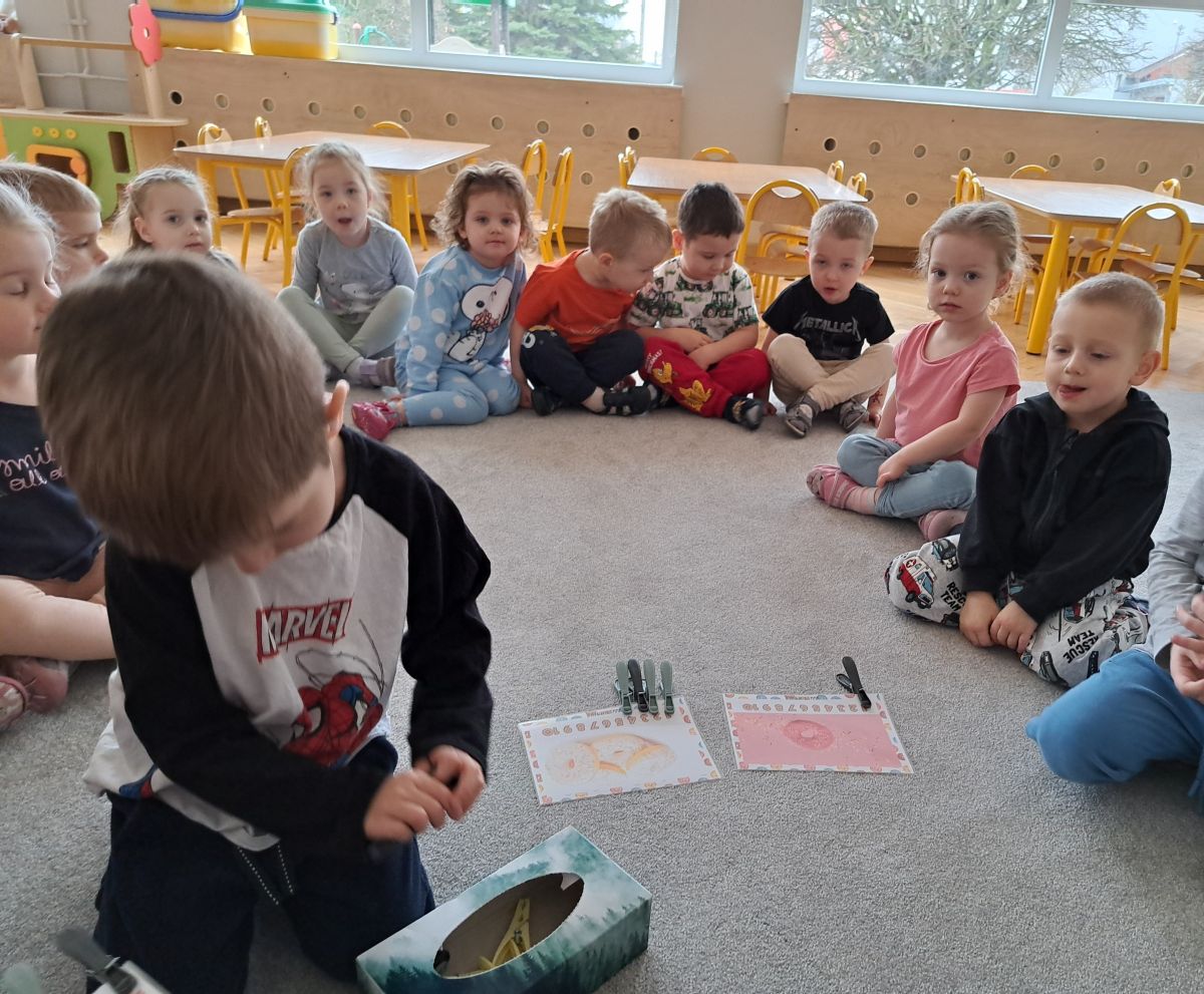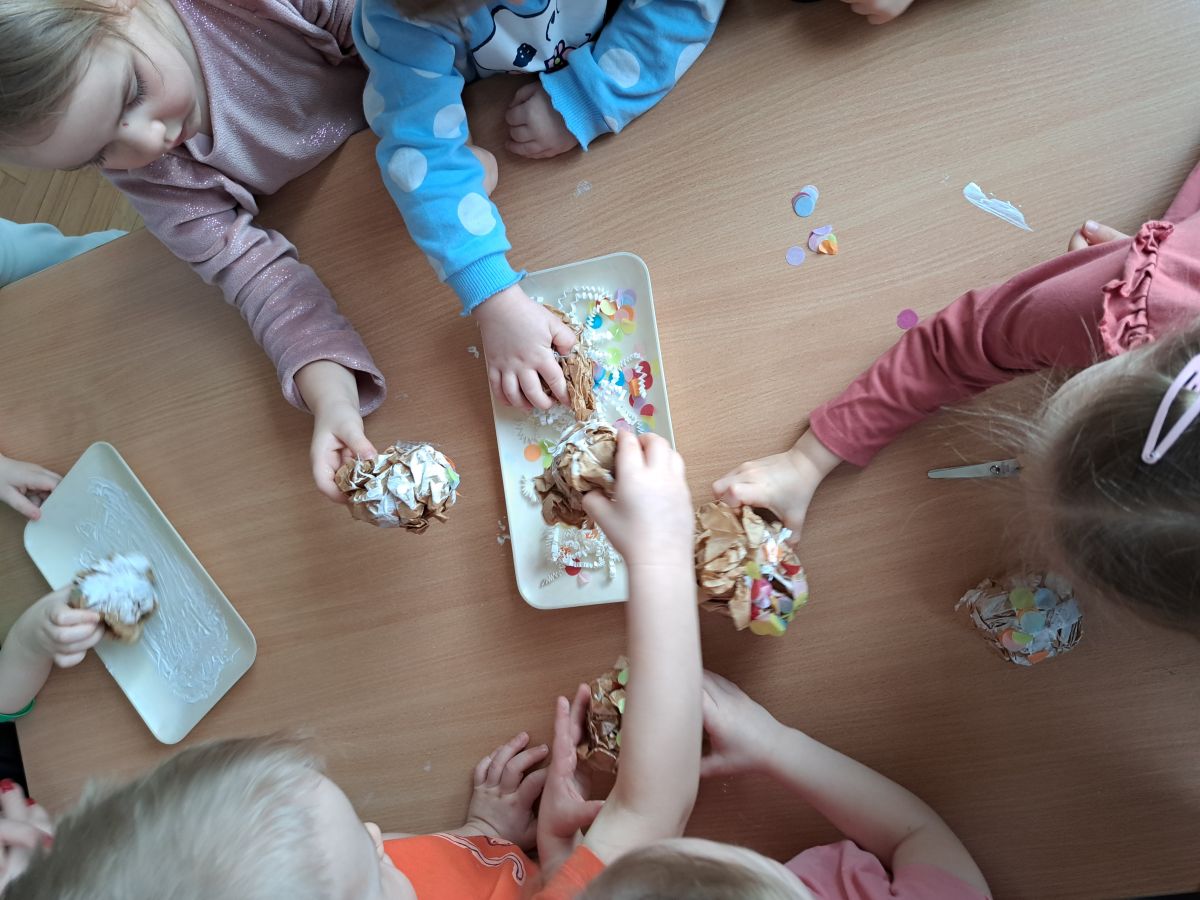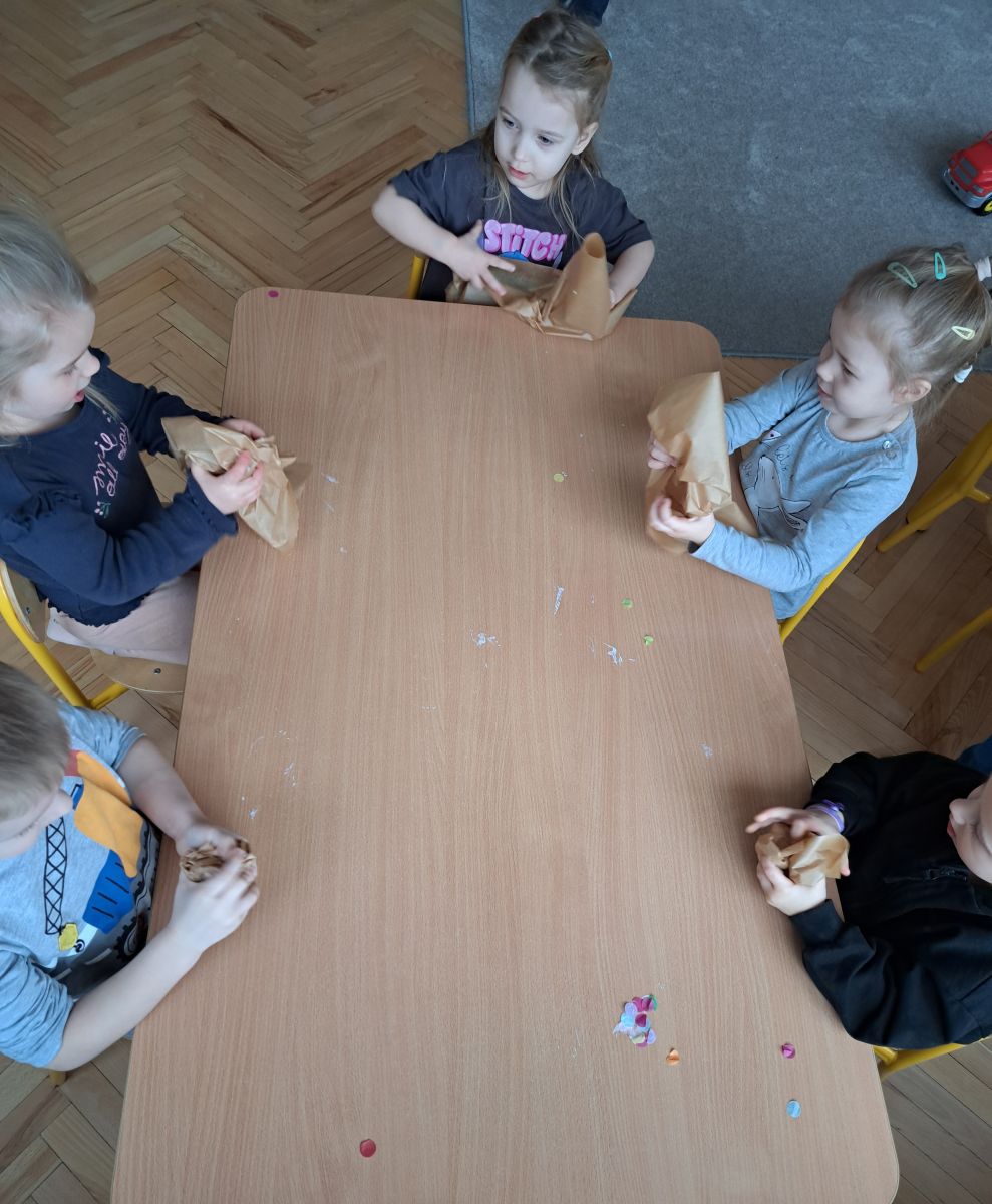 Podczas zajęć nie zabrakło również aktywności matematycznych – przedszkolaki przeliczały pączki i porównywały liczebność zbiorów, określając, gdzie jest więcej, mniej lub tyle samo. W liczeniu pomagały klamerki, dzięki czemu dzieci ćwiczyły również motorykę małą i sprawność dłoni.