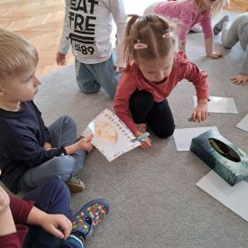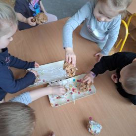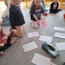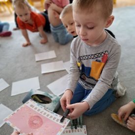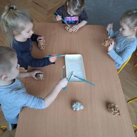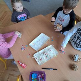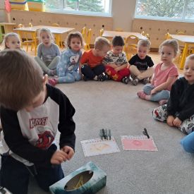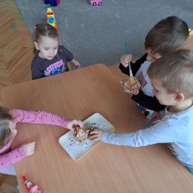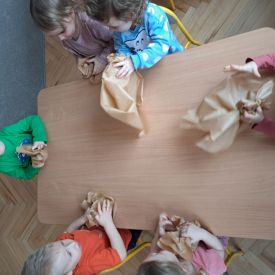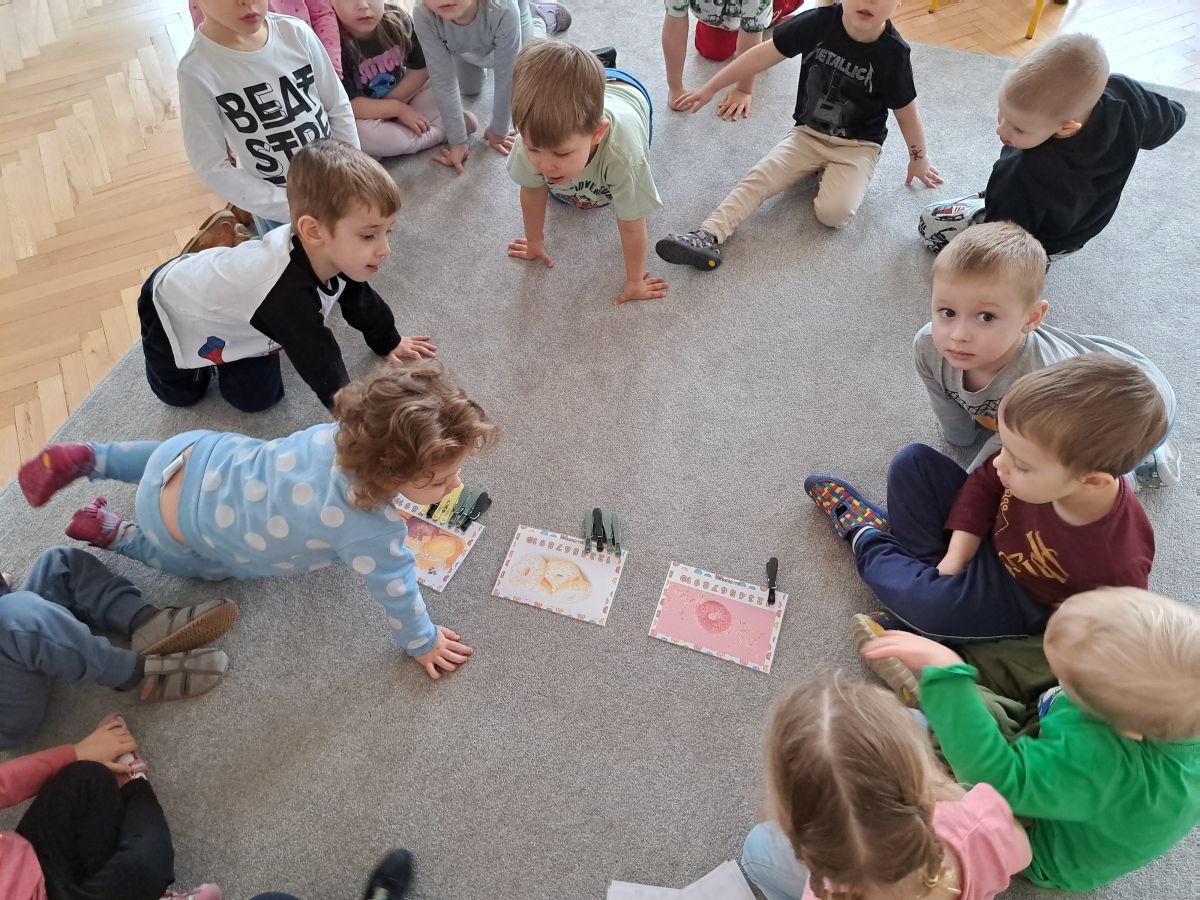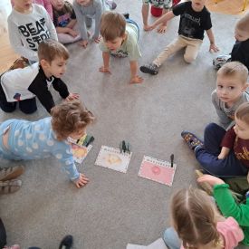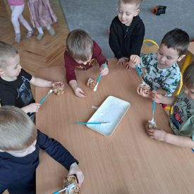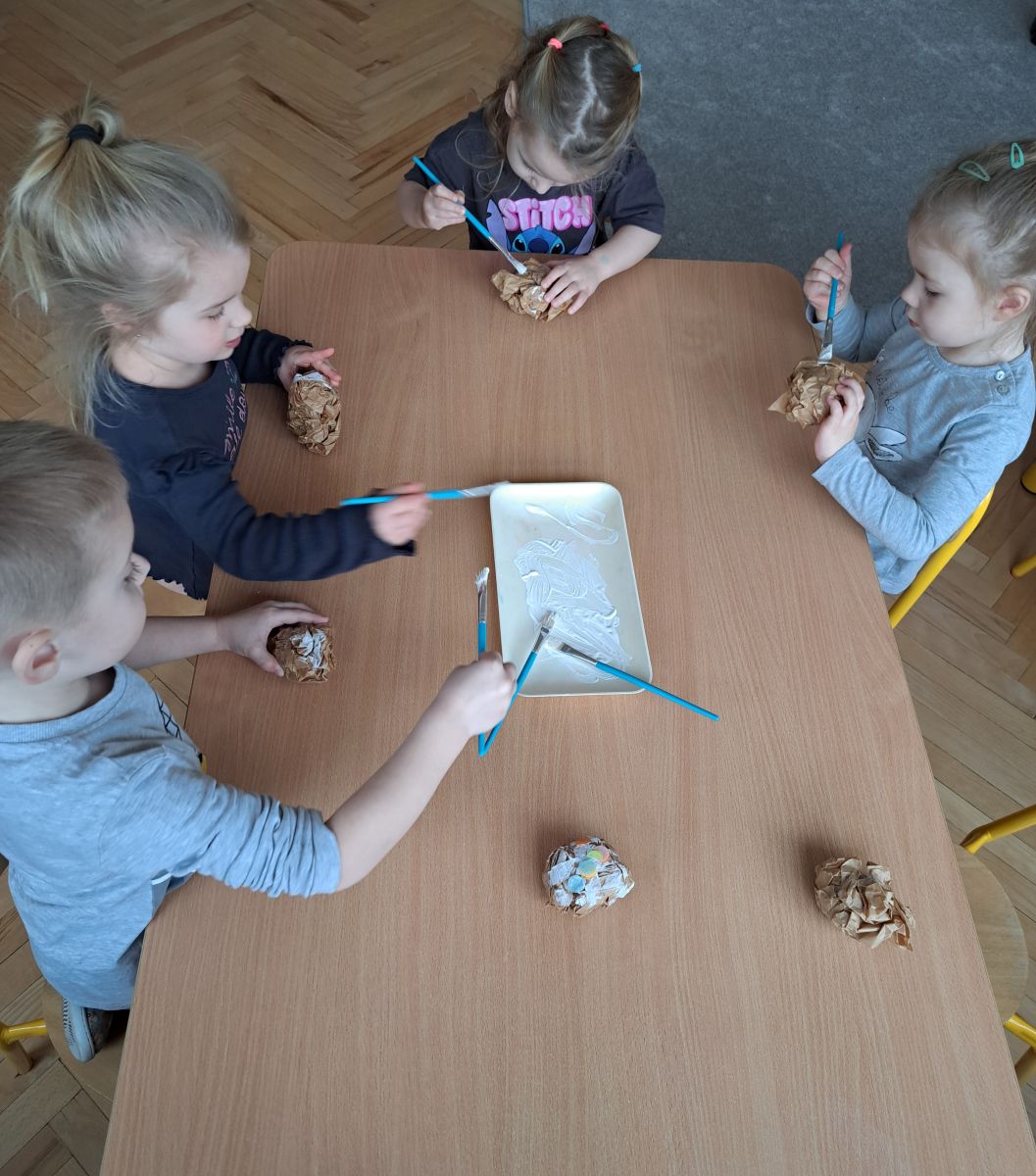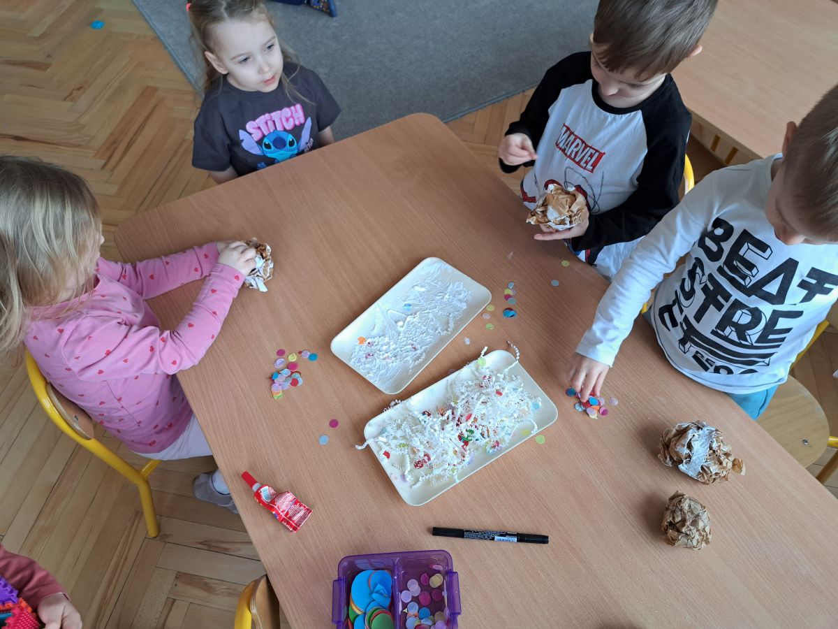 Podczas zajęć nie zabrakło również aktywności matematycznych – przedszkolaki przeliczały pączki i porównywały liczebność zbiorów, określając, gdzie jest więcej, mniej lub tyle samo. W liczeniu pomagały klamerki, dzięki czemu dzieci ćwiczyły również motorykę małą i sprawność dłoni.