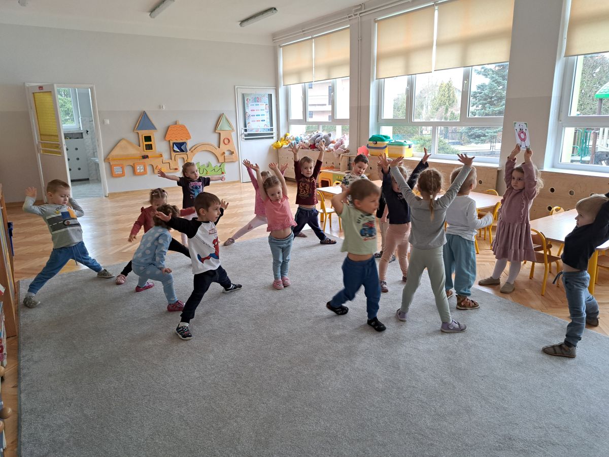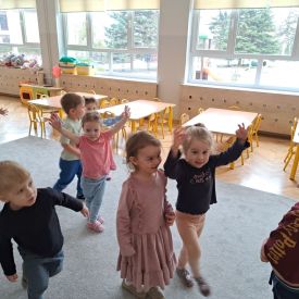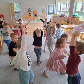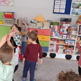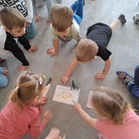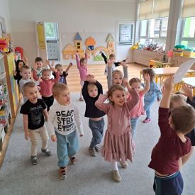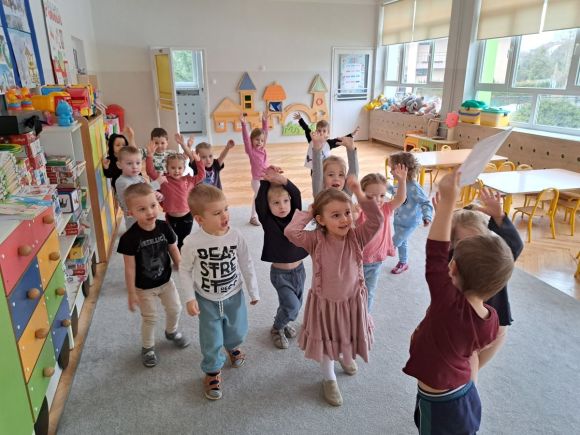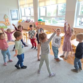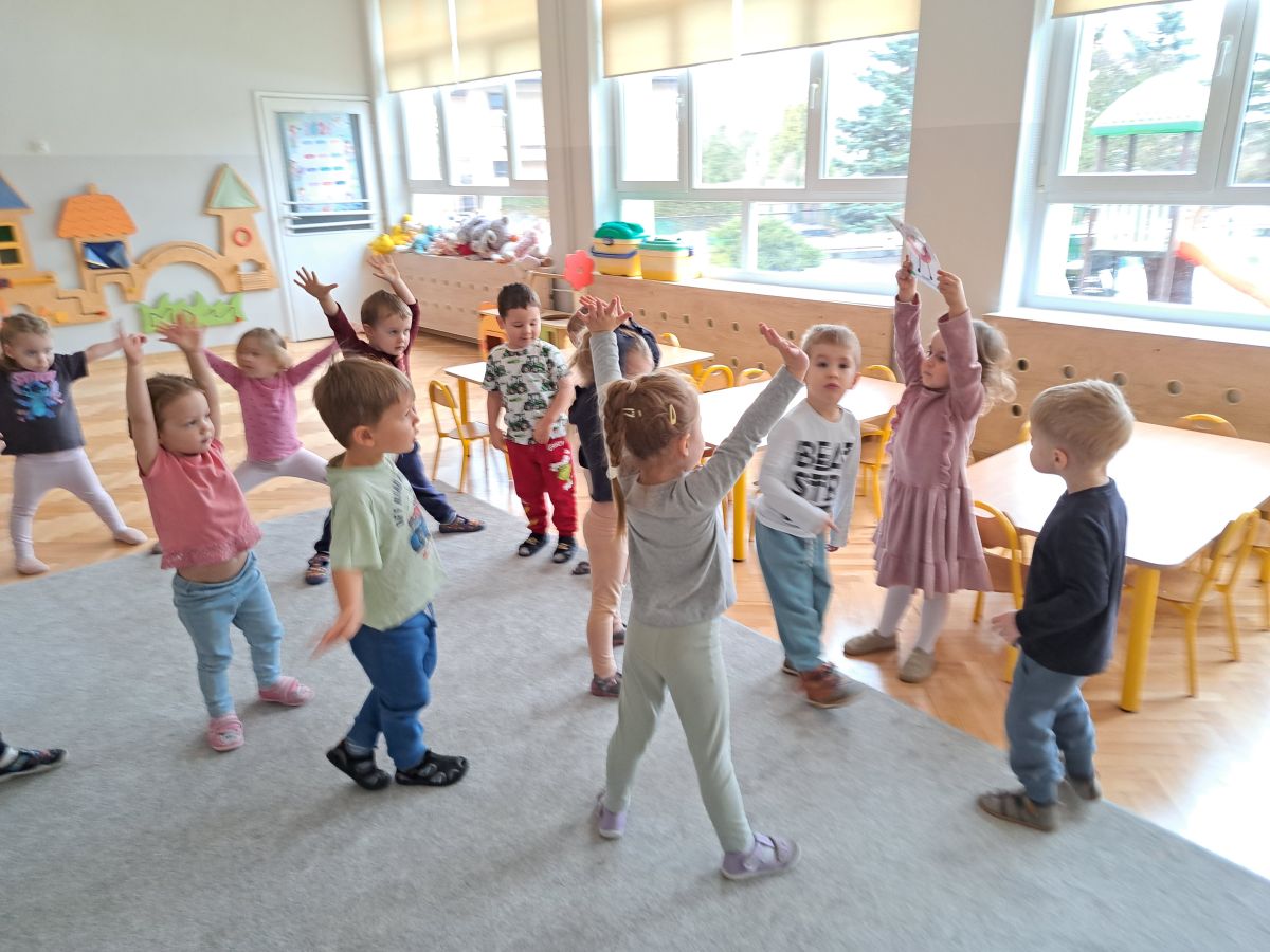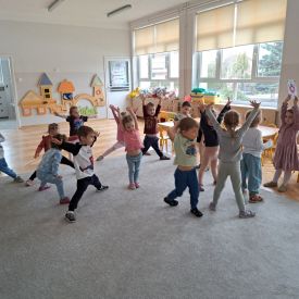 Wiele radości sprawiła dzieciom „pączkowa gimnastyka” – były podskoki, stanie na jednej nodze oraz różne wesołe wygibasy.