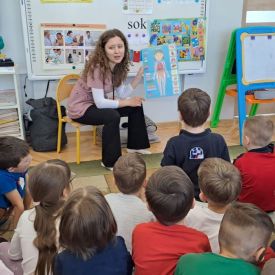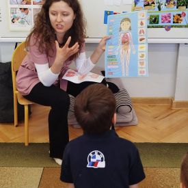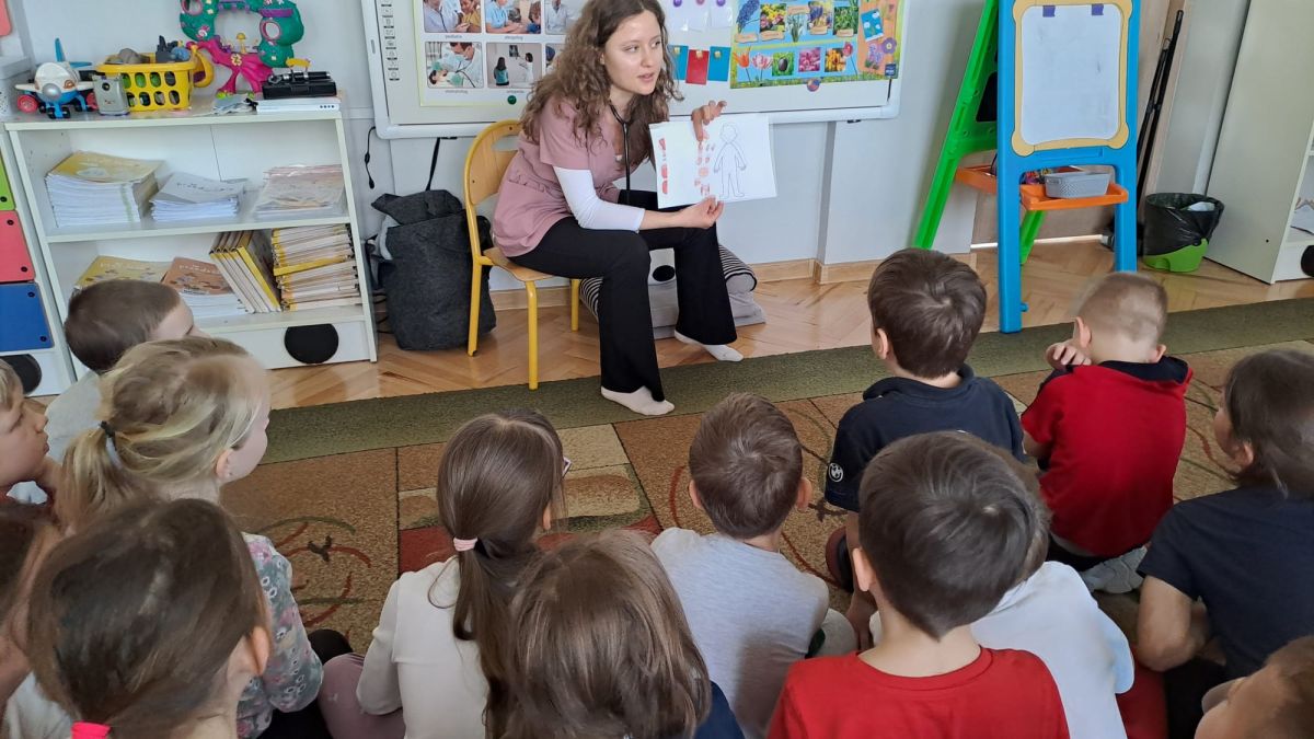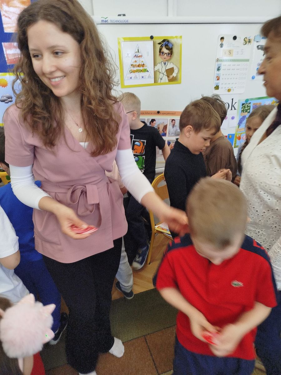 Przedszkolaki bardzo chętnie brały udział w zajęciach – wykazały się dużą wiedzą, odwagą oraz ogromną ciekawością. Zadawały mnóstwo pytań, na które pani Maria cierpliwie i z uśmiechem odpowiadała, tworząc ciepłą i przyjazną atmosferę. W dalszej części spotkania dzieci dowiedziały się, jakie narządy znajdują się w organizmie człowieka, za co odpowiadają oraz dlaczego tak ważne jest dbanie o zdrowie. Pani doktor podkreśliła, jak istotna jest zdrowa dieta, wskazując, jakie produkty warto spożywać, a jakich unikać, aby jak najdłużej cieszyć się zdrowiem i energią. Spotkanie było nie tylko bardzo pouczające, ale również niezwykle interesujące i inspirujące. Na zakończenie pani doktor wręczyła starszakom dyplomy i naklejki, co sprawiło dzieciom ogromną radość.
