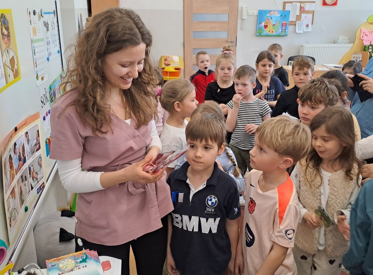 W ramach podziękowania przedszkolaki przygotowały dla naszego gościa wyjątkowy prezent – własnoręcznie wykonaną książeczkę pełną laurek, serduszek oraz rysunków przedstawiających ich wyobrażenia o pracy lekarza oraz własnoręcznie wykonane bransoletki. Po tym spotkaniu część dzieci z dumą zadeklarowała, że w przyszłości chciałaby pomagać innym i zostać lekarzem – tak jak pani Maria.