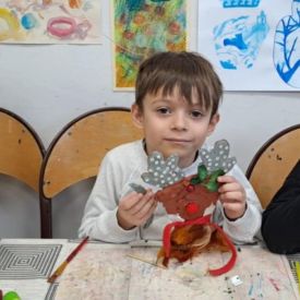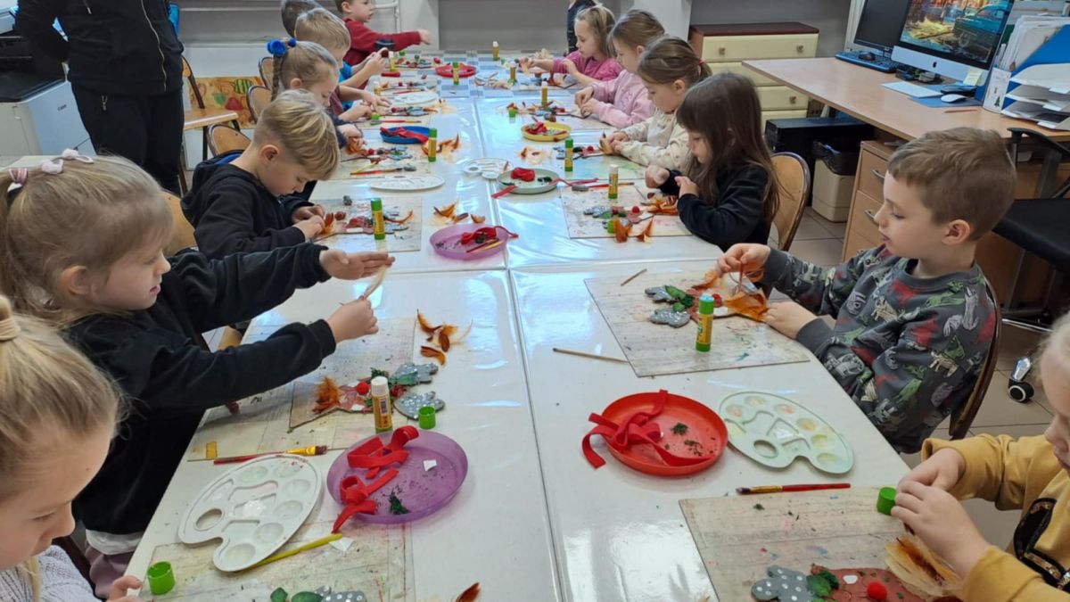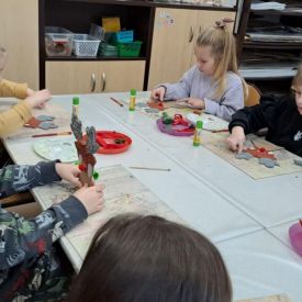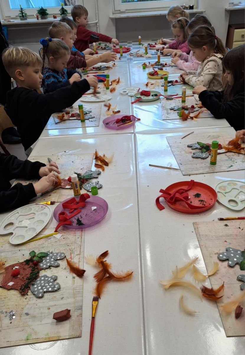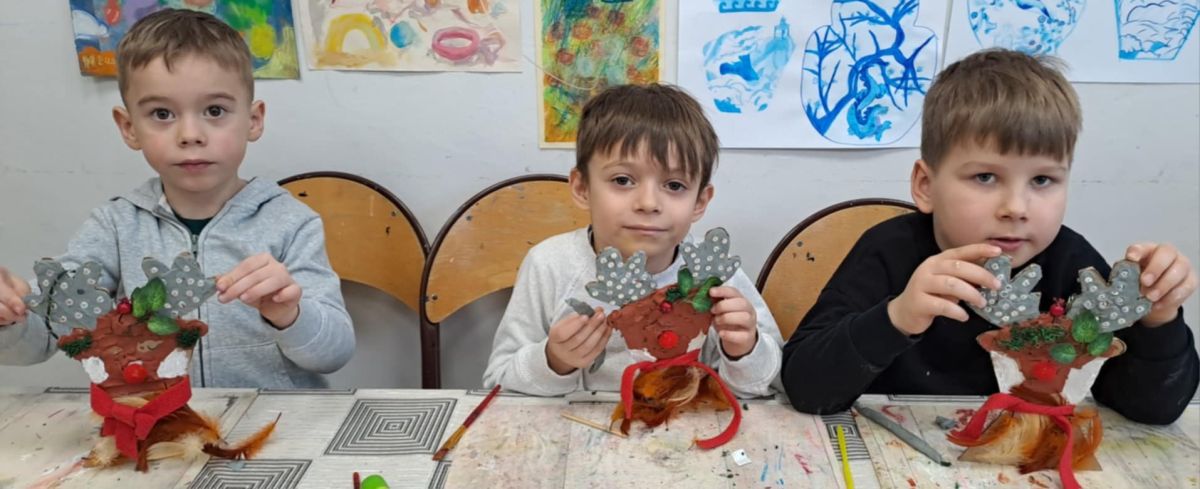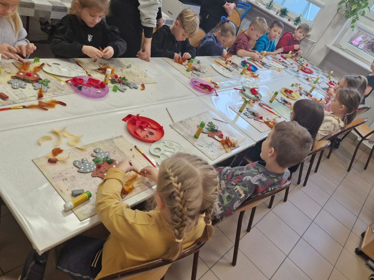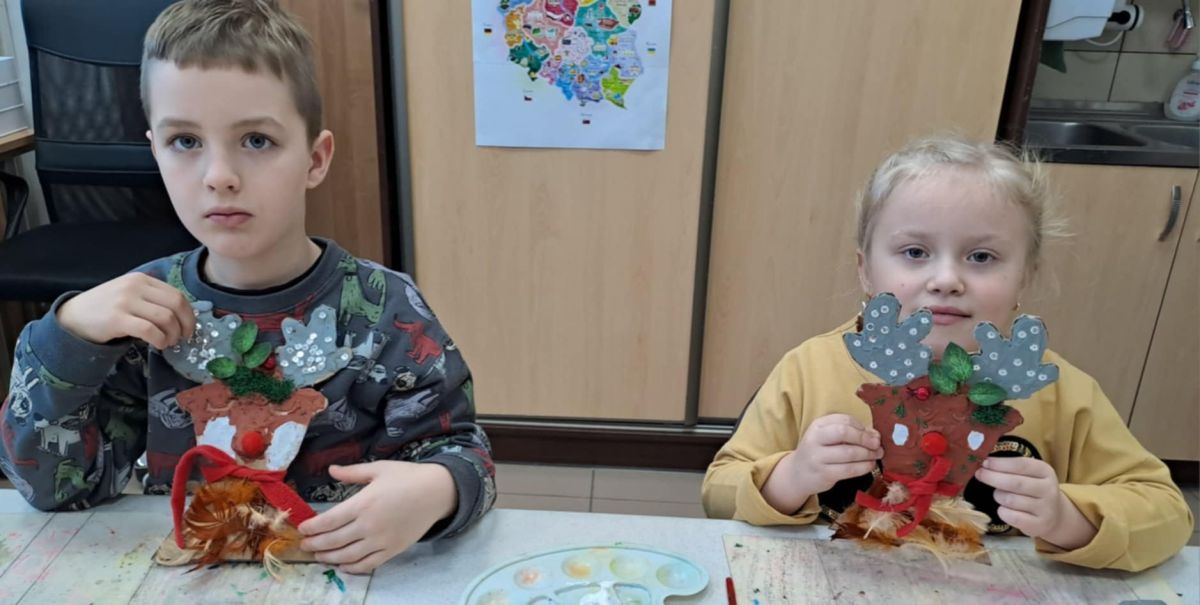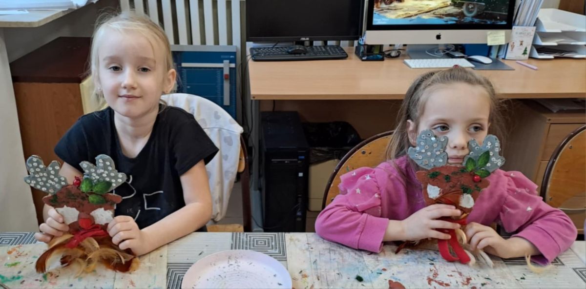 Grupa Biedronek z naszego przedszkola odwiedziła Ośrodek Kultury „Ziemowit”, aby wziąć udział w twórczych warsztatach pt. „Renifery w szaliczku”. Podczas zajęć dzieci wykonały własne, płaskie zawieszki w kształcie renifera. Każda praca była wyjątkowa – przedszkolaki dekorowały swoje renifery farbami, piórami, mchem, igliwiem oraz materiałem. Warsztaty były doskonałą okazją do rozwijania kreatywności, sprawności manualnej i wyobraźni.