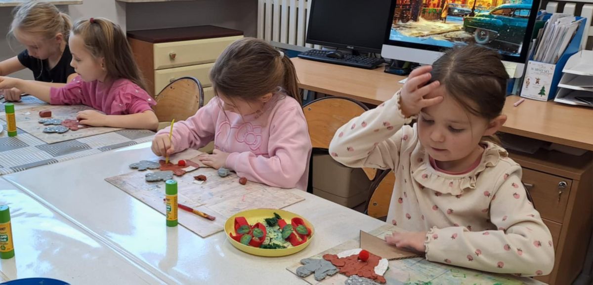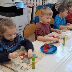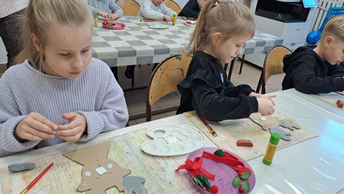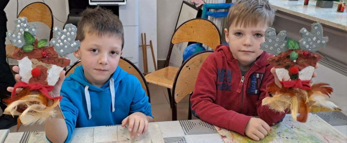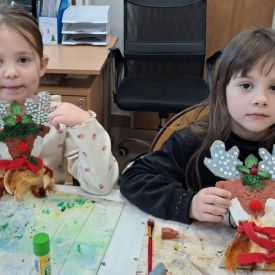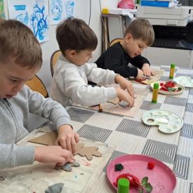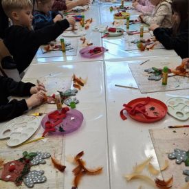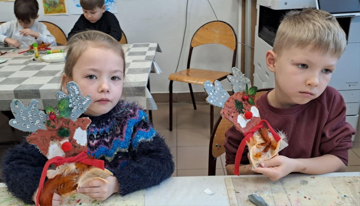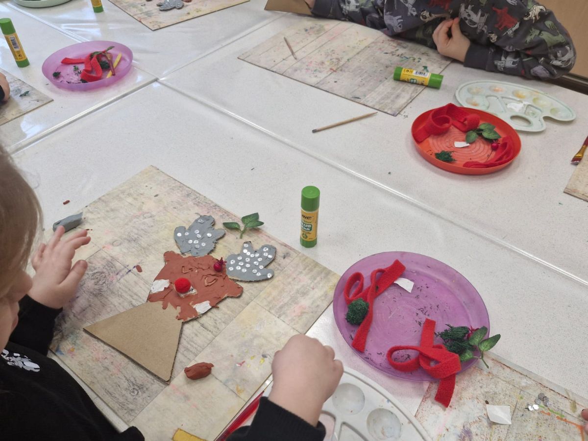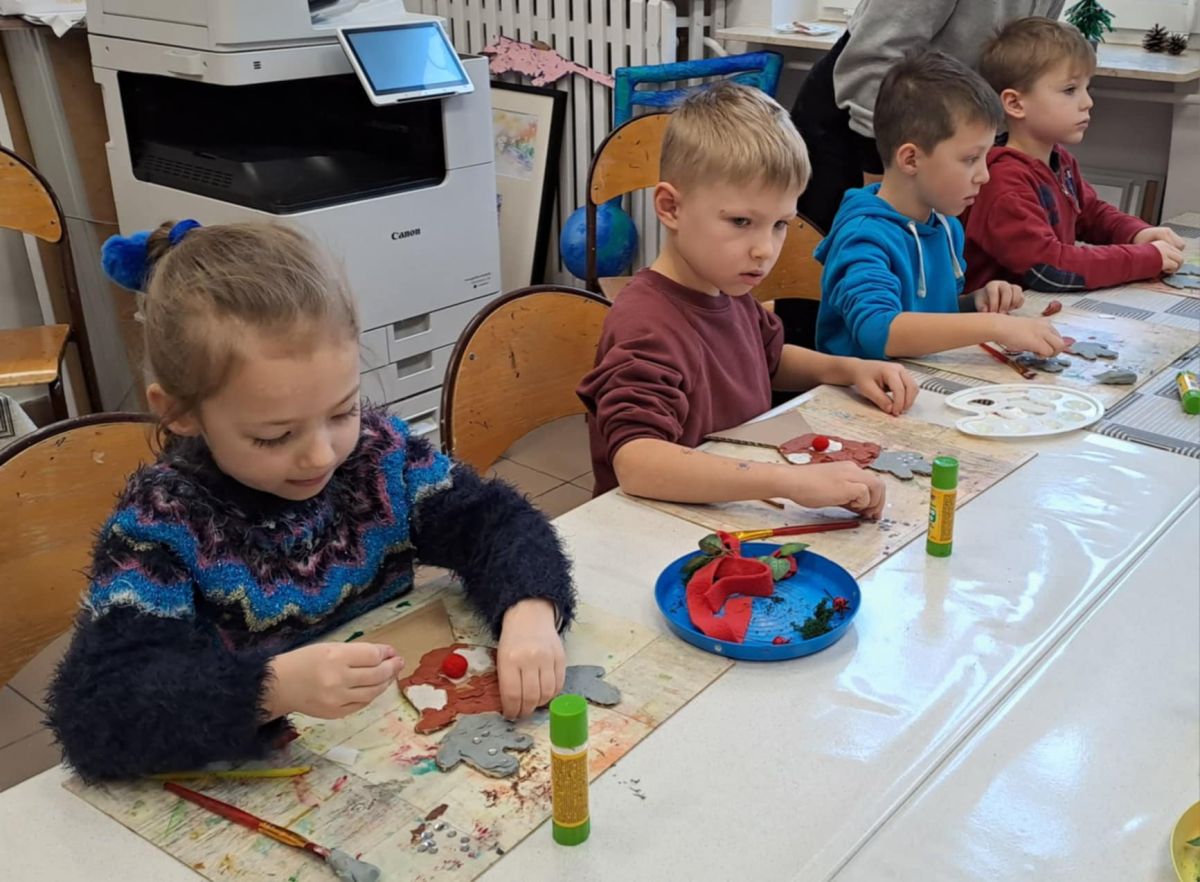 Grupa Biedronek z naszego przedszkola odwiedziła Ośrodek Kultury „Ziemowit”, aby wziąć udział w twórczych warsztatach pt. „Renifery w szaliczku”. Podczas zajęć dzieci wykonały własne, płaskie zawieszki w kształcie renifera. Każda praca była wyjątkowa – przedszkolaki dekorowały swoje renifery farbami, piórami, mchem, igliwiem oraz materiałem. Warsztaty były doskonałą okazją do rozwijania kreatywności, sprawności manualnej i wyobraźni.