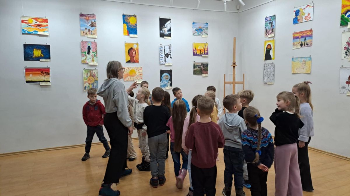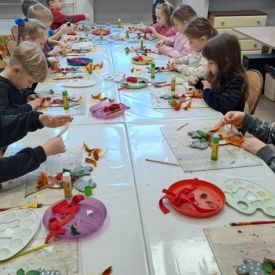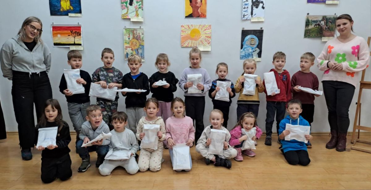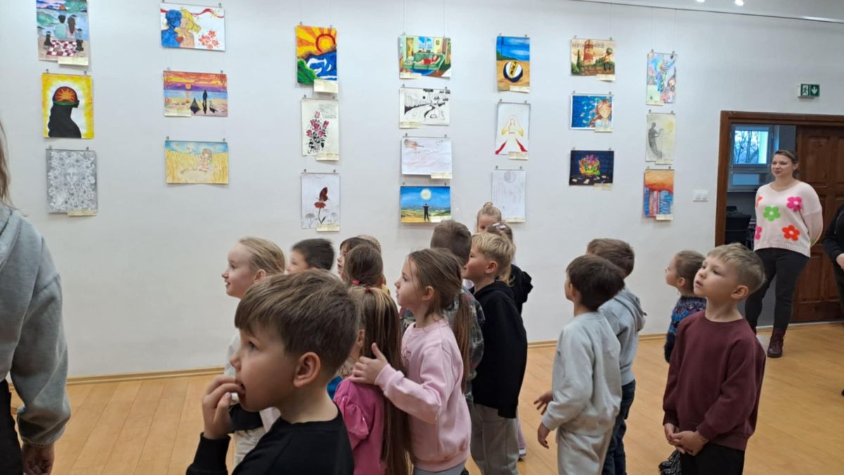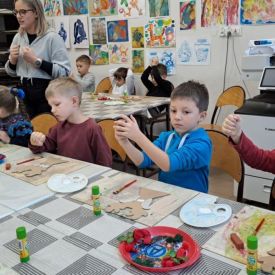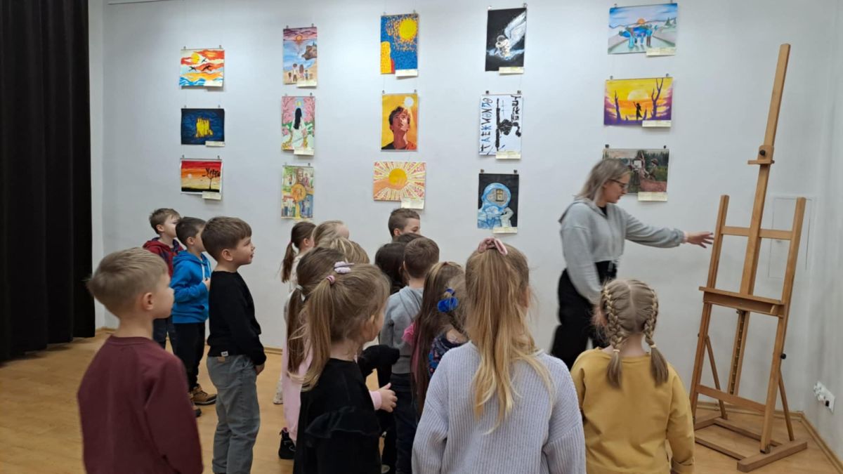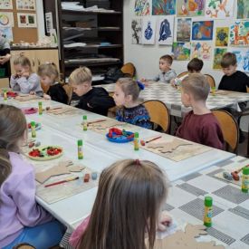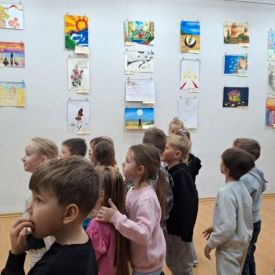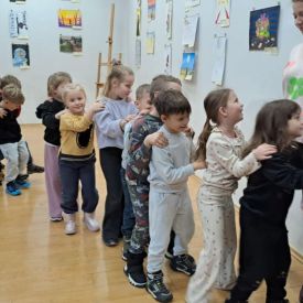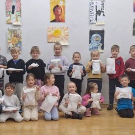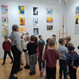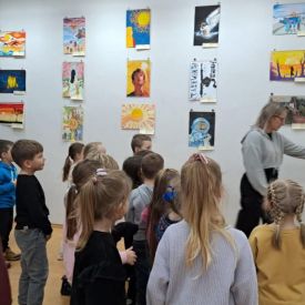 Dodatkową atrakcją była wizyta w galerii, gdzie dzieci mogły obejrzeć prezentowane obrazy i wysłuchać ciekawych informacji na ich temat. Pani Agnieszka, która powadziła warsztaty, z pasją opowiadała o sztuce, zachęcając przedszkolaków do uważnego patrzenia i wyrażania własnych spostrzeżeń.