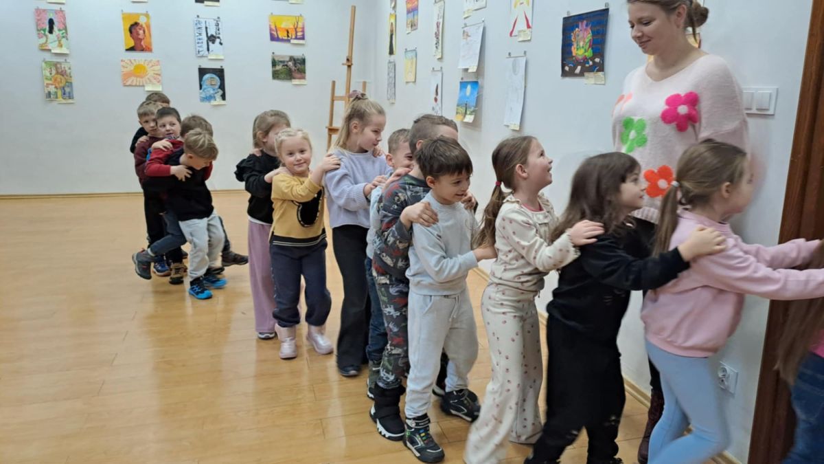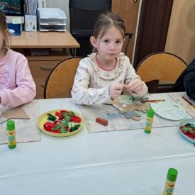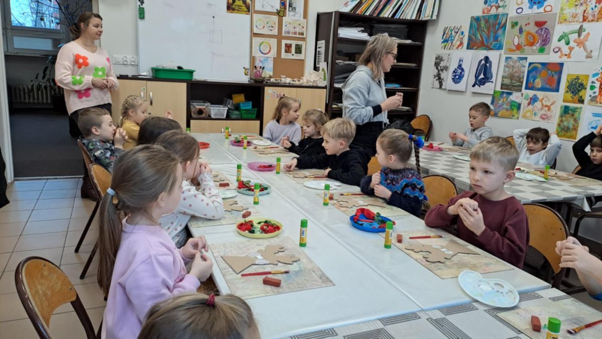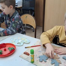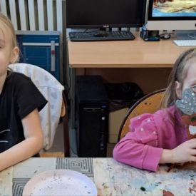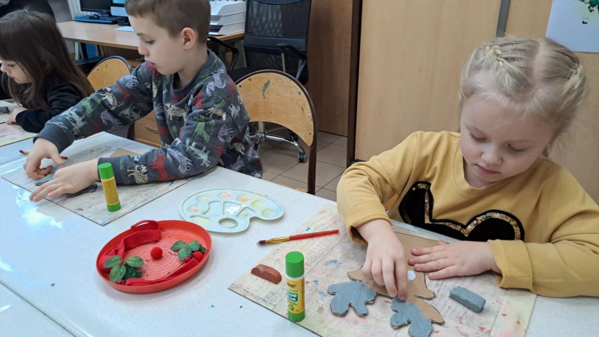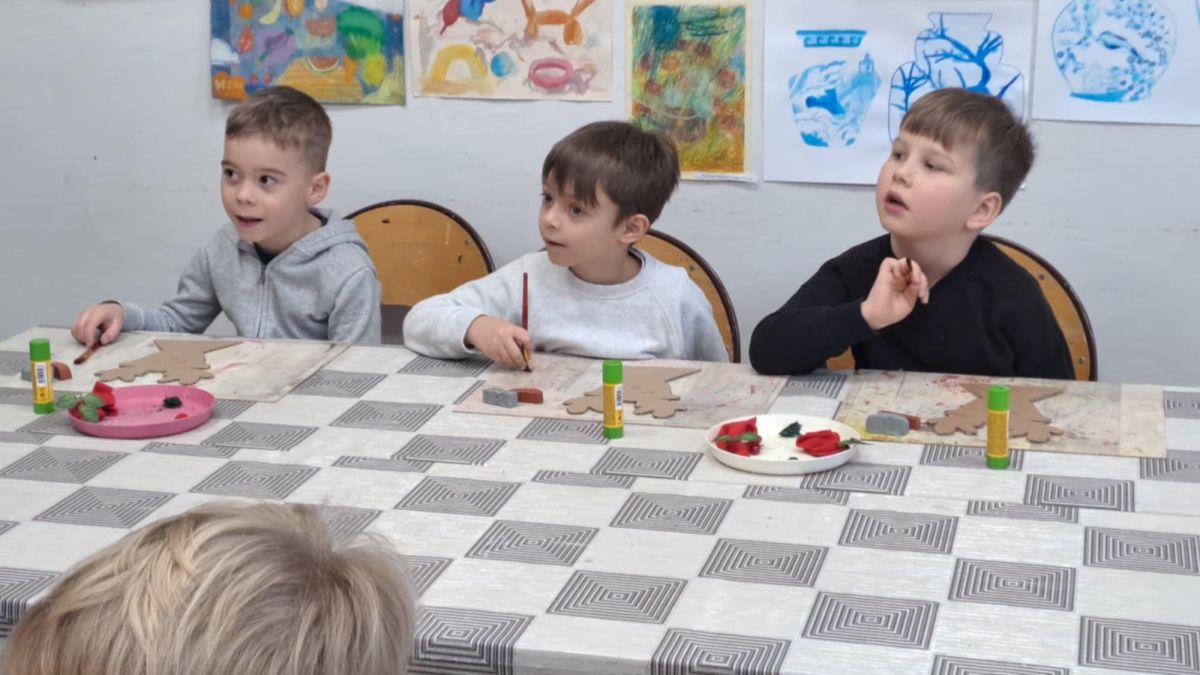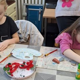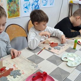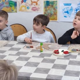 Dodatkową atrakcją była wizyta w galerii, gdzie dzieci mogły obejrzeć prezentowane obrazy i wysłuchać ciekawych informacji na ich temat. Pani Agnieszka, która powadziła warsztaty, z pasją opowiadała o sztuce, zachęcając przedszkolaków do uważnego patrzenia i wyrażania własnych spostrzeżeń.