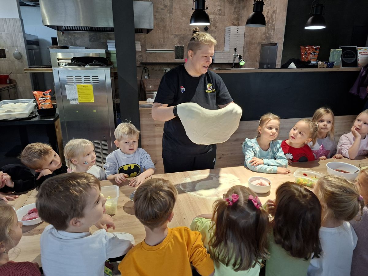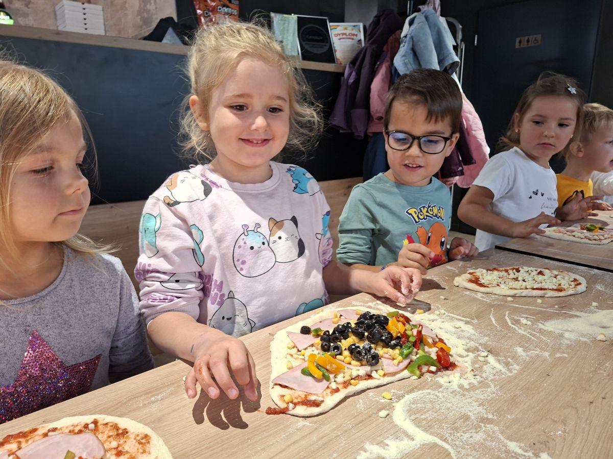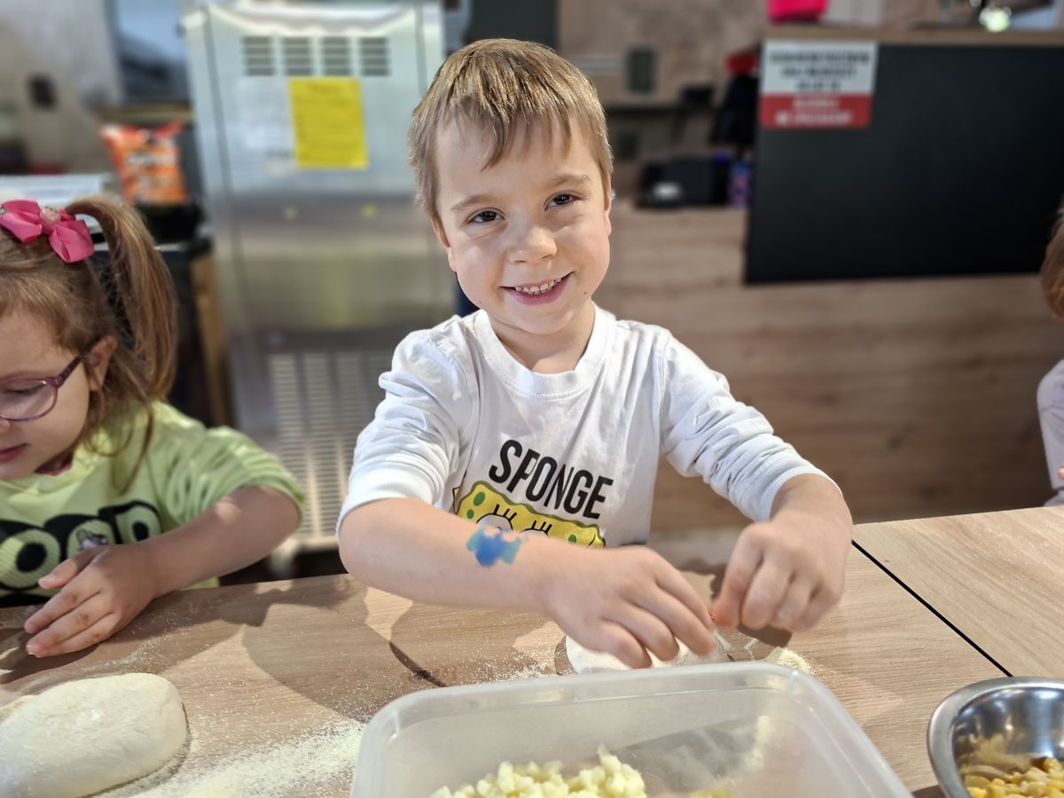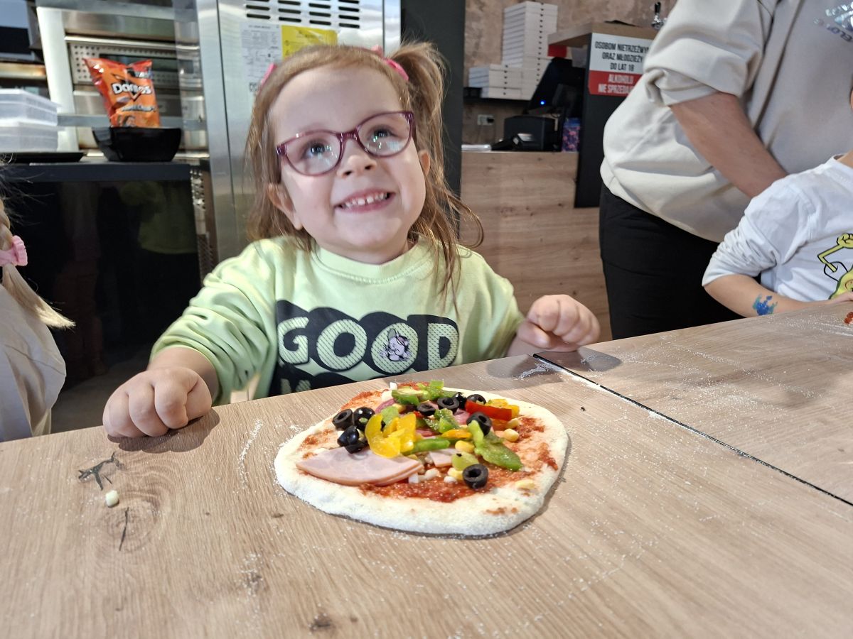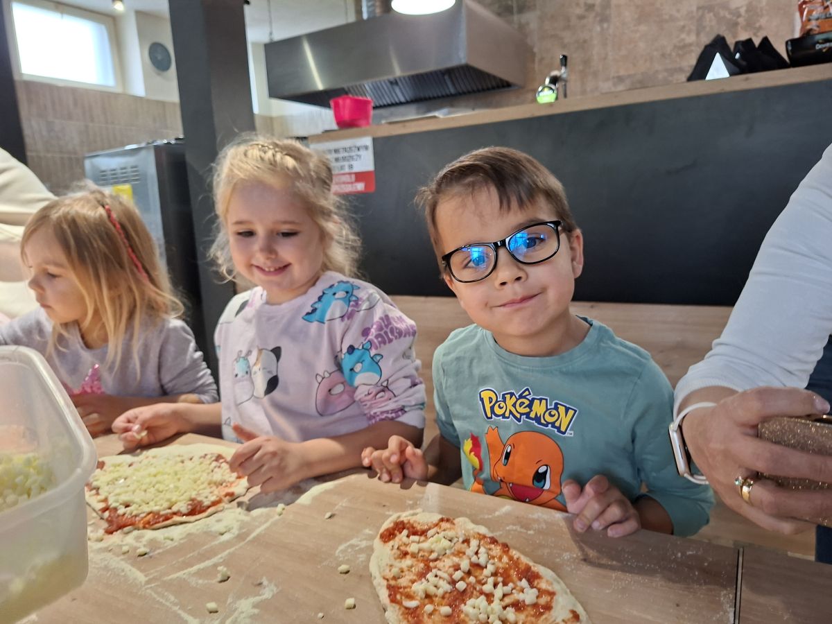 Dziś grupa Jeżyki wzięła udział w wyjątkowych warsztatach kulinarnych, podczas których dzieci samodzielnie przygotowywały pizzę. Na początku zajęć uczestnicy poznali składniki potrzebne do przygotowania ciasta – mąkę, drożdże, wodę, oliwę oraz sól. Następnie, zgodnie z instrukcją prowadzącego, wyrabiały własne ciasto, ucząc się przy tym cierpliwości i dokładności. Kiedy ciasto było gotowe, dzieci mogły wybrać swoje ulubione dodatki – sos pomidorowy, ser, szynkę, kukurydzę, pomidory, oliwki czy pieczarki. Każdy mały kucharz stworzył swoją unikalną pizzę według własnego pomysłu. Z ogromnym zainteresowaniem obserwowaliśmy proces wypieku w piecu, a zapach świeżej pizzy wypełnił całą salę. Po chwili nadszedł najbardziej wyczekiwany moment – degustacja! Wszystkie pizze smakowały wyśmienicie, a dzieci z dumą częstowały się swoimi wypiekami. Na zakończenie każdy uczestnik otrzymał dyplom „Małego Kucharza”, potwierdzający zdobyte umiejętności i zaangażowanie w warsztaty. To był dzień pełen radości, wspólnej zabawy i kulinarnych przygód!