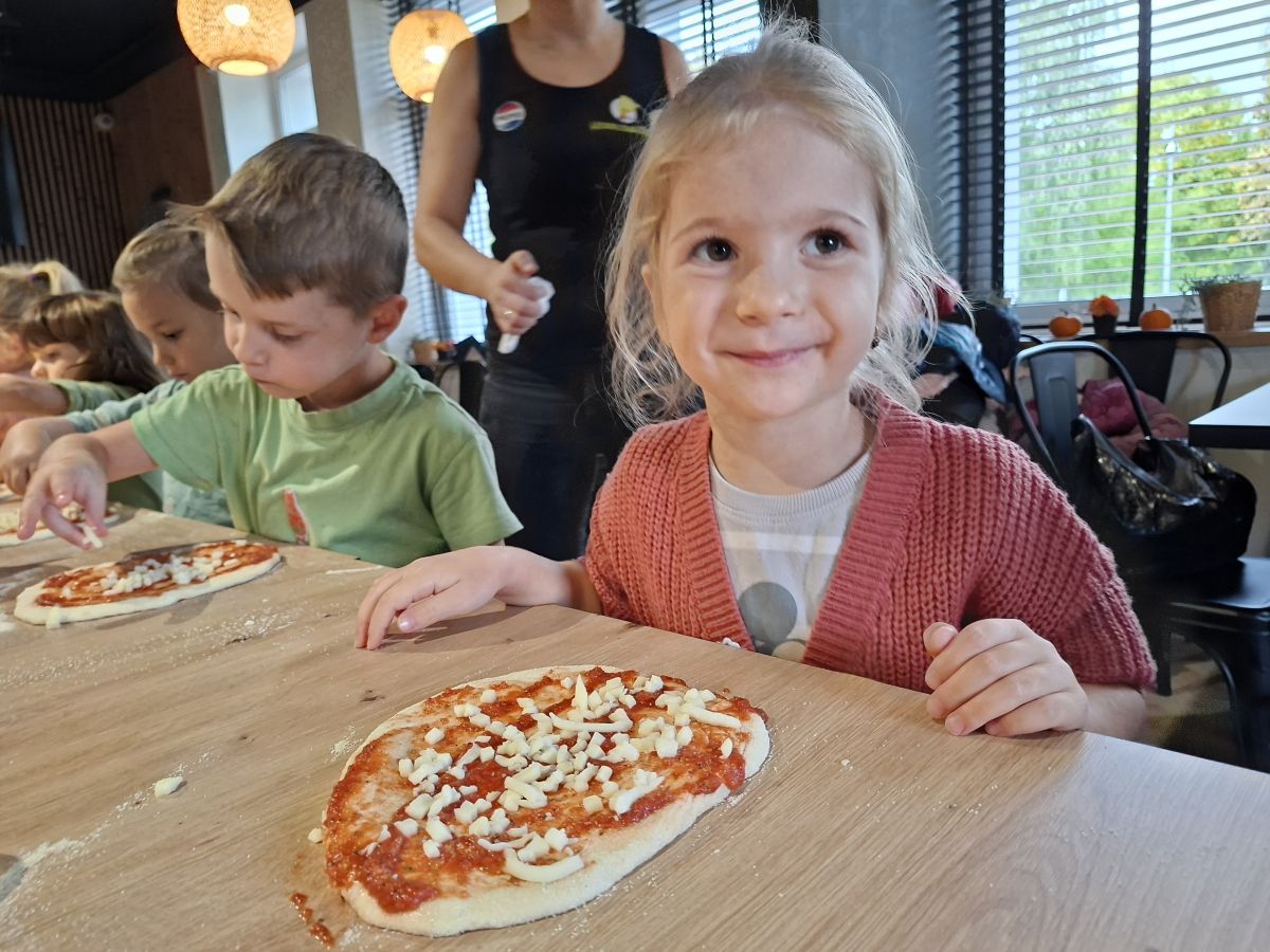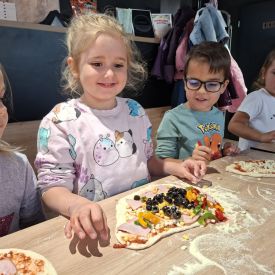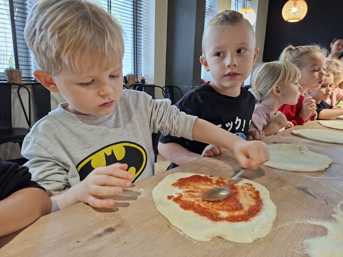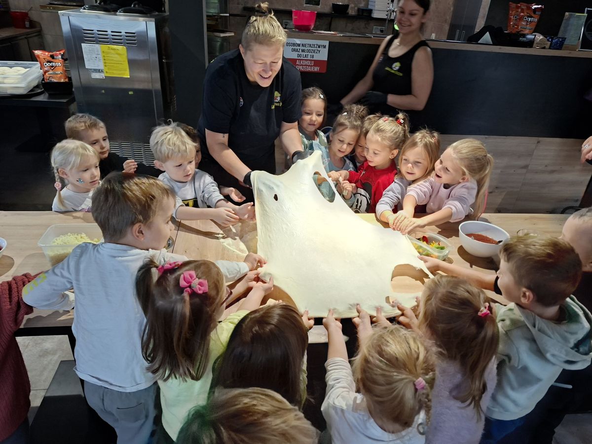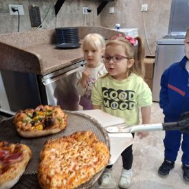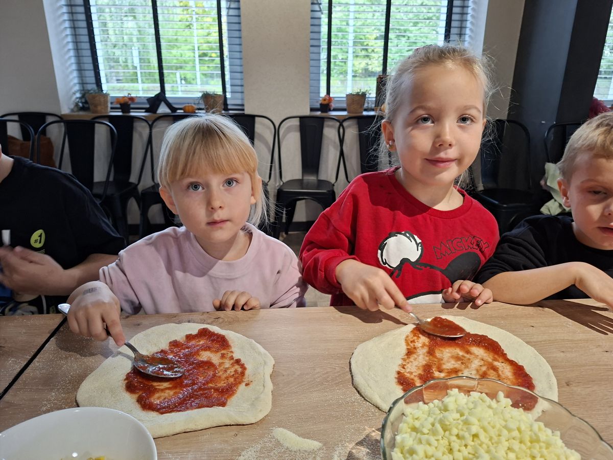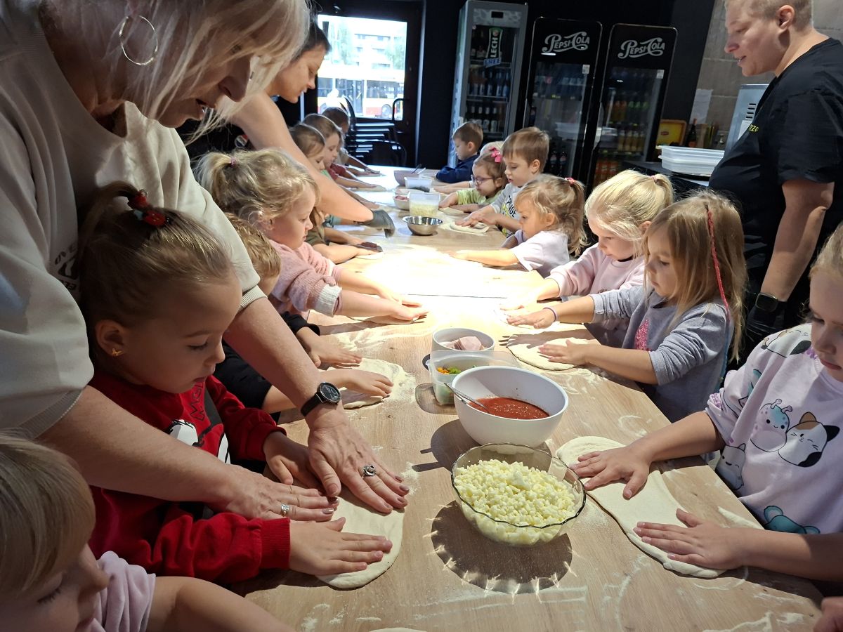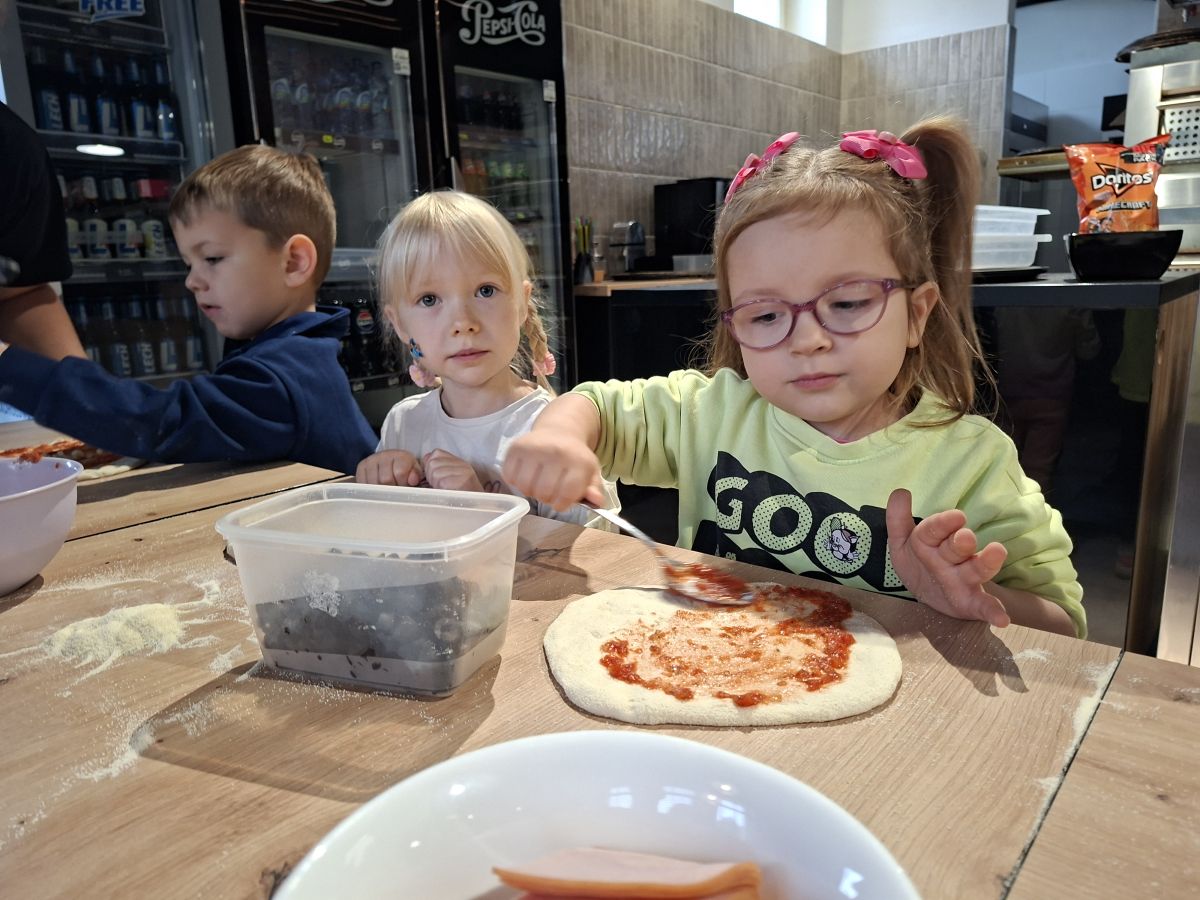Dziś grupa Jeżyki wzięła udział w wyjątkowych warsztatach kulinarnych, podczas których dzieci samodzielnie przygotowywały pizzę. Na początku zajęć uczestnicy poznali składniki potrzebne do przygotowania ciasta – mąkę, drożdże, wodę, oliwę oraz sól. Następnie, zgodnie z instrukcją prowadzącego, wyrabiały własne ciasto, ucząc się przy tym cierpliwości i dokładności. Kiedy ciasto było gotowe, dzieci mogły wybrać swoje ulubione dodatki – sos pomidorowy, ser, szynkę, kukurydzę, pomidory, oliwki czy pieczarki. Każdy mały kucharz stworzył swoją unikalną pizzę według własnego pomysłu. Z ogromnym zainteresowaniem obserwowaliśmy proces wypieku w piecu, a zapach świeżej pizzy wypełnił całą salę. Po chwili nadszedł najbardziej wyczekiwany moment – degustacja! Wszystkie pizze smakowały wyśmienicie, a dzieci z dumą częstowały się swoimi wypiekami. Na zakończenie każdy uczestnik otrzymał dyplom „Małego Kucharza”, potwierdzający zdobyte umiejętności i zaangażowanie w warsztaty. To był dzień pełen radości, wspólnej zabawy i kulinarnych przygód!