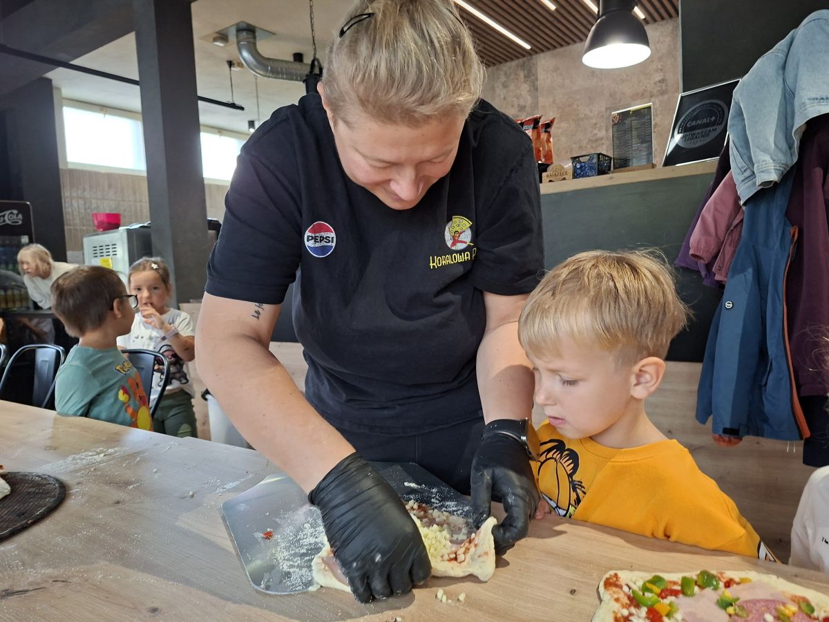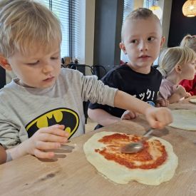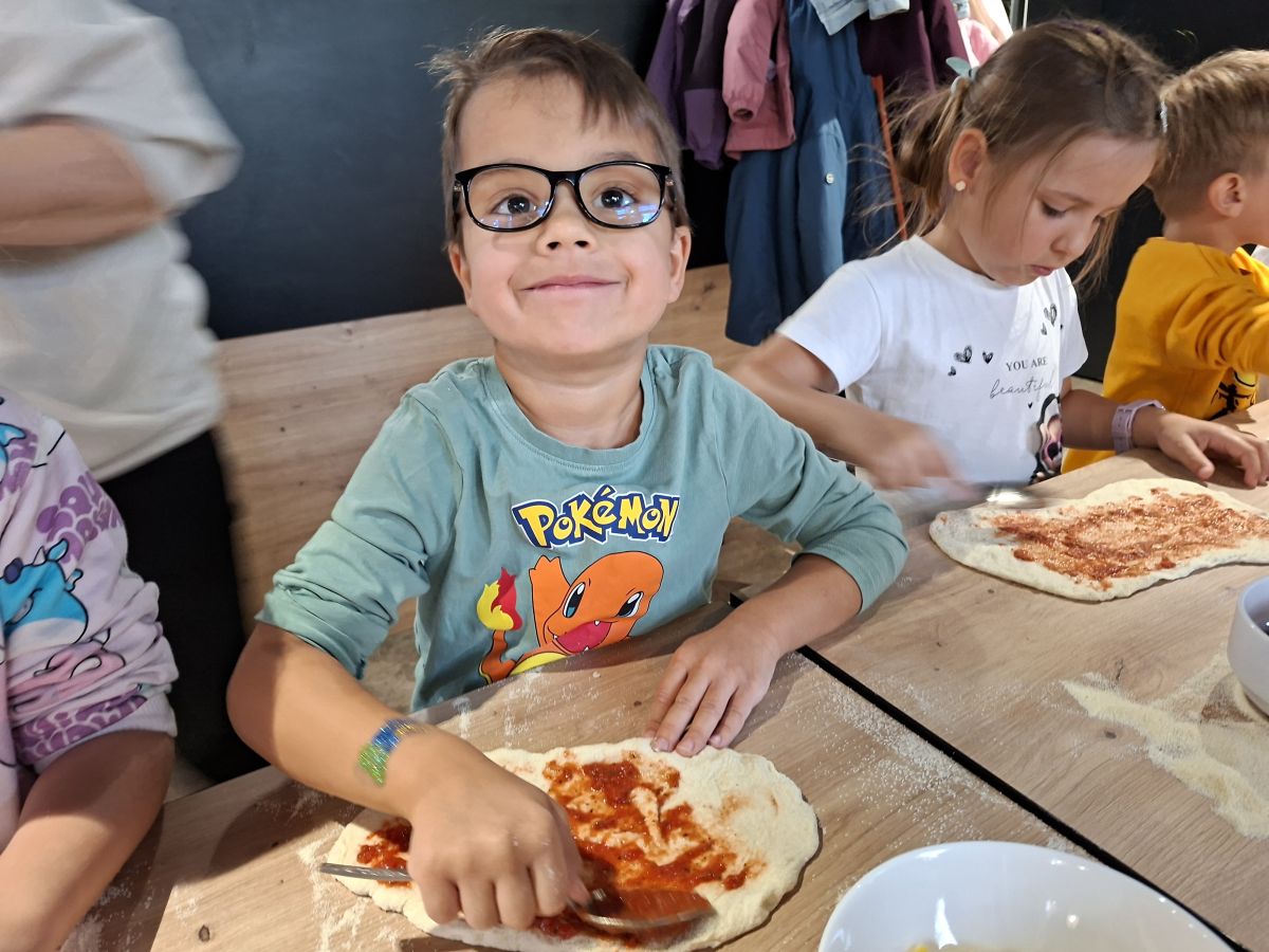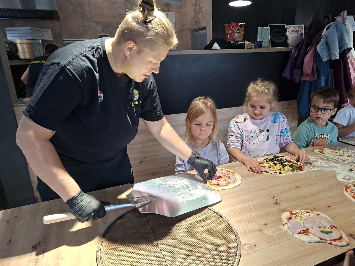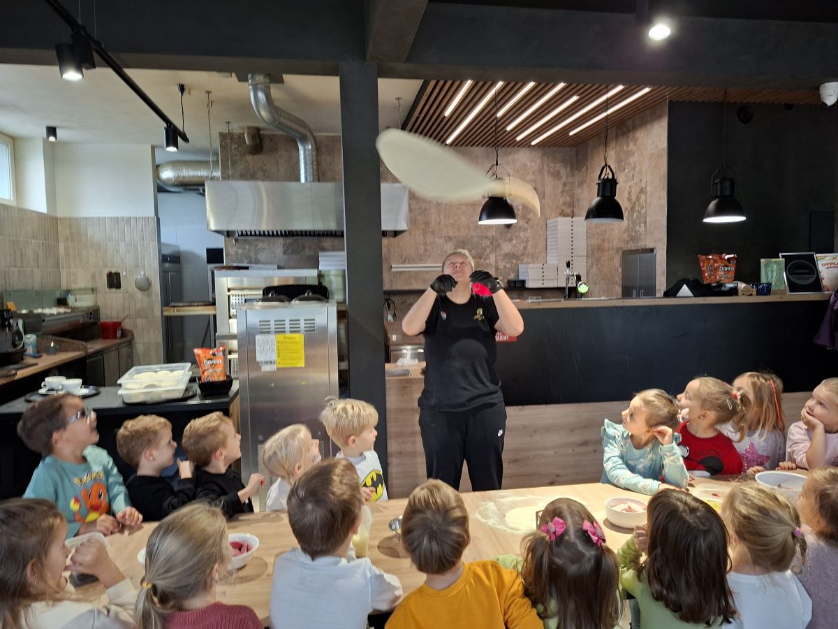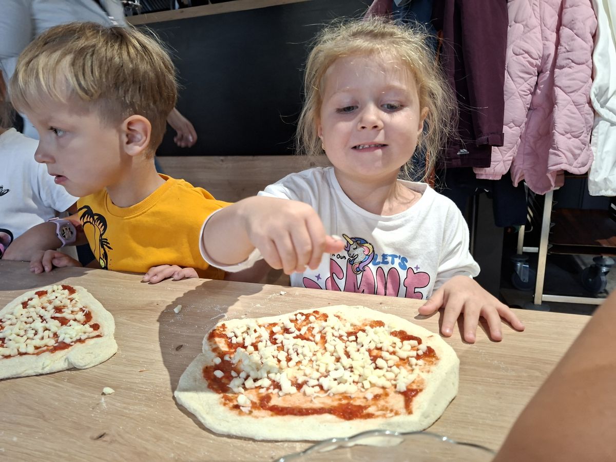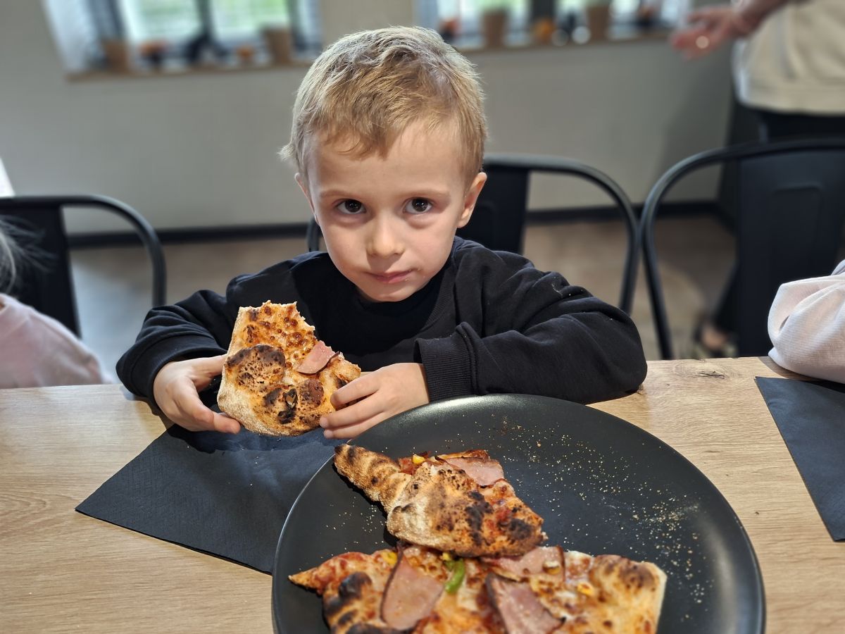 Dziś grupa Jeżyki wzięła udział w wyjątkowych warsztatach kulinarnych, podczas których dzieci samodzielnie przygotowywały pizzę. Na początku zajęć uczestnicy poznali składniki potrzebne do przygotowania ciasta – mąkę, drożdże, wodę, oliwę oraz sól. Następnie, zgodnie z instrukcją prowadzącego, wyrabiały własne ciasto, ucząc się przy tym cierpliwości i dokładności. Kiedy ciasto było gotowe, dzieci mogły wybrać swoje ulubione dodatki – sos pomidorowy, ser, szynkę, kukurydzę, pomidory, oliwki czy pieczarki. Każdy mały kucharz stworzył swoją unikalną pizzę według własnego pomysłu. Z ogromnym zainteresowaniem obserwowaliśmy proces wypieku w piecu, a zapach świeżej pizzy wypełnił całą salę. Po chwili nadszedł najbardziej wyczekiwany moment – degustacja! Wszystkie pizze smakowały wyśmienicie, a dzieci z dumą częstowały się swoimi wypiekami. Na zakończenie każdy uczestnik otrzymał dyplom „Małego Kucharza”, potwierdzający zdobyte umiejętności i zaangażowanie w warsztaty. To był dzień pełen radości, wspólnej zabawy i kulinarnych przygód!