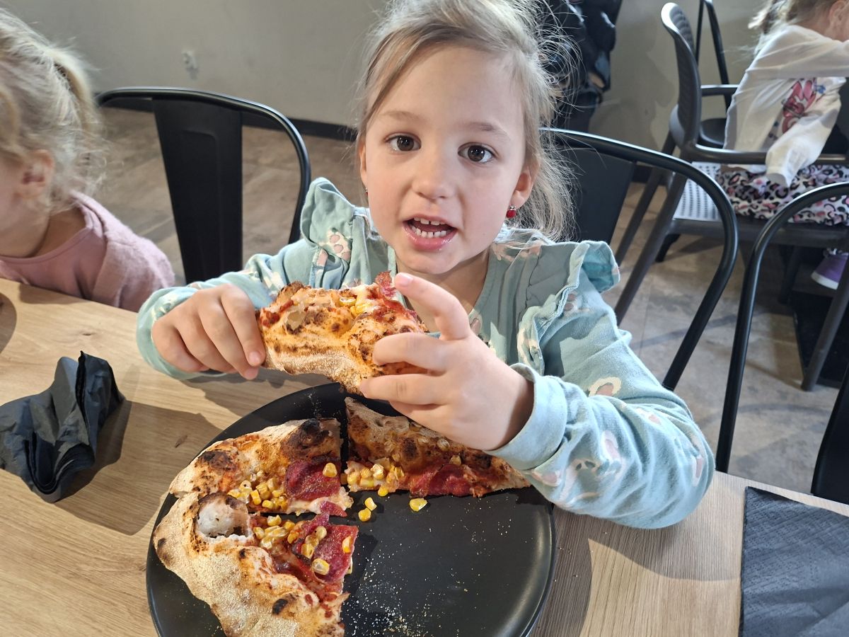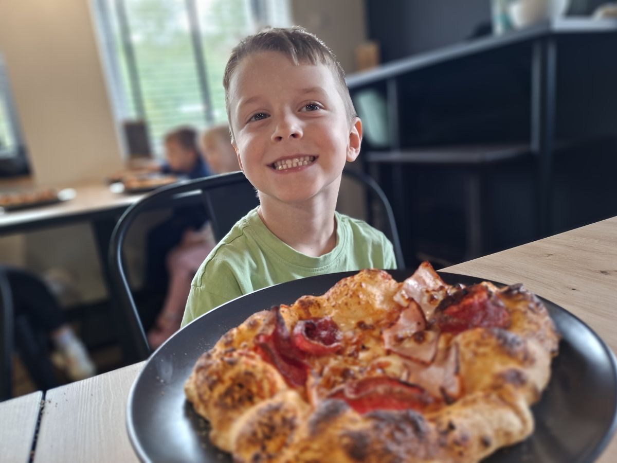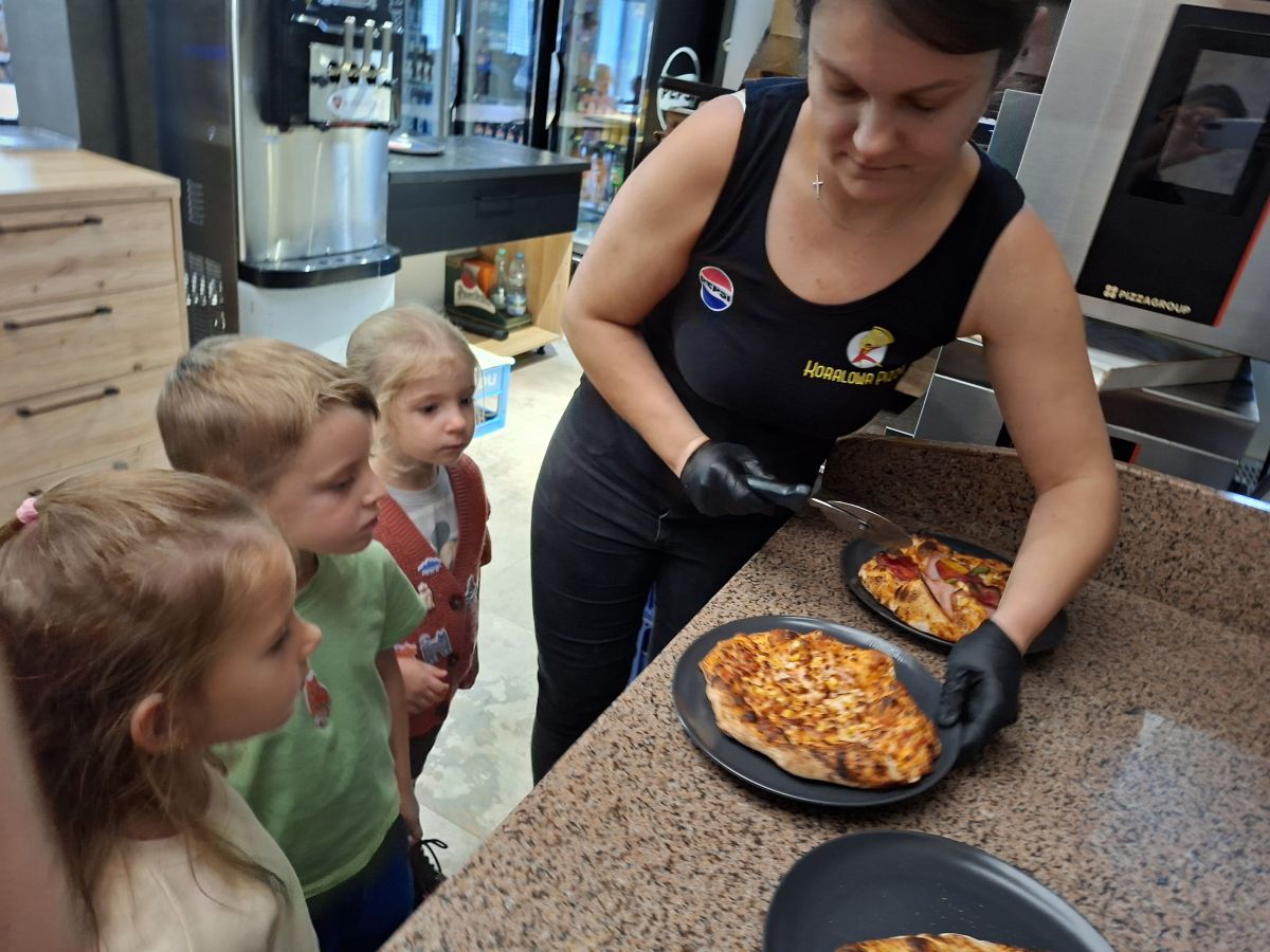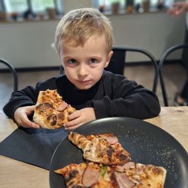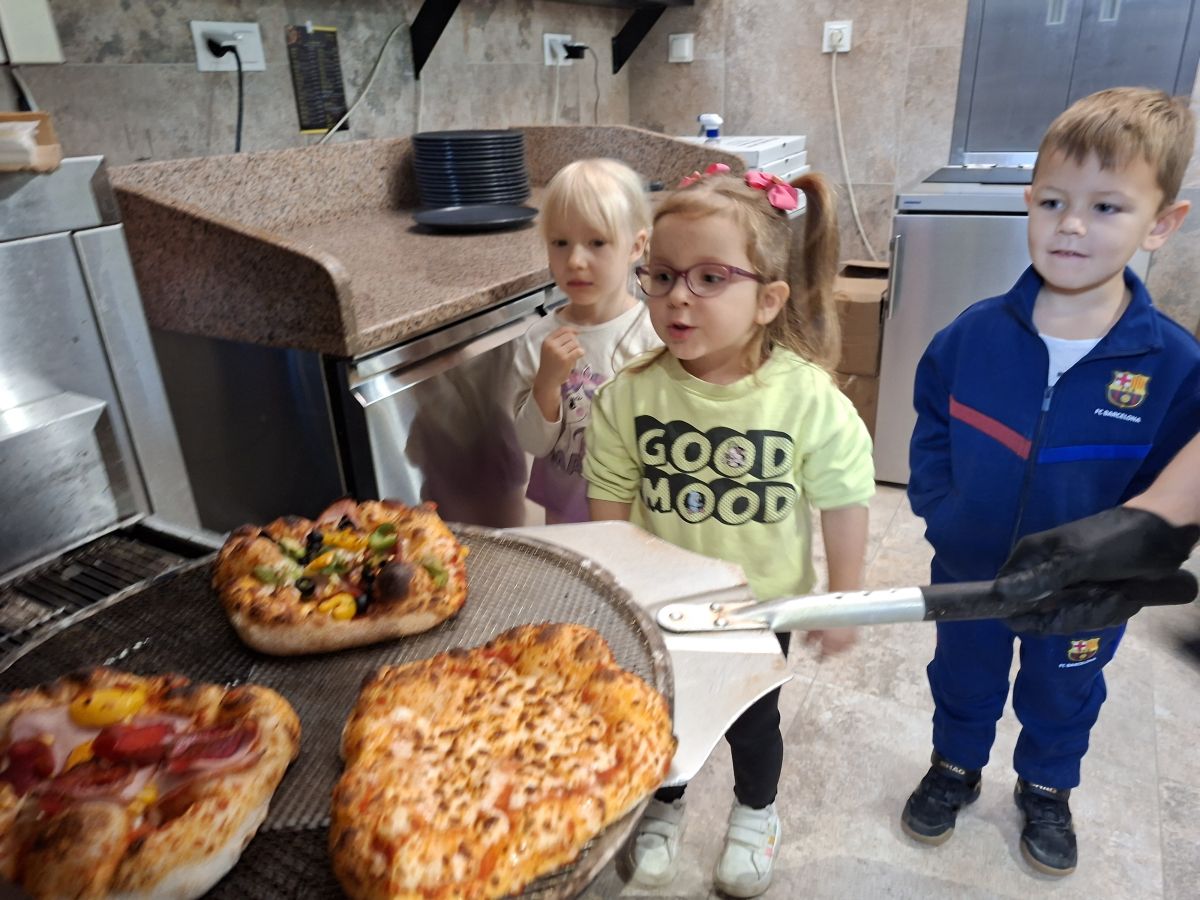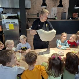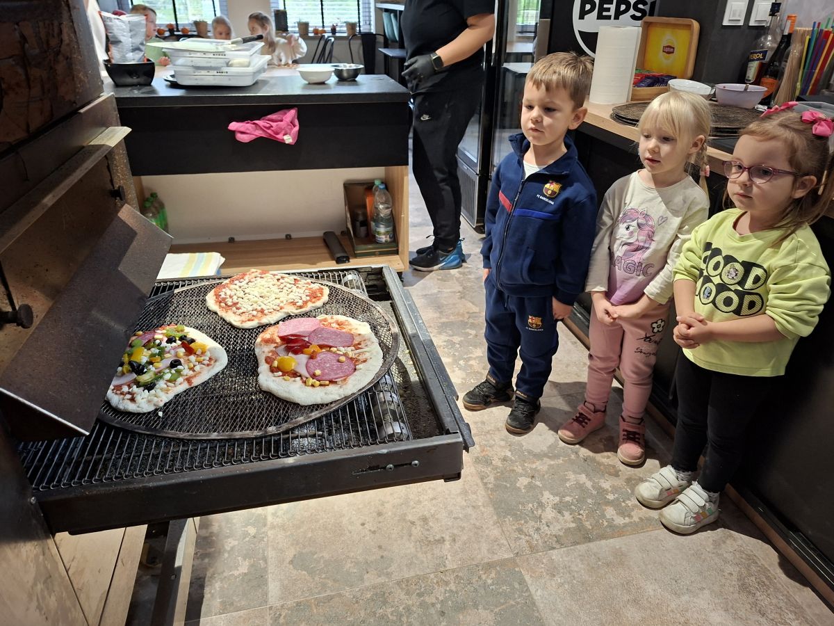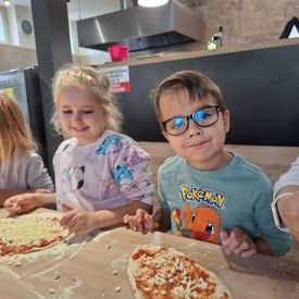 Dziś grupa Jeżyki wzięła udział w wyjątkowych warsztatach kulinarnych, podczas których dzieci samodzielnie przygotowywały pizzę. Na początku zajęć uczestnicy poznali składniki potrzebne do przygotowania ciasta – mąkę, drożdże, wodę, oliwę oraz sól. Następnie, zgodnie z instrukcją prowadzącego, wyrabiały własne ciasto, ucząc się przy tym cierpliwości i dokładności. Kiedy ciasto było gotowe, dzieci mogły wybrać swoje ulubione dodatki – sos pomidorowy, ser, szynkę, kukurydzę, pomidory, oliwki czy pieczarki. Każdy mały kucharz stworzył swoją unikalną pizzę według własnego pomysłu. Z ogromnym zainteresowaniem obserwowaliśmy proces wypieku w piecu, a zapach świeżej pizzy wypełnił całą salę. Po chwili nadszedł najbardziej wyczekiwany moment – degustacja! Wszystkie pizze smakowały wyśmienicie, a dzieci z dumą częstowały się swoimi wypiekami. Na zakończenie każdy uczestnik otrzymał dyplom „Małego Kucharza”, potwierdzający zdobyte umiejętności i zaangażowanie w warsztaty. To był dzień pełen radości, wspólnej zabawy i kulinarnych przygód!