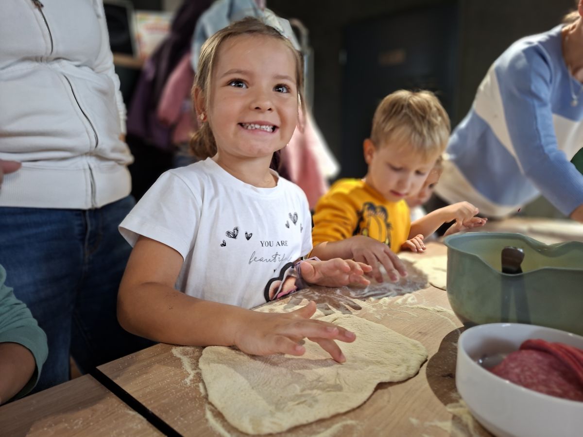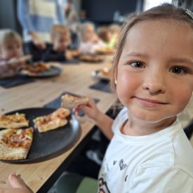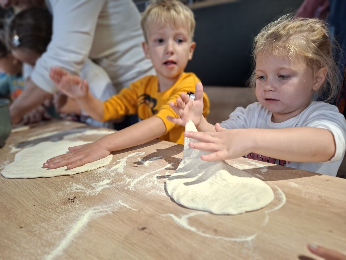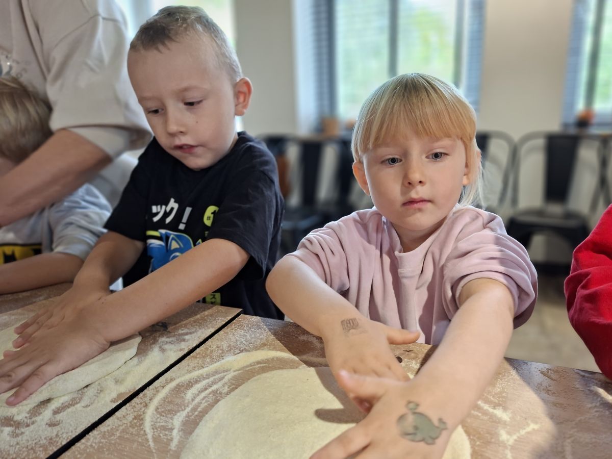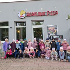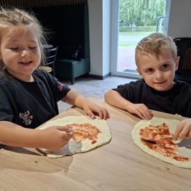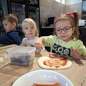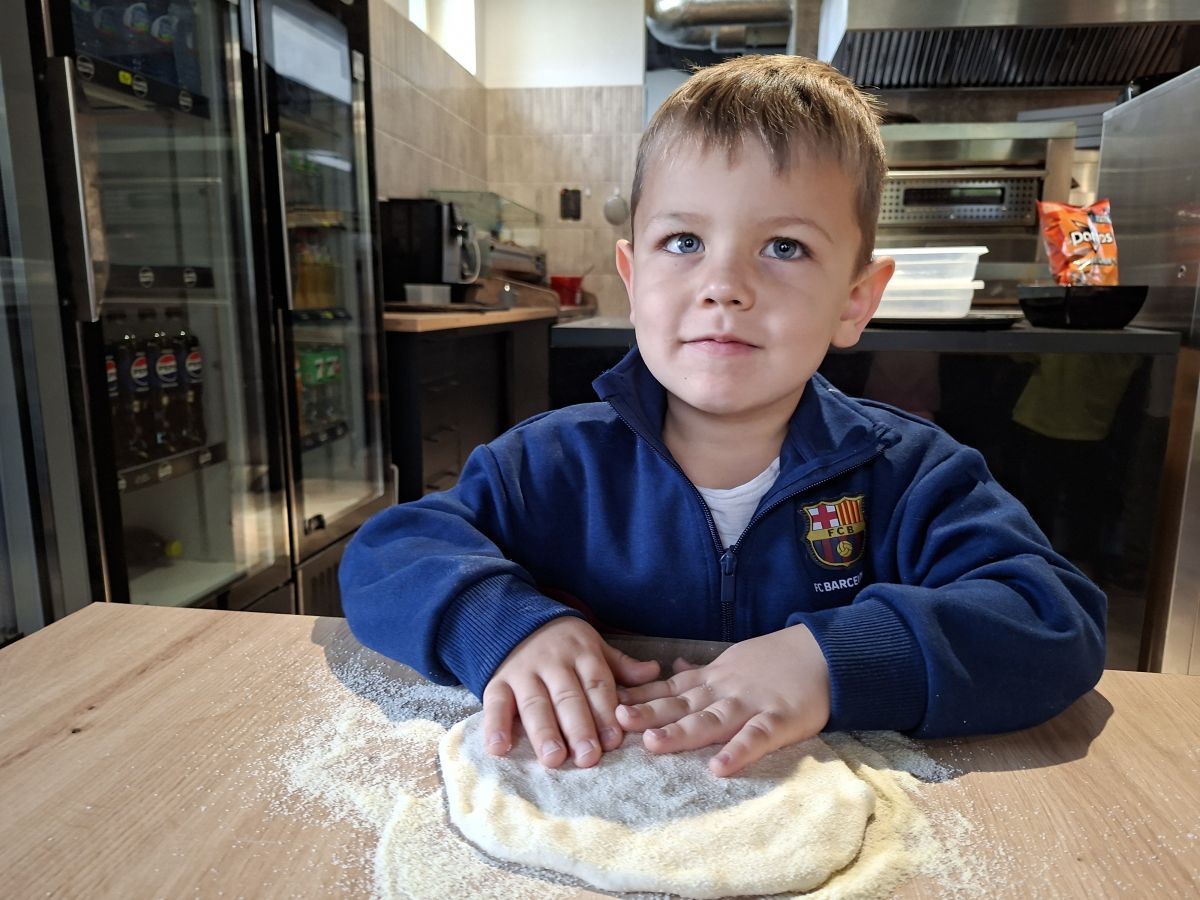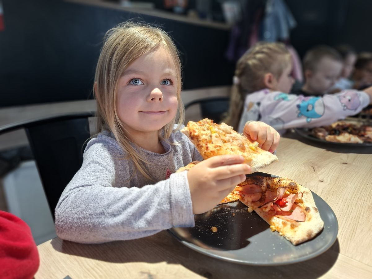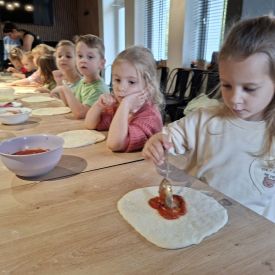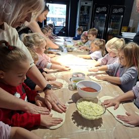 Dziś grupa Jeżyki wzięła udział w wyjątkowych warsztatach kulinarnych, podczas których dzieci samodzielnie przygotowywały pizzę. Na początku zajęć uczestnicy poznali składniki potrzebne do przygotowania ciasta – mąkę, drożdże, wodę, oliwę oraz sól. Następnie, zgodnie z instrukcją prowadzącego, wyrabiały własne ciasto, ucząc się przy tym cierpliwości i dokładności. Kiedy ciasto było gotowe, dzieci mogły wybrać swoje ulubione dodatki – sos pomidorowy, ser, szynkę, kukurydzę, pomidory, oliwki czy pieczarki. Każdy mały kucharz stworzył swoją unikalną pizzę według własnego pomysłu. Z ogromnym zainteresowaniem obserwowaliśmy proces wypieku w piecu, a zapach świeżej pizzy wypełnił całą salę. Po chwili nadszedł najbardziej wyczekiwany moment – degustacja! Wszystkie pizze smakowały wyśmienicie, a dzieci z dumą częstowały się swoimi wypiekami. Na zakończenie każdy uczestnik otrzymał dyplom „Małego Kucharza”, potwierdzający zdobyte umiejętności i zaangażowanie w warsztaty. To był dzień pełen radości, wspólnej zabawy i kulinarnych przygód!