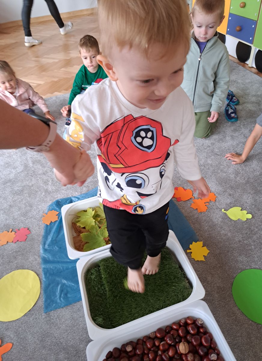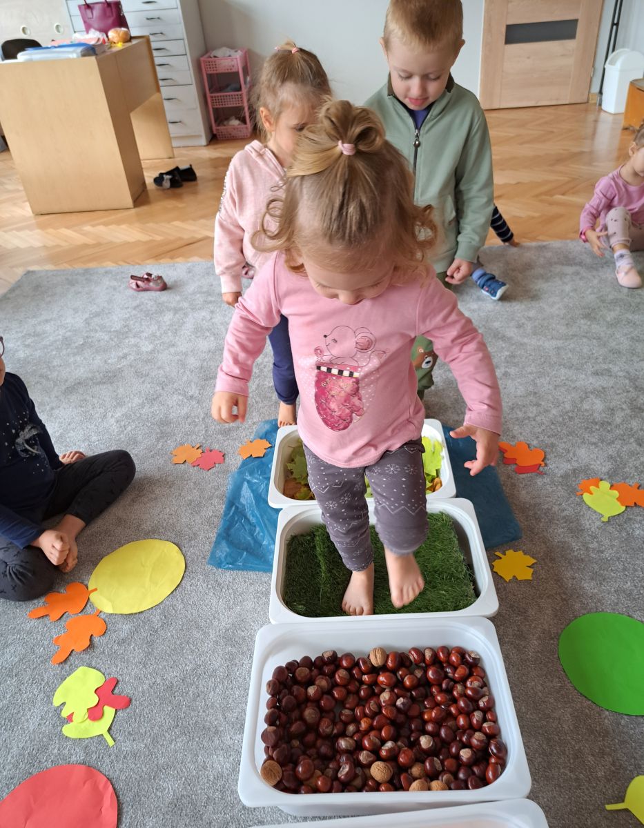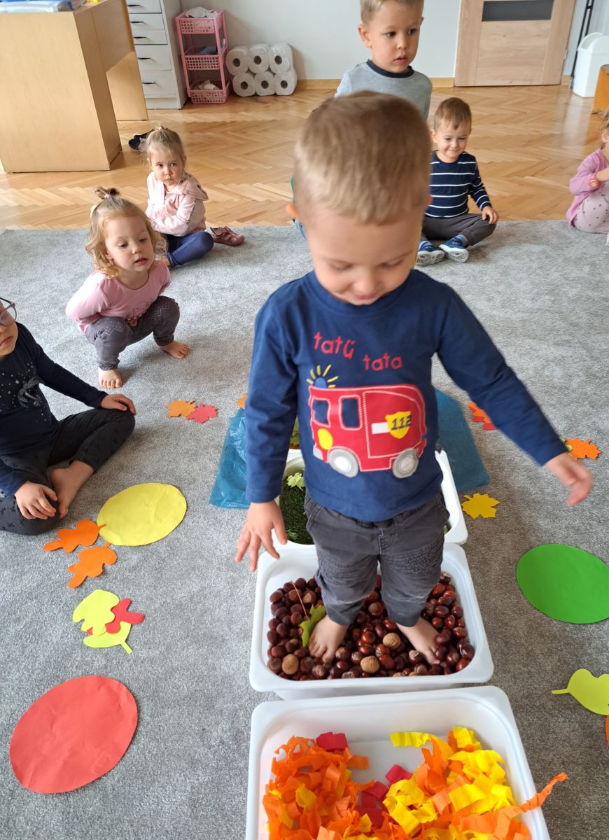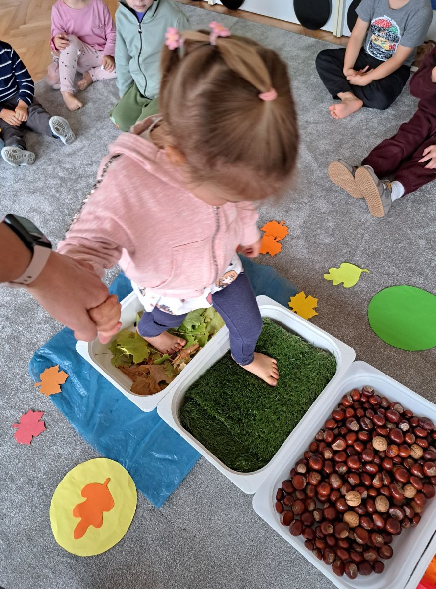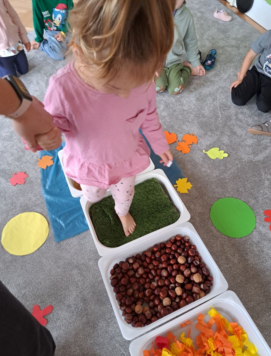 Podczas zajęć sensorycznych dzieci z grupy Kotki przeniosły się w świat jesiennych barw i faktur. Przedszkolaki śpiewały piosenki o tematyce jesieni, przypomniały i utrwaliły kolory charakterystyczne dla tej pory roku, a następnie z radością chodziły po ścieżce sensorycznej przygotowanej z kasztanów, liści, trawy i bibuły w jesiennych kolorach. Różnorodne materiały pozwoliły im doświadczyć wielu wrażeń dotykowych i rozwijać zmysł równowagi oraz koordynację ruchową.
