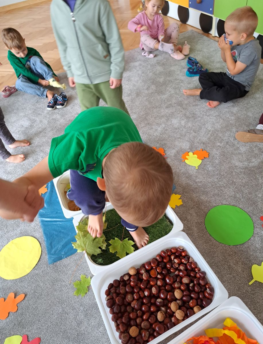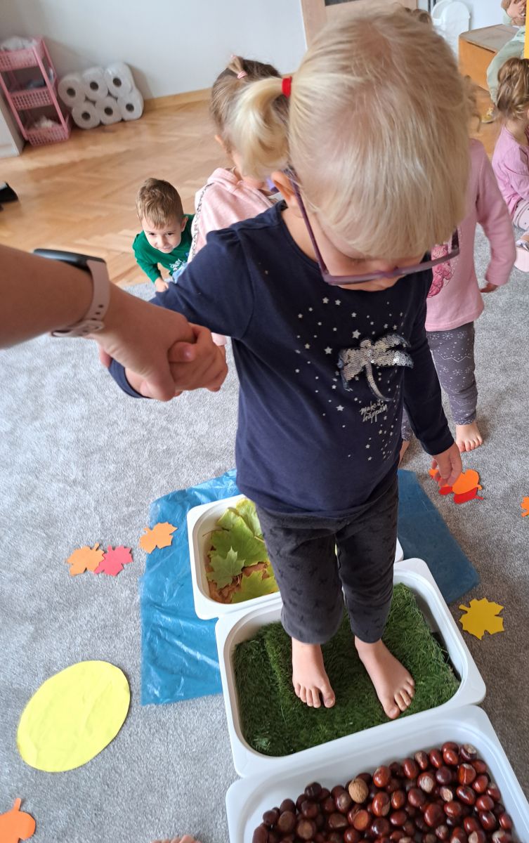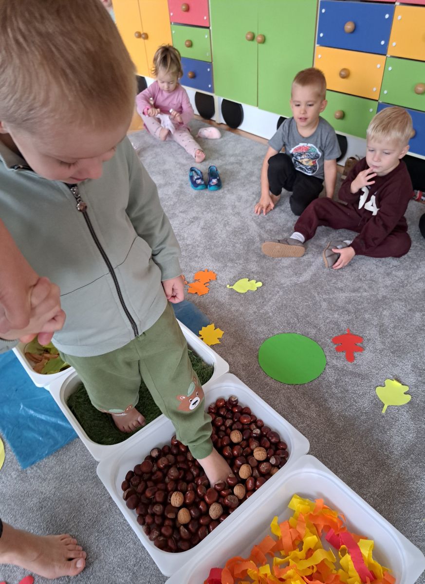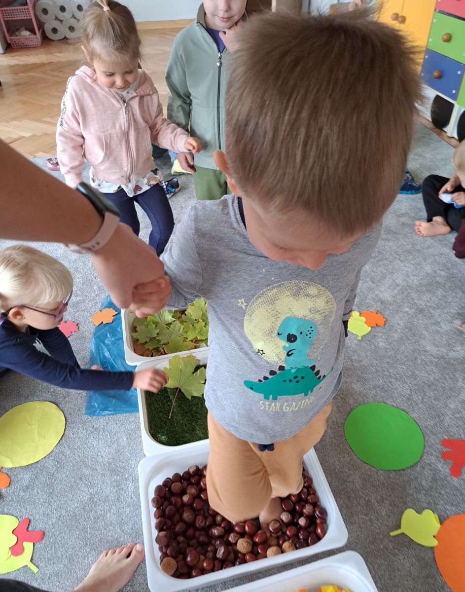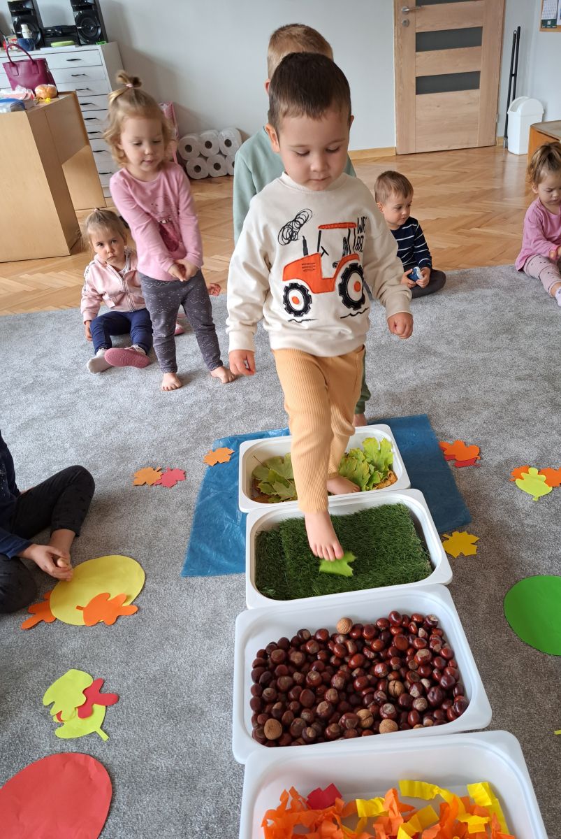 Podczas zajęć sensorycznych dzieci z grupy Kotki przeniosły się w świat jesiennych barw i faktur. Przedszkolaki śpiewały piosenki o tematyce jesieni, przypomniały i utrwaliły kolory charakterystyczne dla tej pory roku, a następnie z radością chodziły po ścieżce sensorycznej przygotowanej z kasztanów, liści, trawy i bibuły w jesiennych kolorach. Różnorodne materiały pozwoliły im doświadczyć wielu wrażeń dotykowych i rozwijać zmysł równowagi oraz koordynację ruchową.