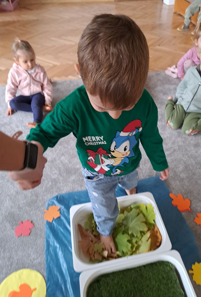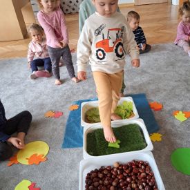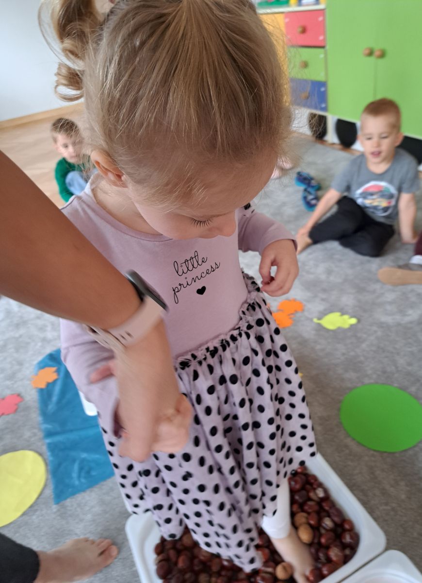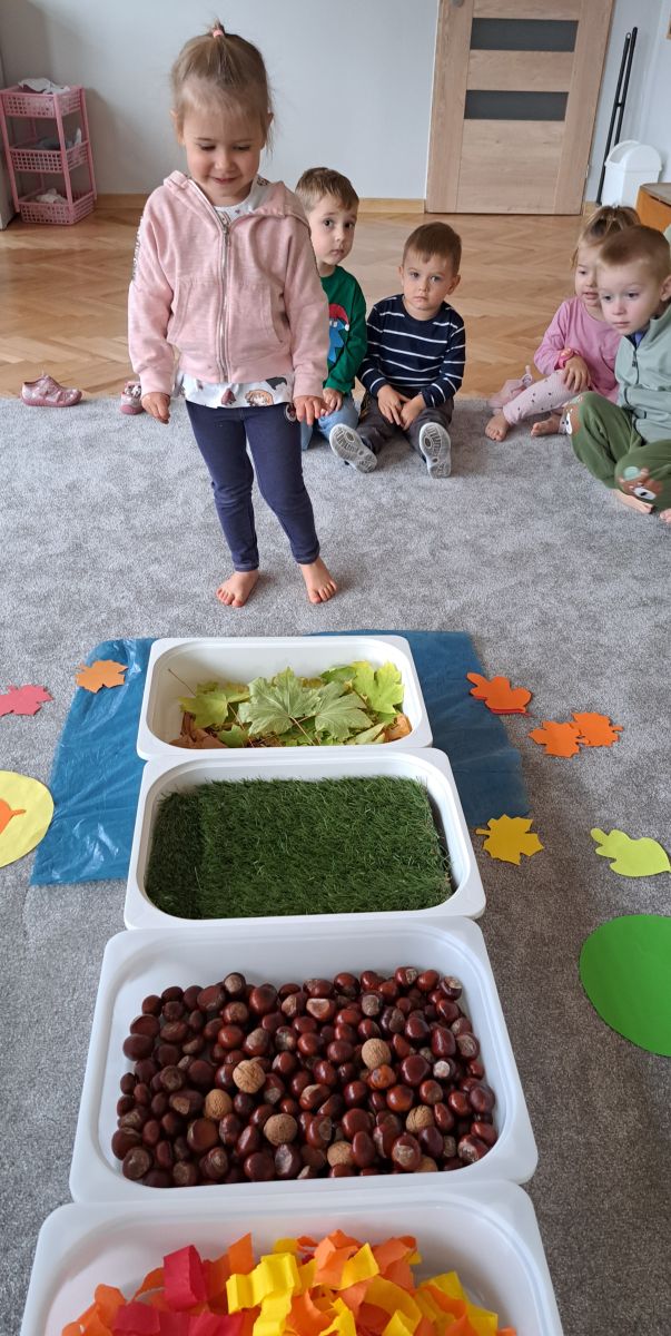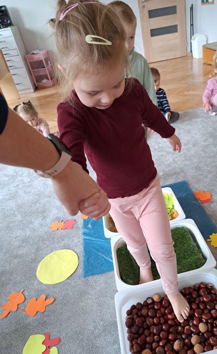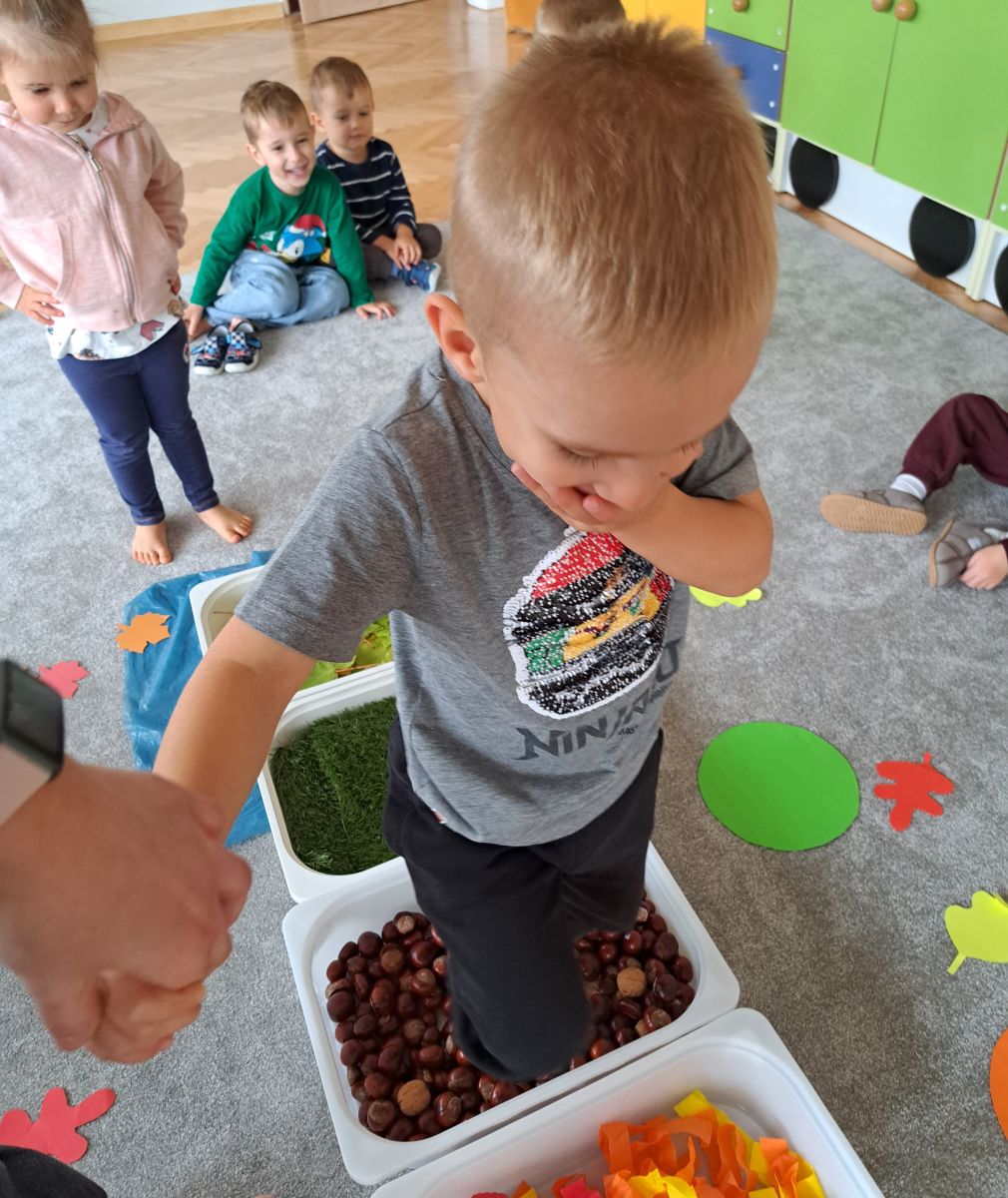 Podczas zajęć sensorycznych dzieci z grupy Kotki przeniosły się w świat jesiennych barw i faktur. Przedszkolaki śpiewały piosenki o tematyce jesieni, przypomniały i utrwaliły kolory charakterystyczne dla tej pory roku, a następnie z radością chodziły po ścieżce sensorycznej przygotowanej z kasztanów, liści, trawy i bibuły w jesiennych kolorach. Różnorodne materiały pozwoliły im doświadczyć wielu wrażeń dotykowych i rozwijać zmysł równowagi oraz koordynację ruchową.