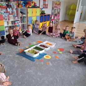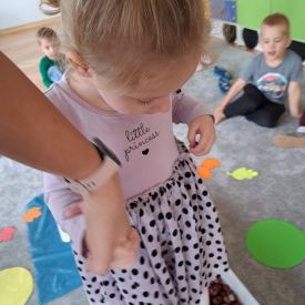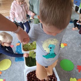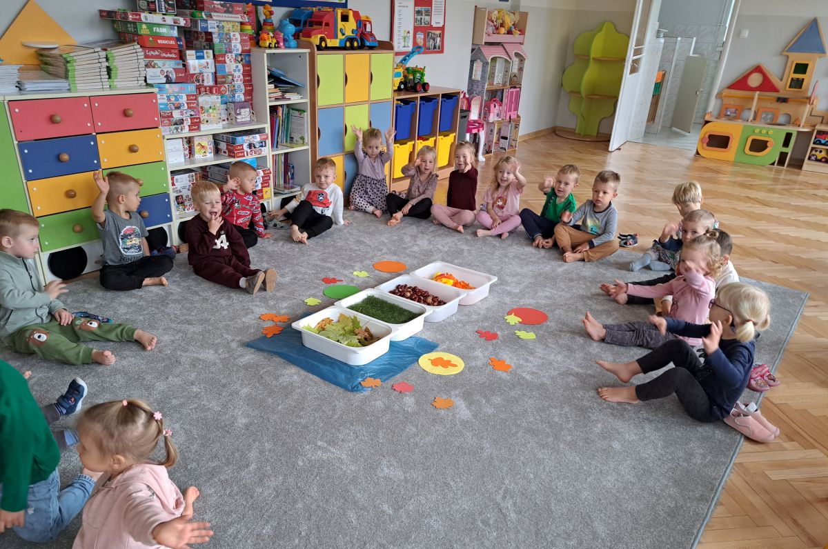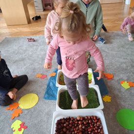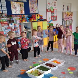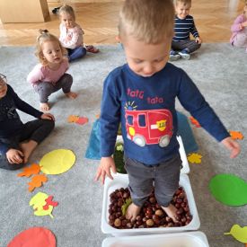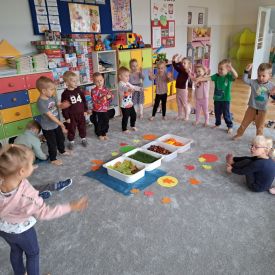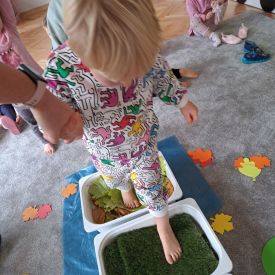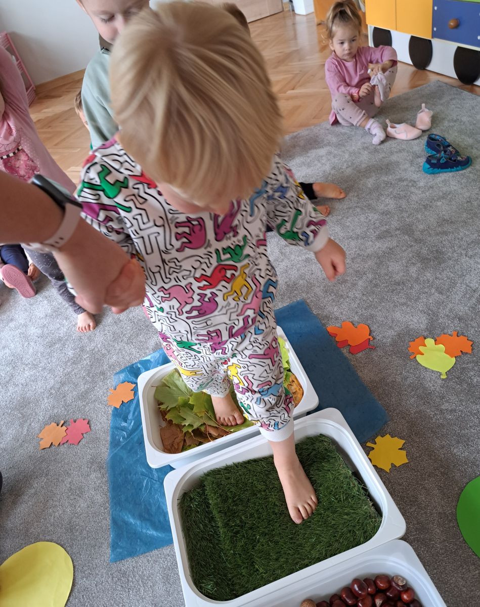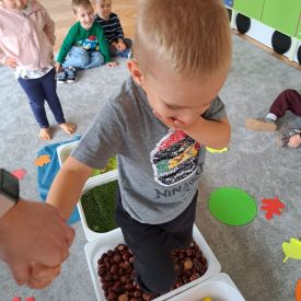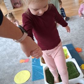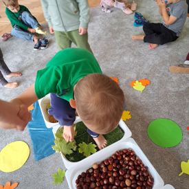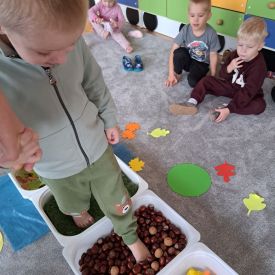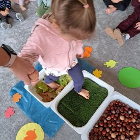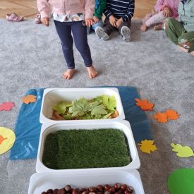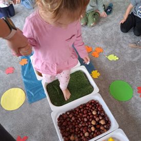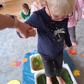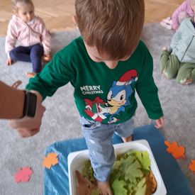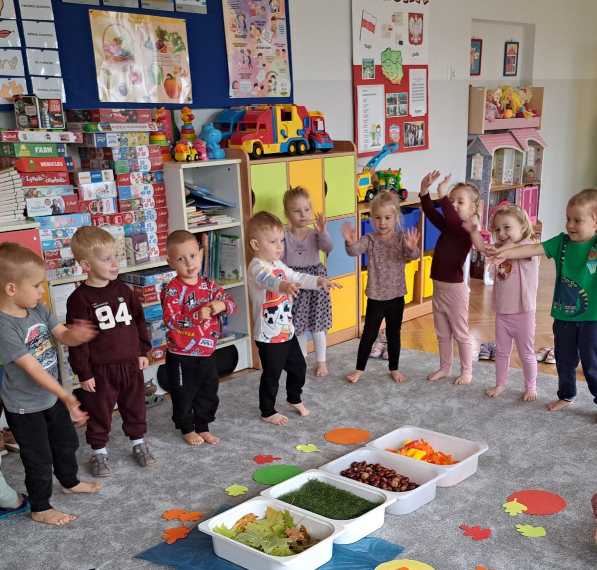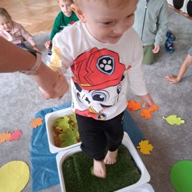 Podczas zajęć sensorycznych dzieci z grupy Kotki przeniosły się w świat jesiennych barw i faktur. Przedszkolaki śpiewały piosenki o tematyce jesieni, przypomniały i utrwaliły kolory charakterystyczne dla tej pory roku, a następnie z radością chodziły po ścieżce sensorycznej przygotowanej z kasztanów, liści, trawy i bibuły w jesiennych kolorach. Różnorodne materiały pozwoliły im doświadczyć wielu wrażeń dotykowych i rozwijać zmysł równowagi oraz koordynację ruchową.