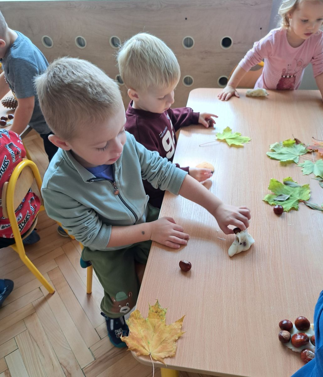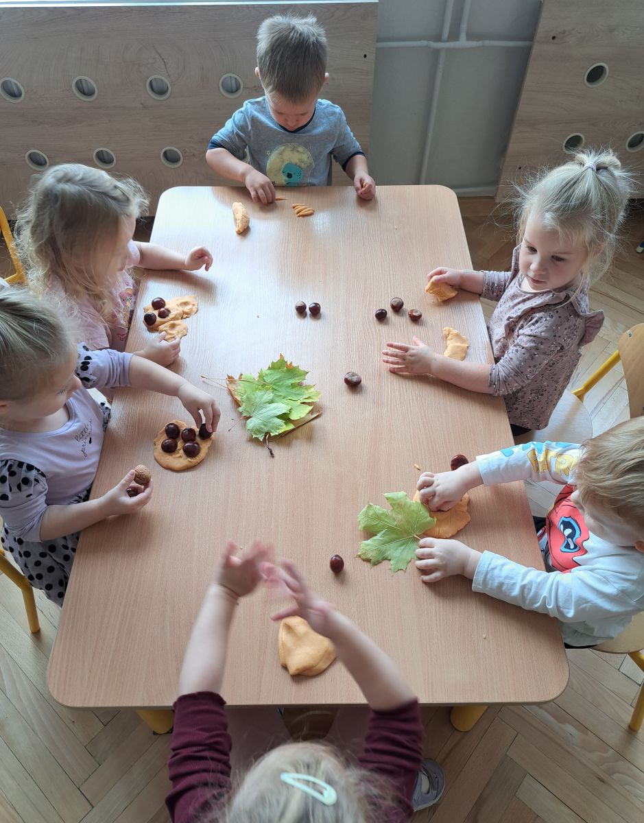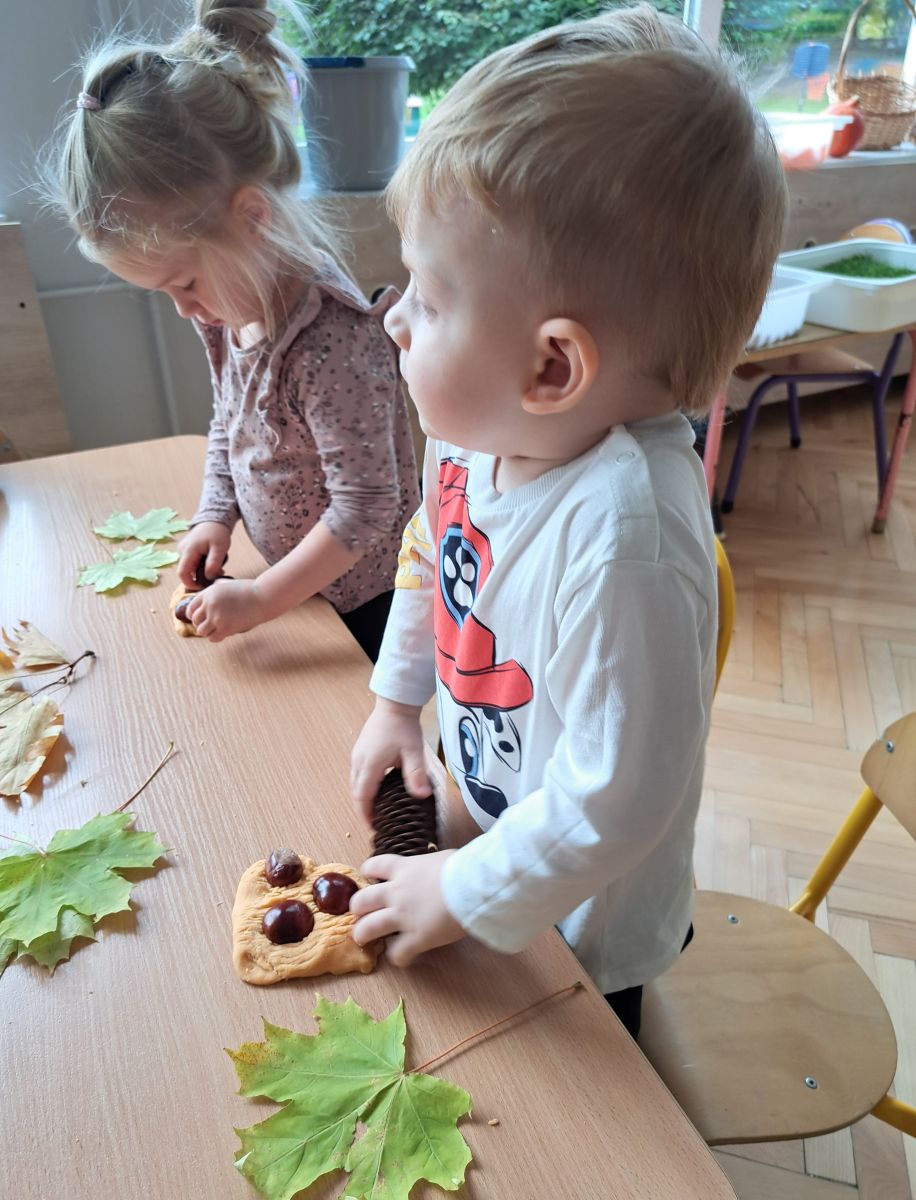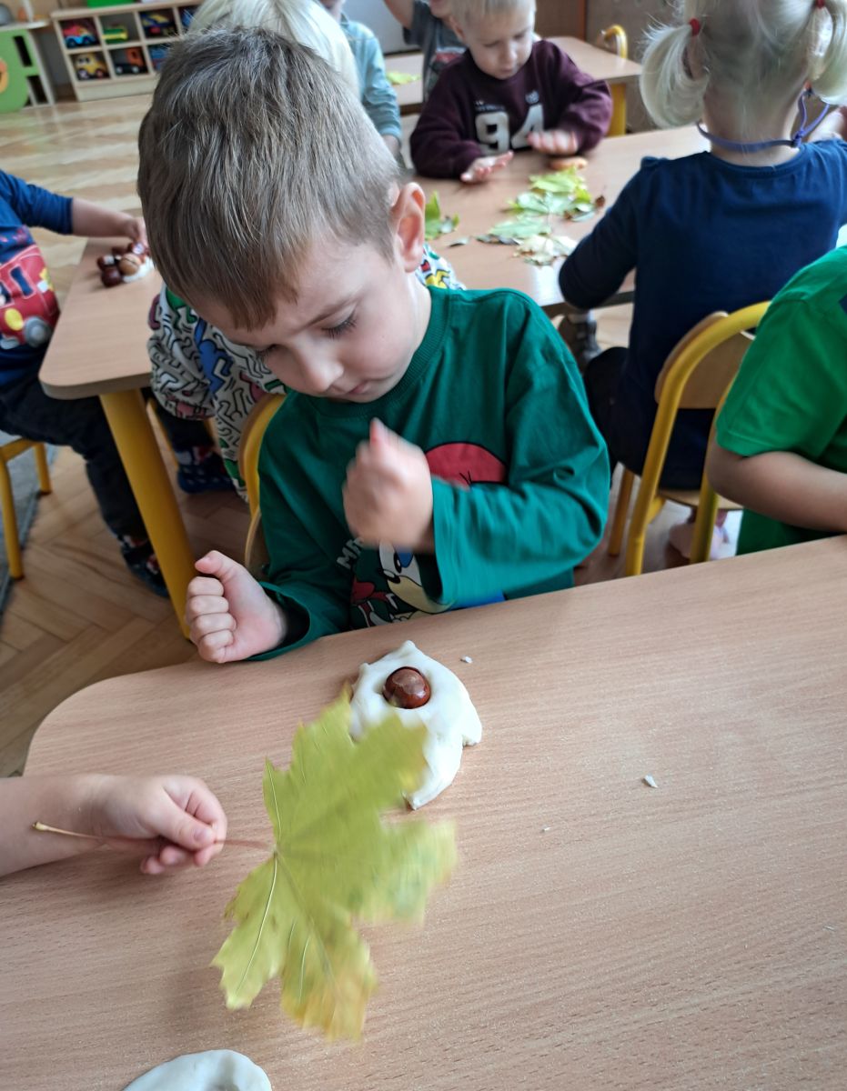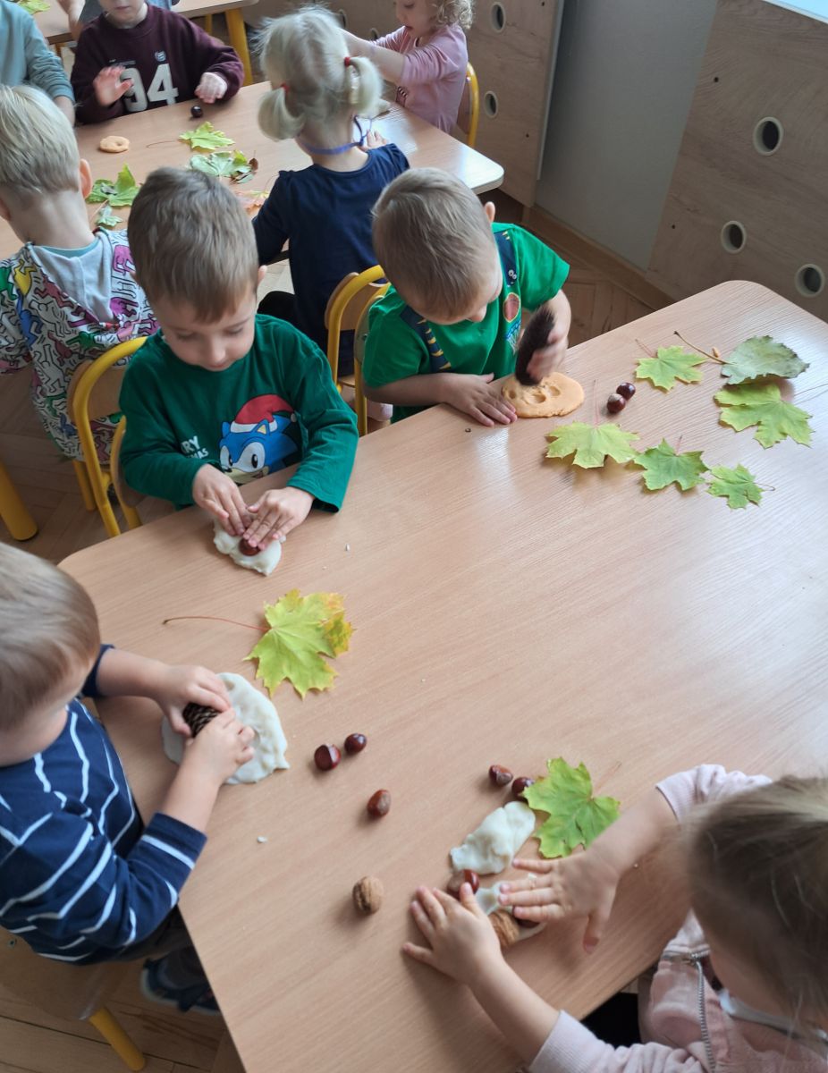 W drugiej części zajęć przedszkolaki bawiły się ciastoliną – odciskały w niej kształty kasztanów, liści, szyszek i orzechów, tworząc własne jesienne kompozycje. Dzięki takim aktywnościom dzieci doskonaliły: