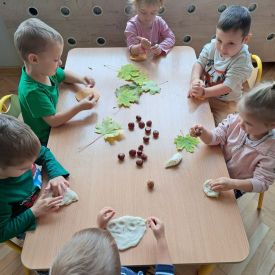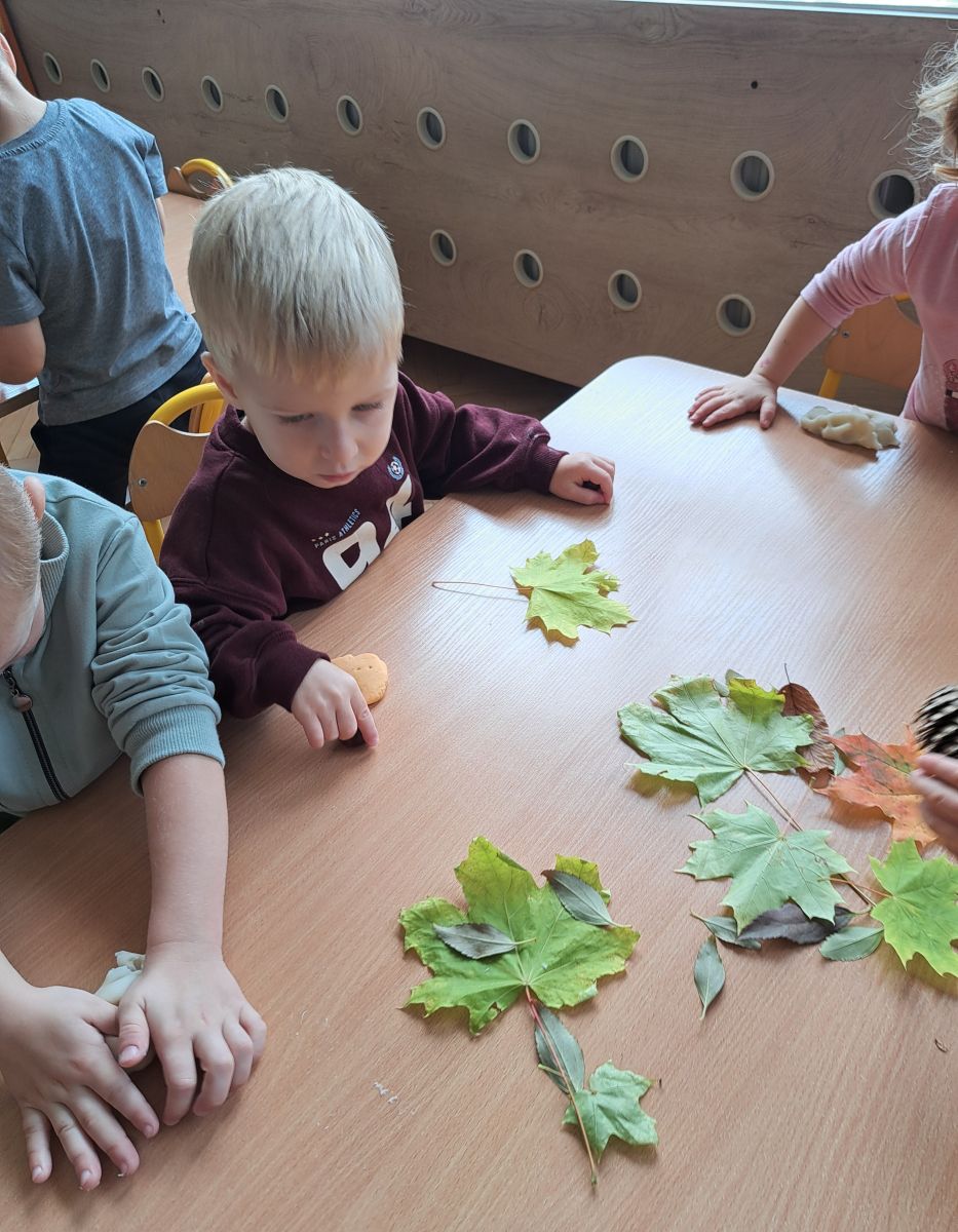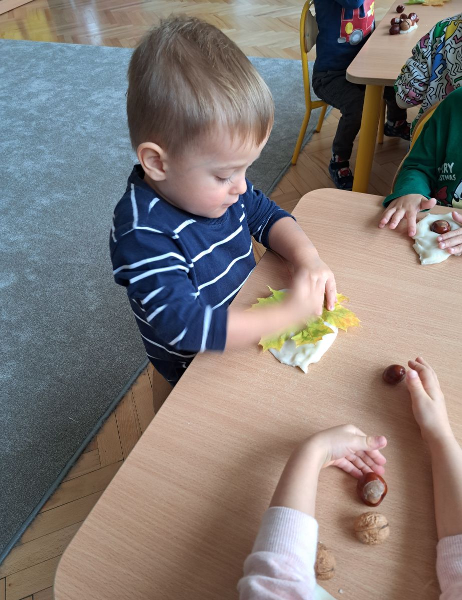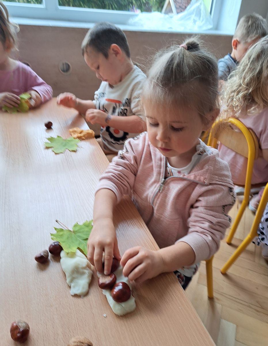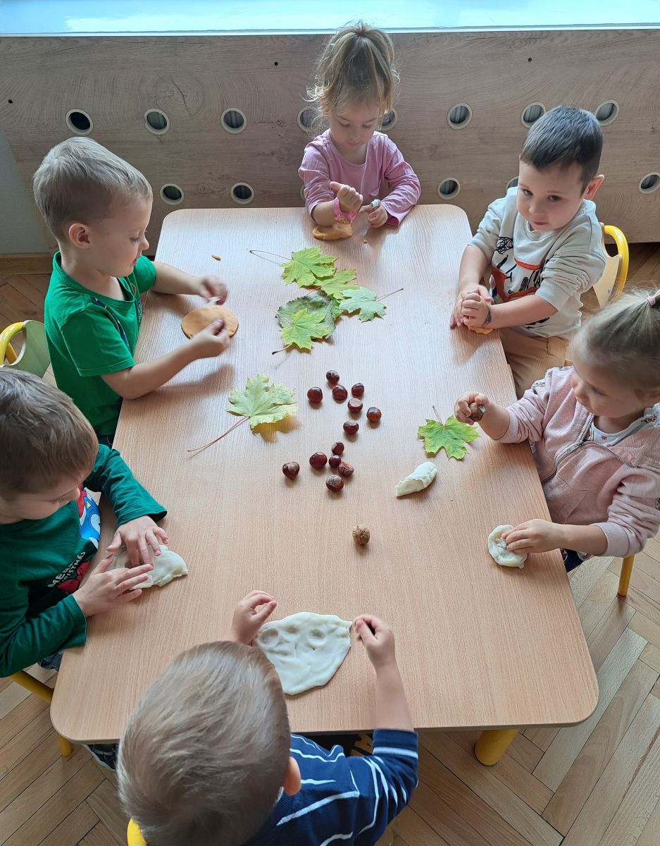 W drugiej części zajęć przedszkolaki bawiły się ciastoliną – odciskały w niej kształty kasztanów, liści, szyszek i orzechów, tworząc własne jesienne kompozycje. Dzięki takim aktywnościom dzieci doskonaliły: