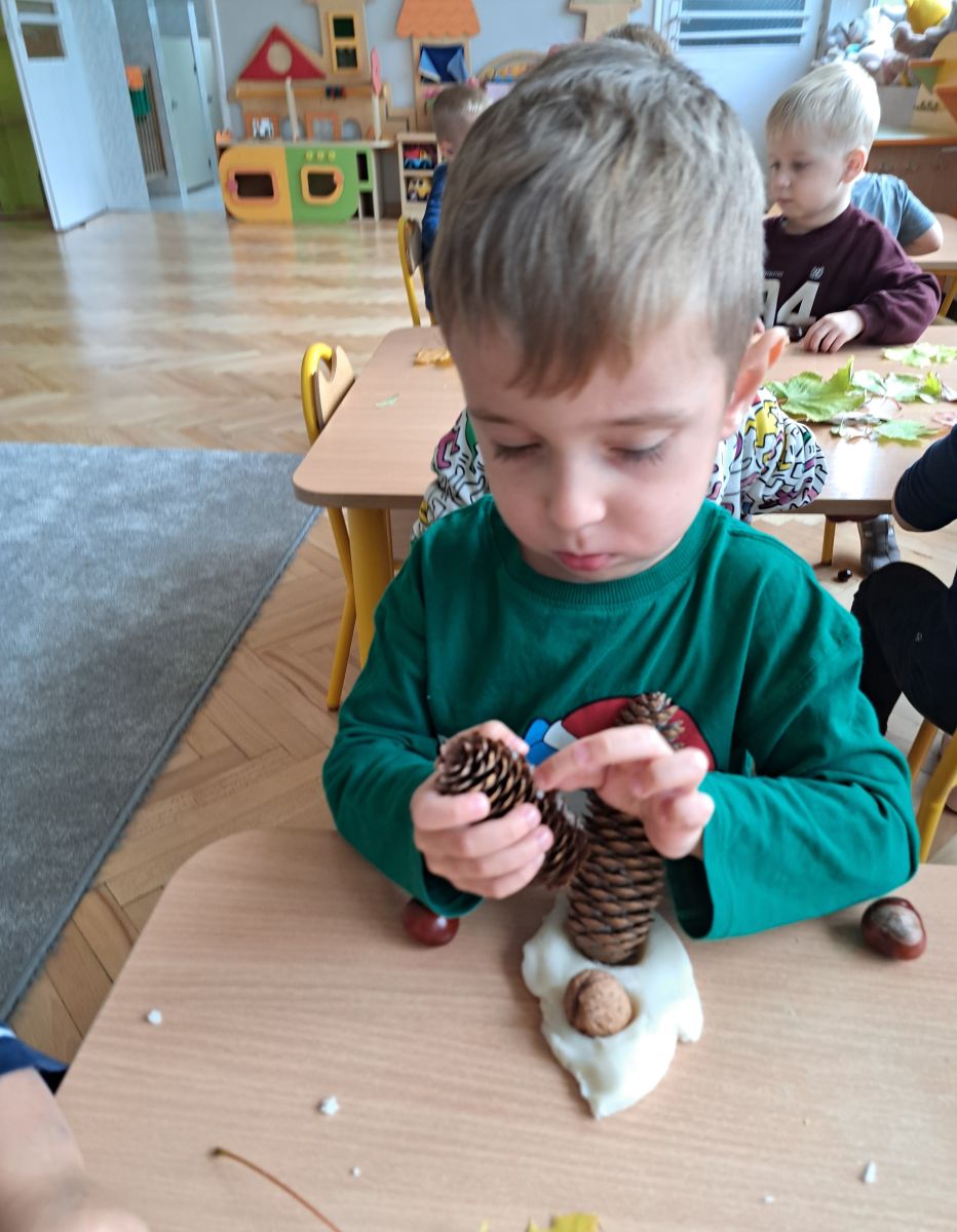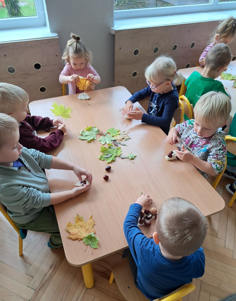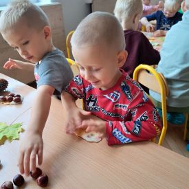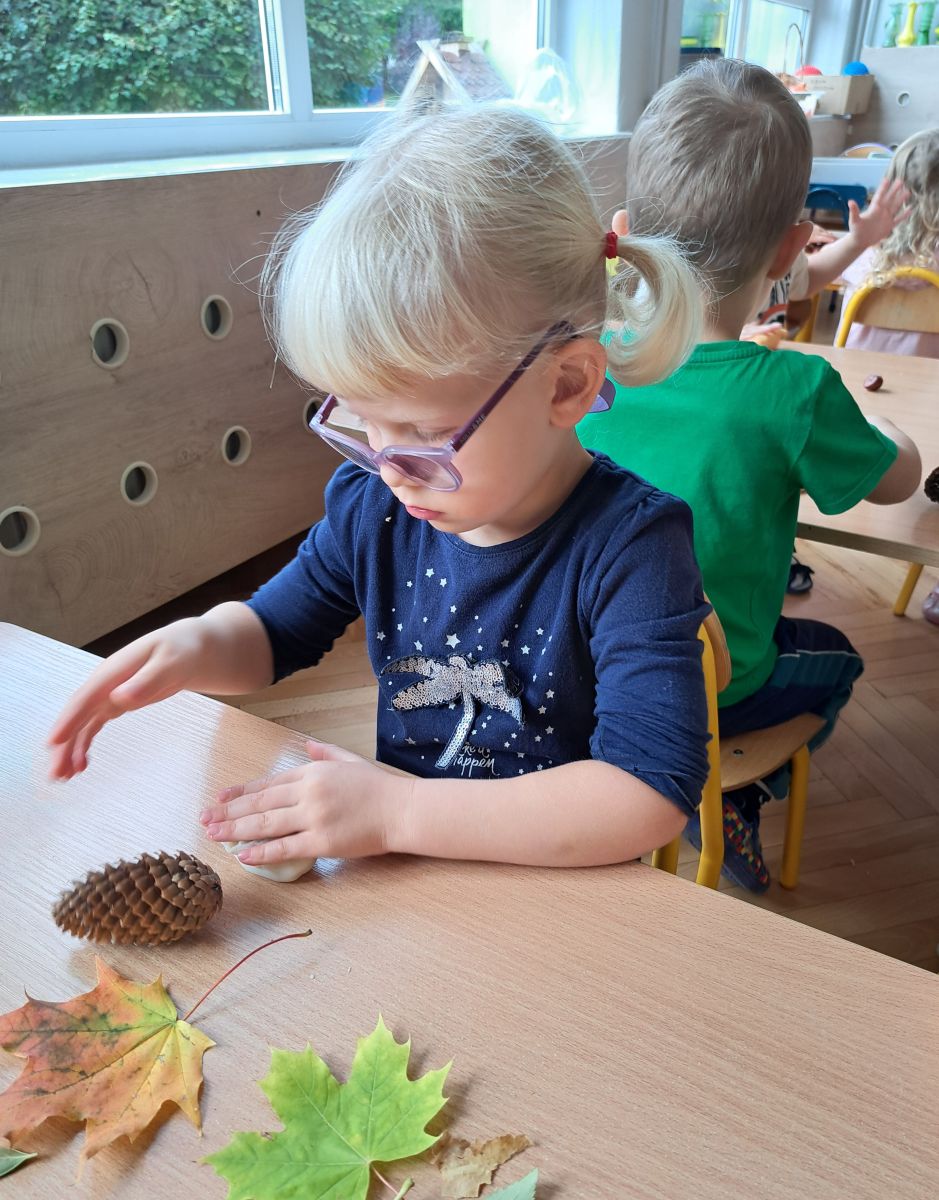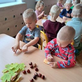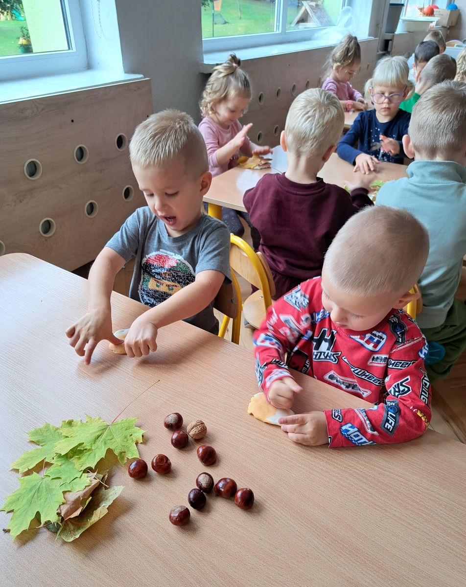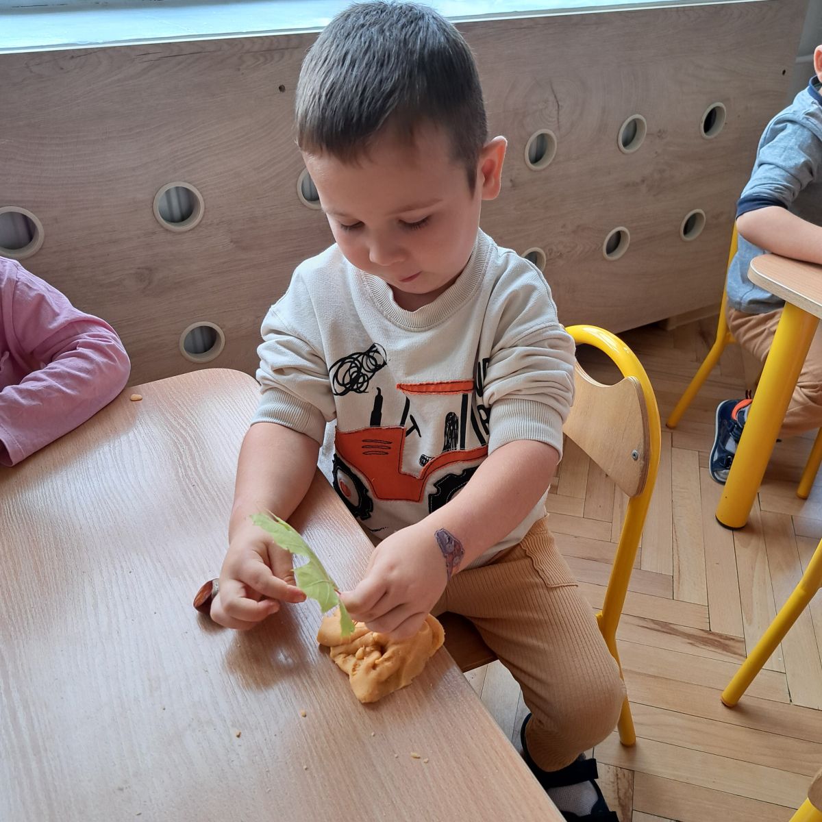 W drugiej części zajęć przedszkolaki bawiły się ciastoliną – odciskały w niej kształty kasztanów, liści, szyszek i orzechów, tworząc własne jesienne kompozycje. Dzięki takim aktywnościom dzieci doskonaliły: