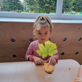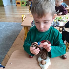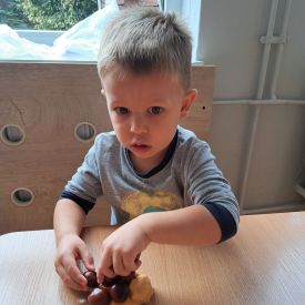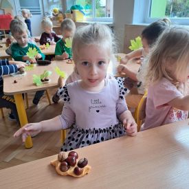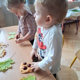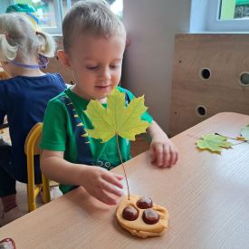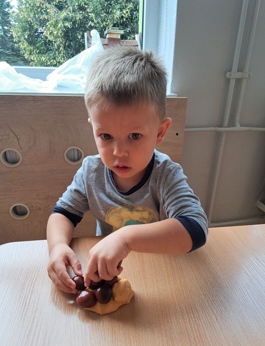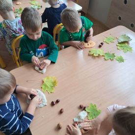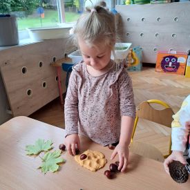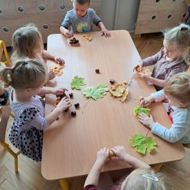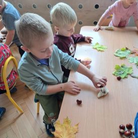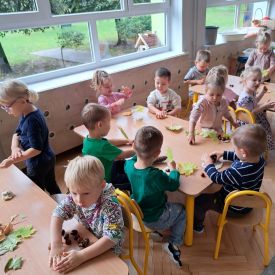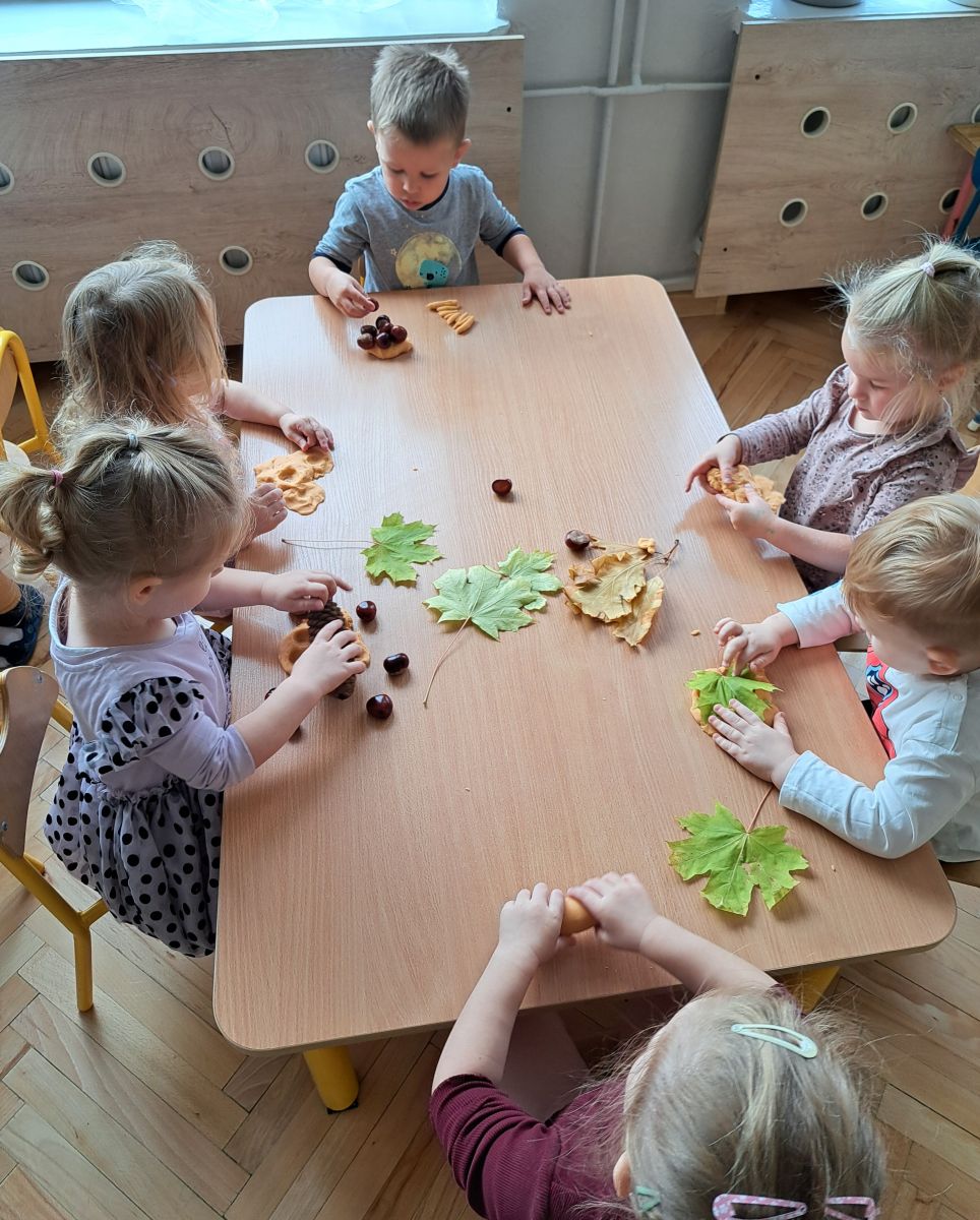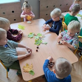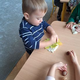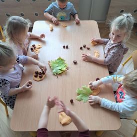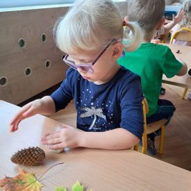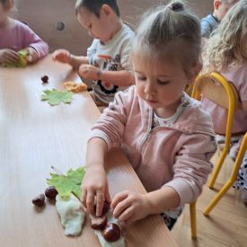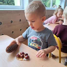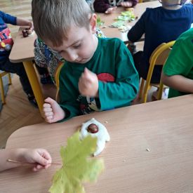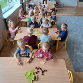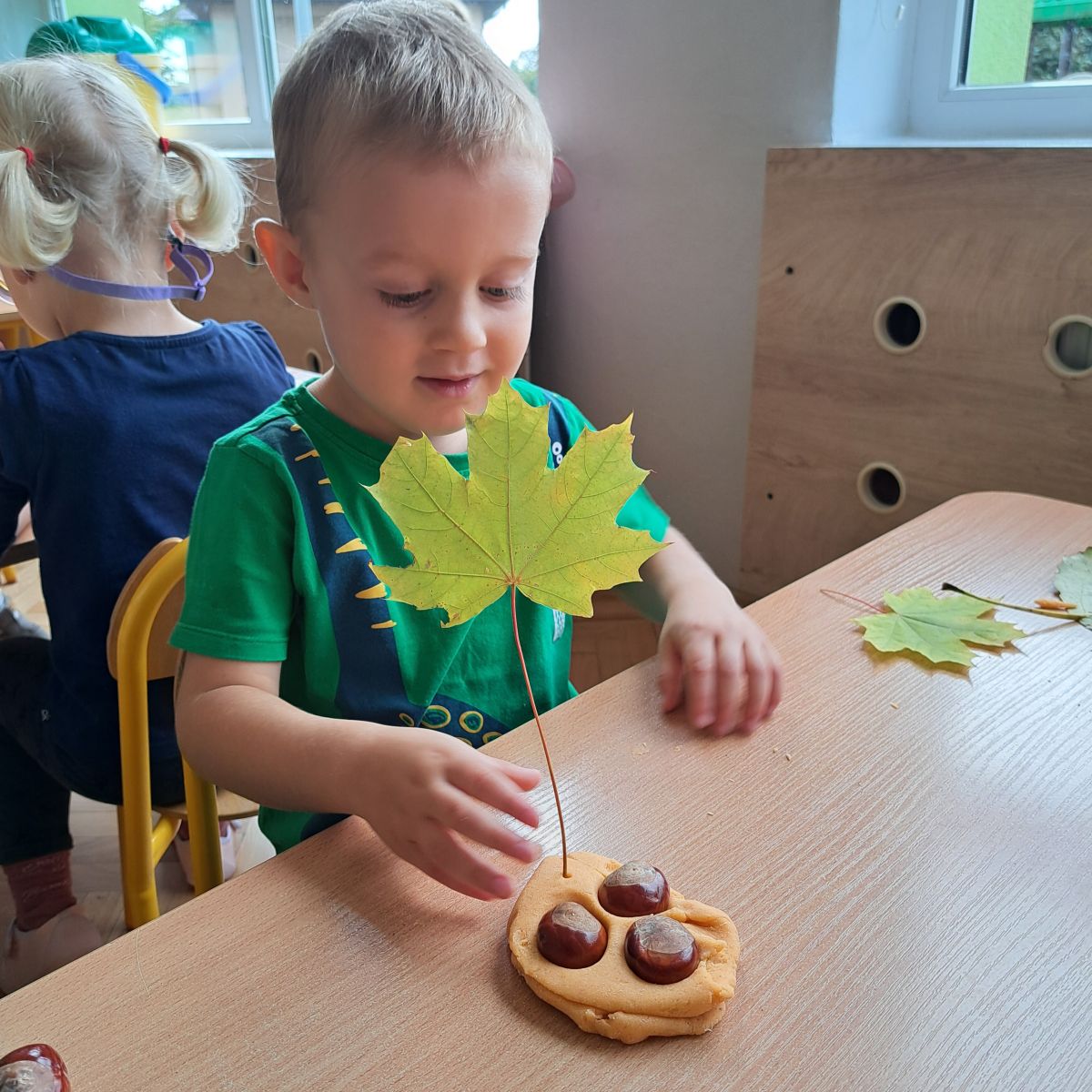 W drugiej części zajęć przedszkolaki bawiły się ciastoliną – odciskały w niej kształty kasztanów, liści, szyszek i orzechów, tworząc własne jesienne kompozycje. Dzięki takim aktywnościom dzieci doskonaliły: