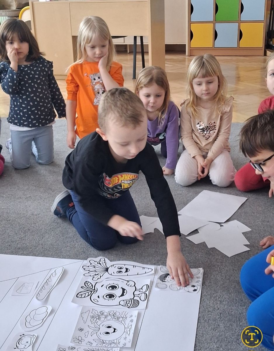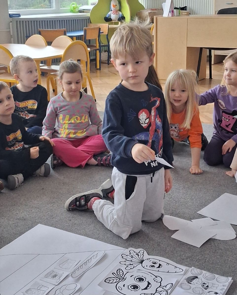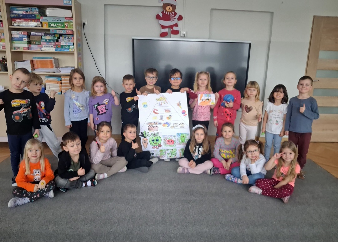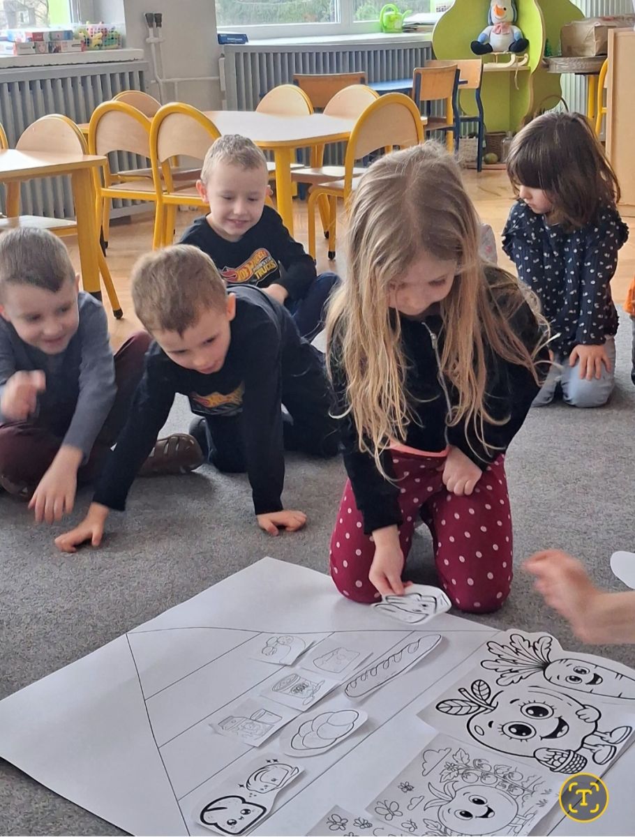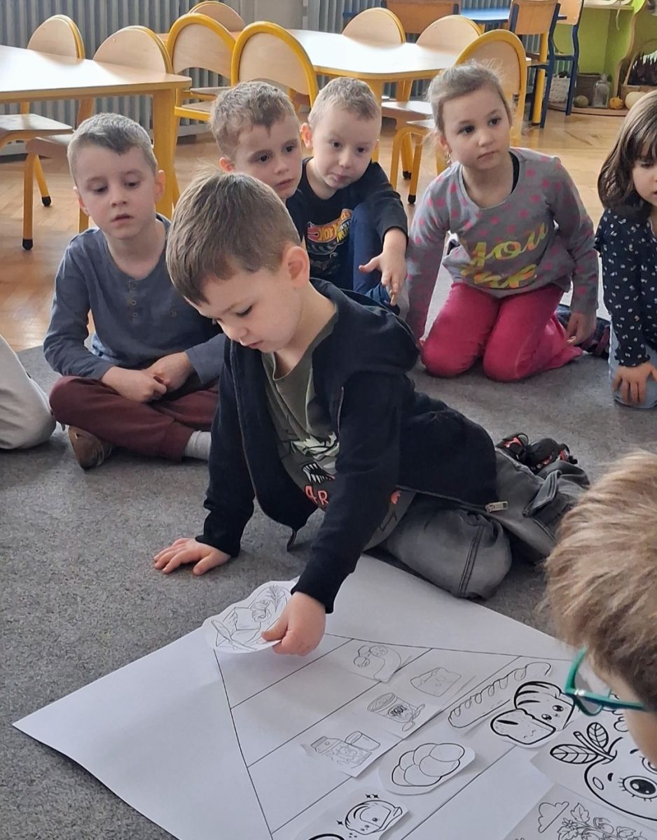 Kolejnym punktem spotkania była rozmowa o tym, co robić, aby być silnym i zdrowym. Dzieci wspólnie z mamą Jasia i Kuby tworzyły Piramidę Zdrowia. Zabawa miała charakter interaktywny – przedszkolaki losowały ilustracje przedstawiające różne produkty spożywcze oraz formy aktywności fizycznej, a następnie przyklejały je w odpowiednich miejscach na wielkiej piramidzie. Dzięki temu „Jeżyki” już wiedzą, że owoce i warzywa to podstawa, a słodycze powinny być tylko rzadkim dodatkiem.