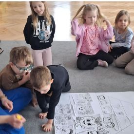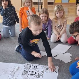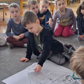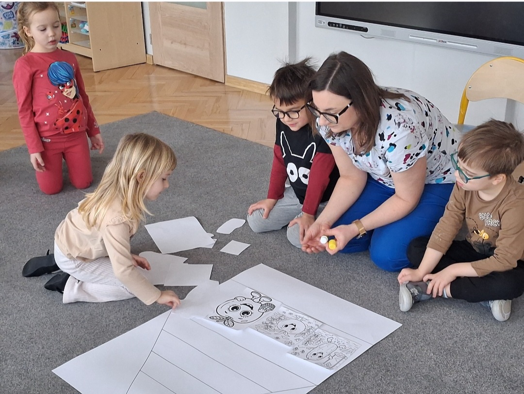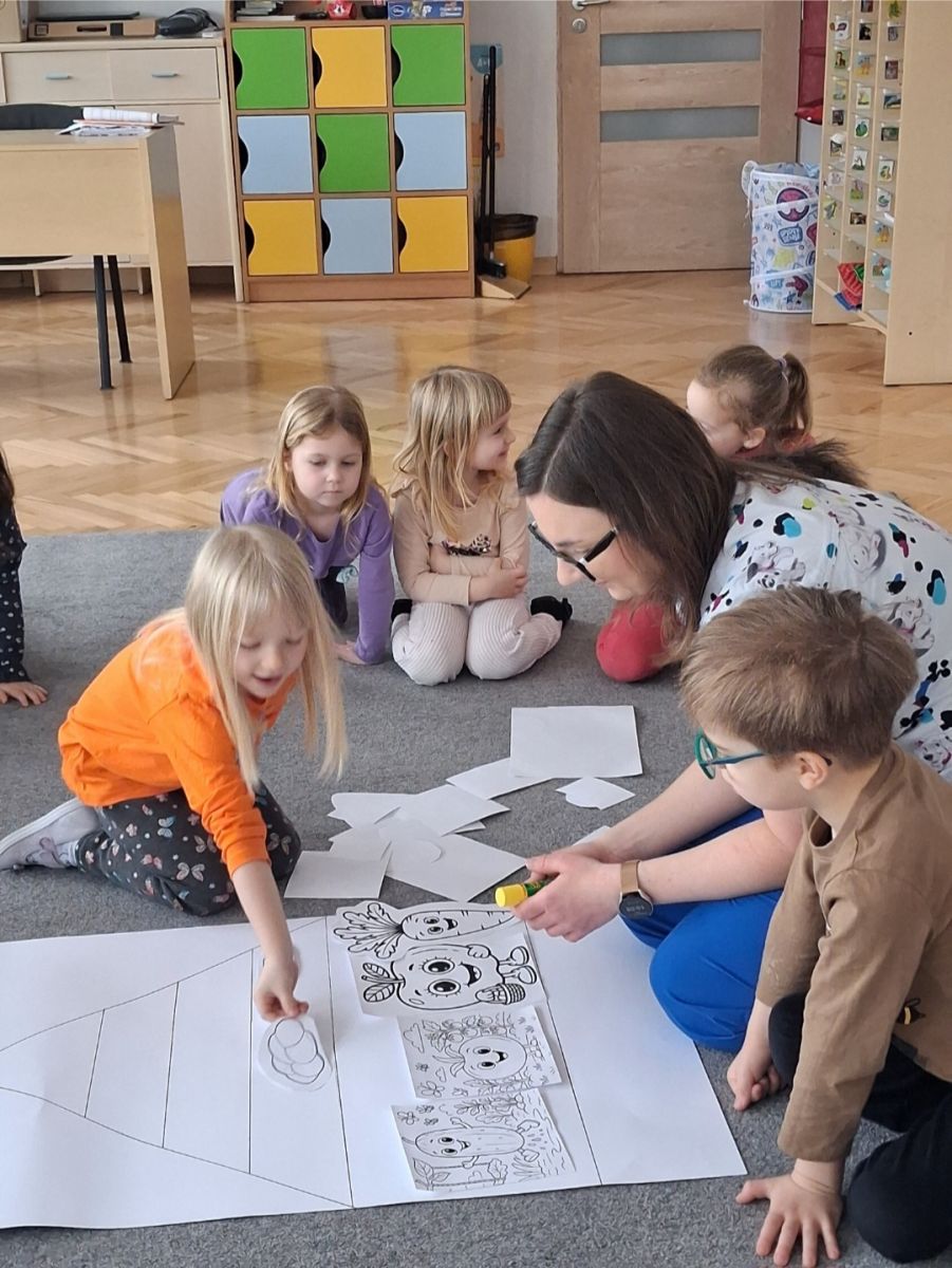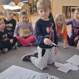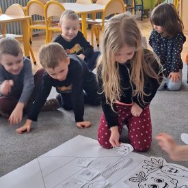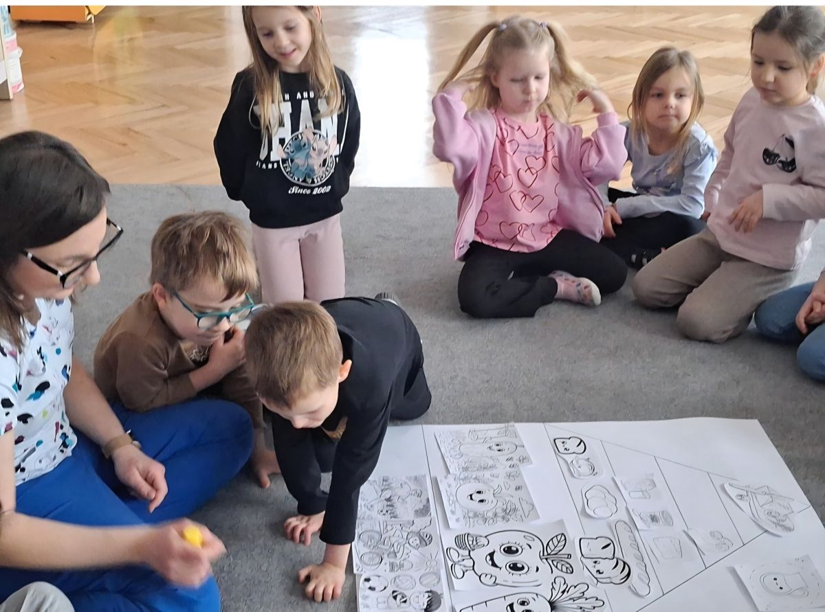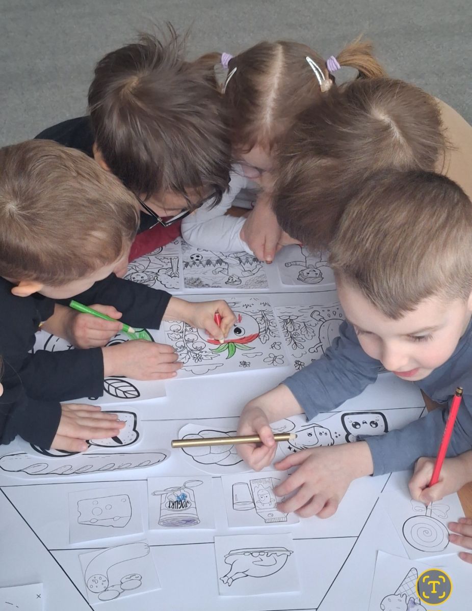 Kolejnym punktem spotkania była rozmowa o tym, co robić, aby być silnym i zdrowym. Dzieci wspólnie z mamą Jasia i Kuby tworzyły Piramidę Zdrowia. Zabawa miała charakter interaktywny – przedszkolaki losowały ilustracje przedstawiające różne produkty spożywcze oraz formy aktywności fizycznej, a następnie przyklejały je w odpowiednich miejscach na wielkiej piramidzie. Dzięki temu „Jeżyki” już wiedzą, że owoce i warzywa to podstawa, a słodycze powinny być tylko rzadkim dodatkiem.