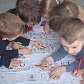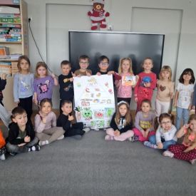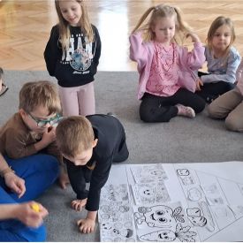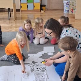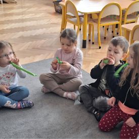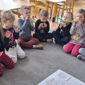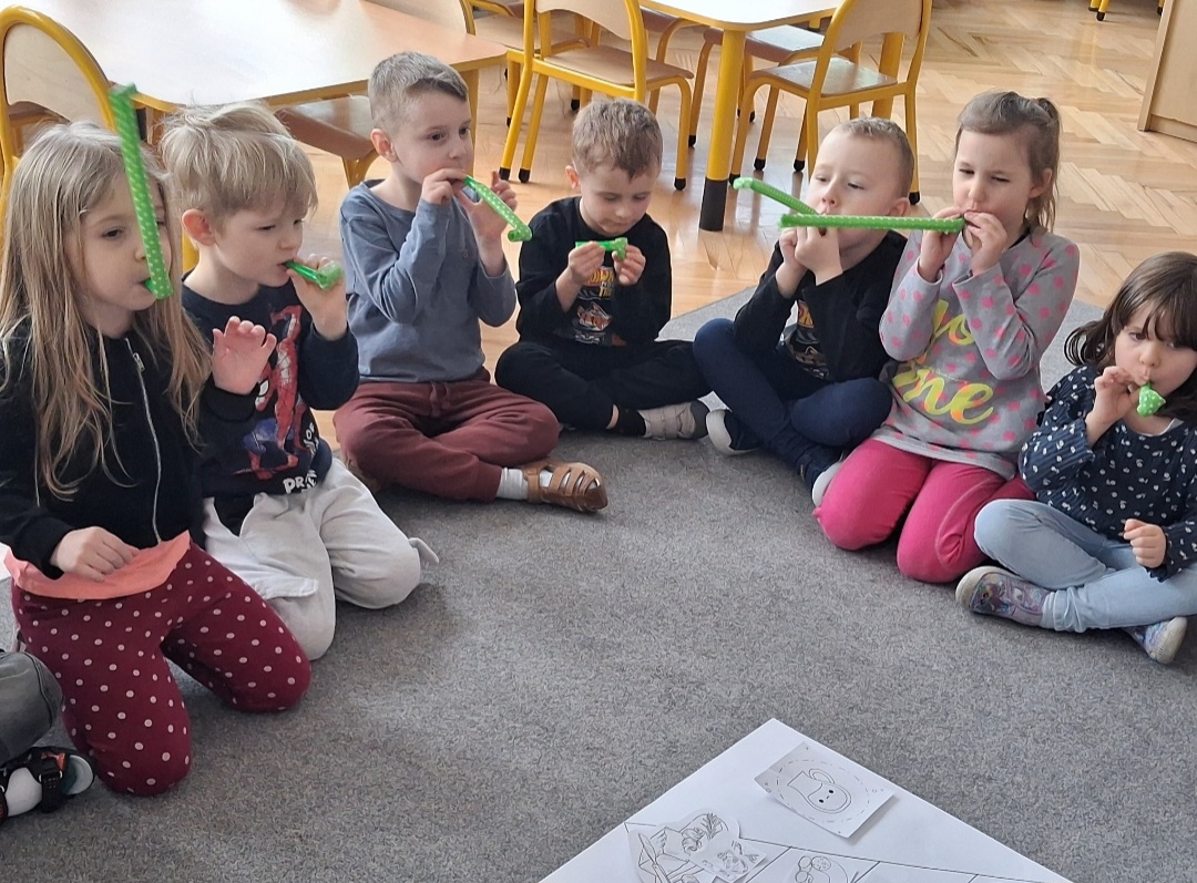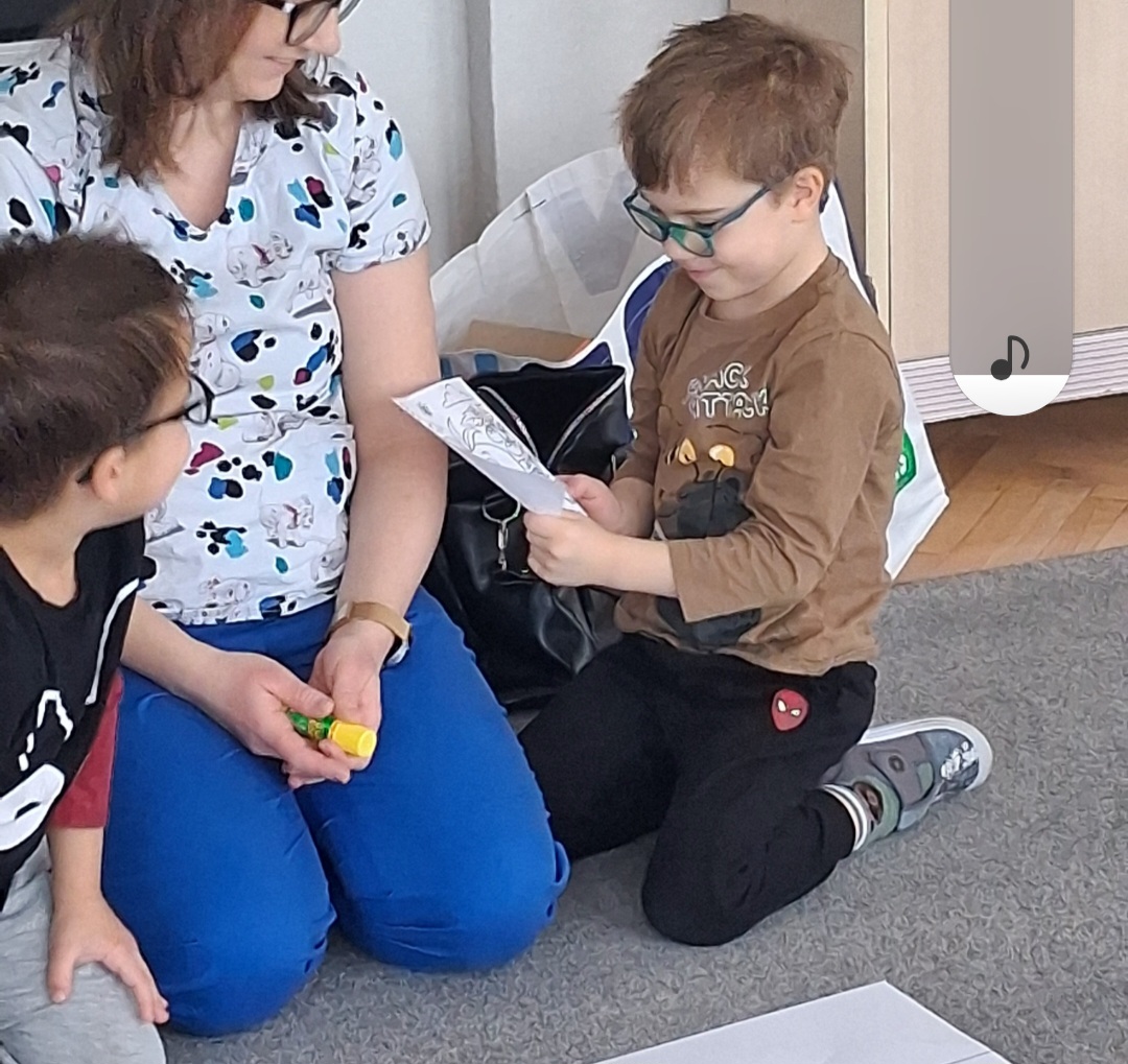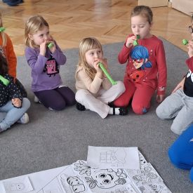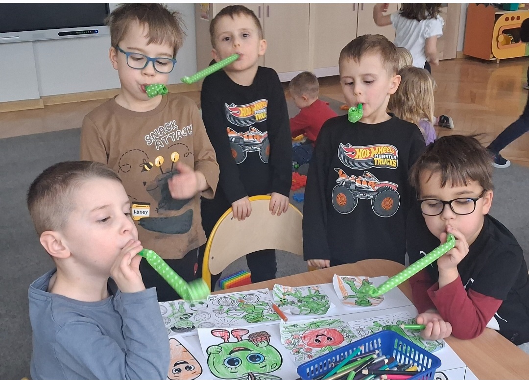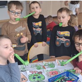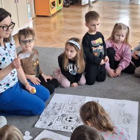 Pani doktor podkreśliła, jak ogromne znaczenie dla rosnącego organizmu ma codzienna aktywność fizyczna oraz odpowiednia ilość snu i odpoczynku. Przedszkolaki utrwaliły zdobytą wiedzę, starannie kolorując obrazki związane ze zdrowym odżywianiem. W trosce o dobrą formę naszych płuc, mama Jasia i Kuby przeprowadziła z dziećmi ćwiczenia oddechowe z wykorzystaniem kolorowych dmuchajek. Było przy tym mnóstwo śmiechu i zabawy! Następnie cała grupa wzięła udział w zabawie przy piosence ,,Dbaj o zdrowie” naśladując ruchy i dbając o radosną dawkę aktywności. Na zakończenie części edukacyjnej dzieci z wielką uwagą wysłuchały opowiadania o przygodach ulubionej bohaterki – „Kicia Kocia u lekarza”. Historia ta idealnie podsumowała spotkanie, pokazując krok po kroku, jak wygląda badanie profilaktyczne. W podziękowaniu za aktywne uczestnictwo i bycie „dzielnymi pacjentami”, każde dziecko otrzymało od pani doktor pamiątkową naklejkę. To był dzień pełen wrażeń, który z pewnością na długo zapadnie w pamięci „Jeżyków”. Serdecznie dziękujemy mamie Jasia i Kuby za poświęcony czas, podzielenie się wiedzą i przygotowanie tak atrakcyjnych zajęć!
