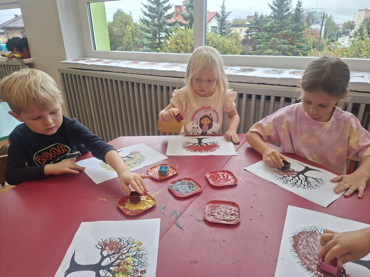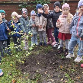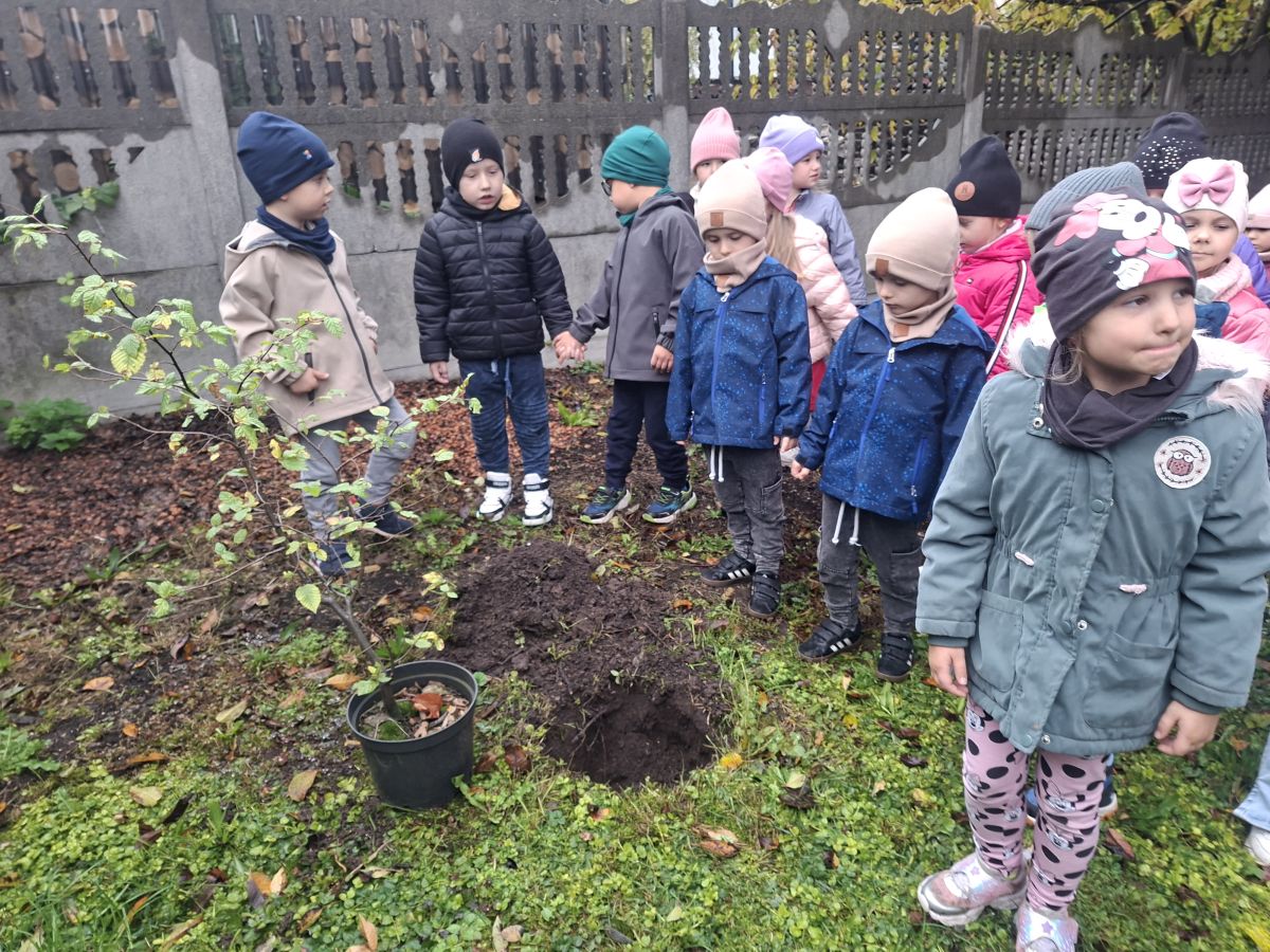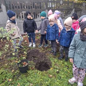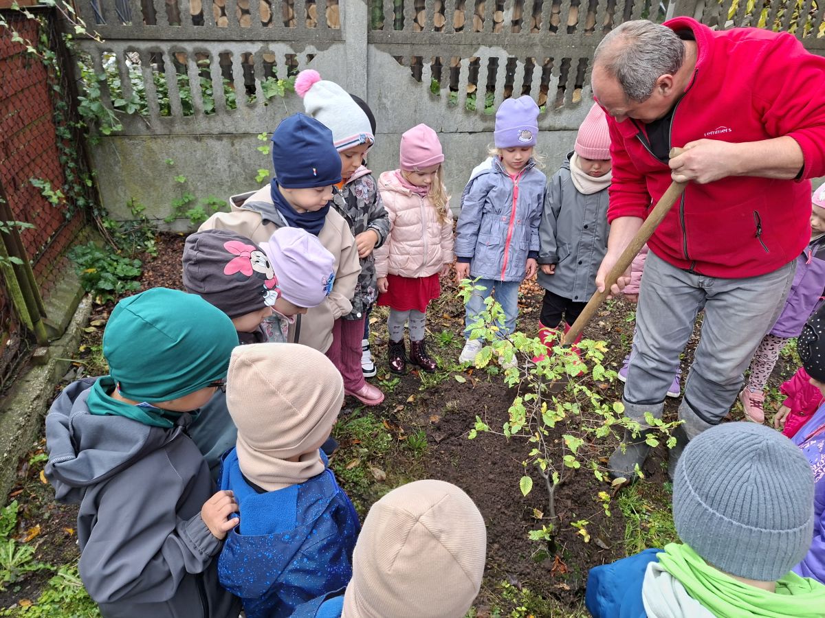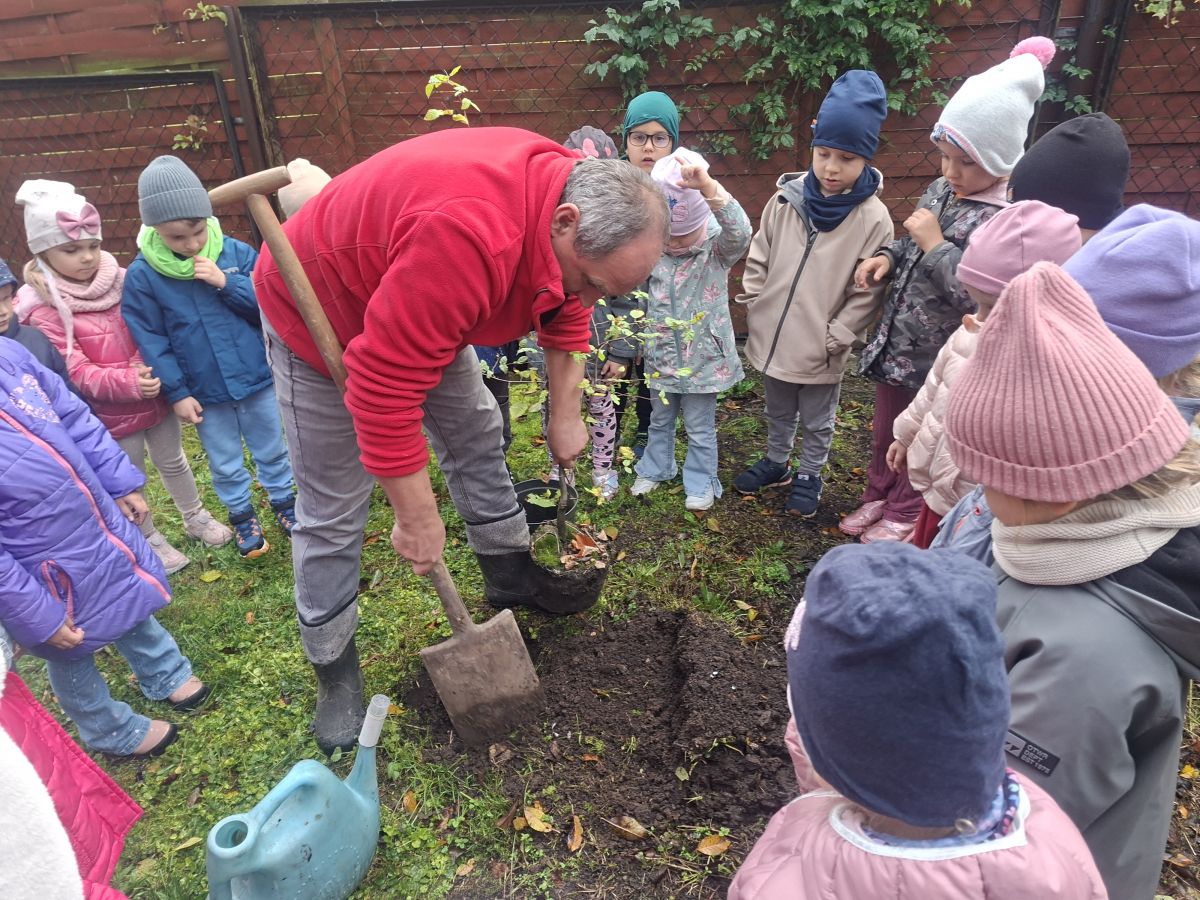 Z okazji Dnia Drzewa dzieci z grupy Jeżyki wzięły udział w wyjątkowych zajęciach poświęconych budowie i znaczeniu drzew. Dzieci dowiedziały się, z czego składa się drzewo, a także rozmawiały o tym, dlaczego drzewa są tak ważne dla ludzi i zwierząt. Później nadszedł czas na zajęcia plastyczne – dzieci za pomocą farb i klocków stemplowały kolorowe liście, tworząc barwne prace inspirowane jesienną przyrodą. Każde drzewko było inne – tak jak różne są drzewa w naturze! Najważniejszym momentem dnia było jednak zasadzenie drzewka leszczyny w naszym przedszkolnym ogrodzie. Z pomocą pana Sławka wykopaliśmy dołek, wsadziliśmy młodą roślinkę i podlaliśmy ją z nadzieją, że wyrośnie silna i zdrowa. Dzieci wiedzą, że w przyszłości, gdy leszczyna podrośnie, jej orzeszki będą pyszną przekąską dla wiewiórek odwiedzających nasz przedszkolny ogród.