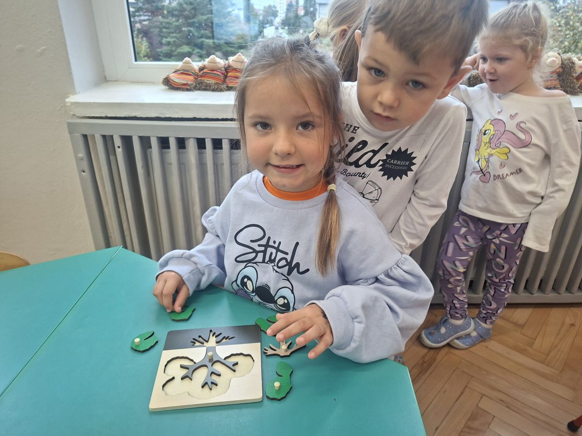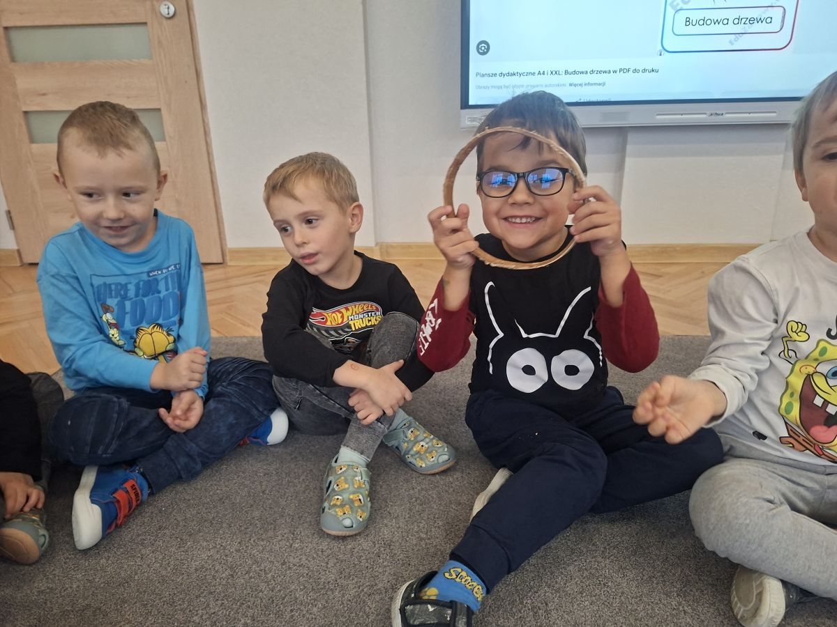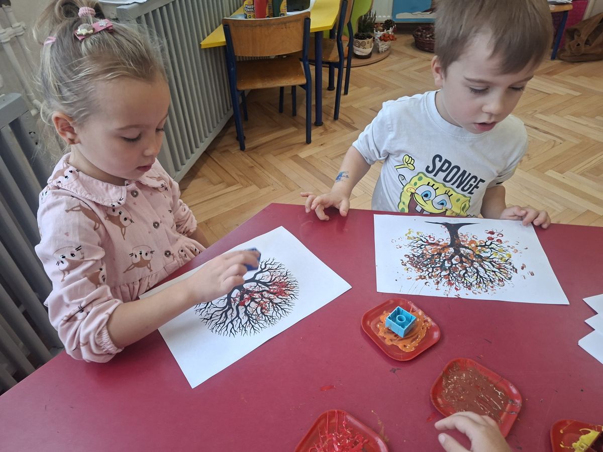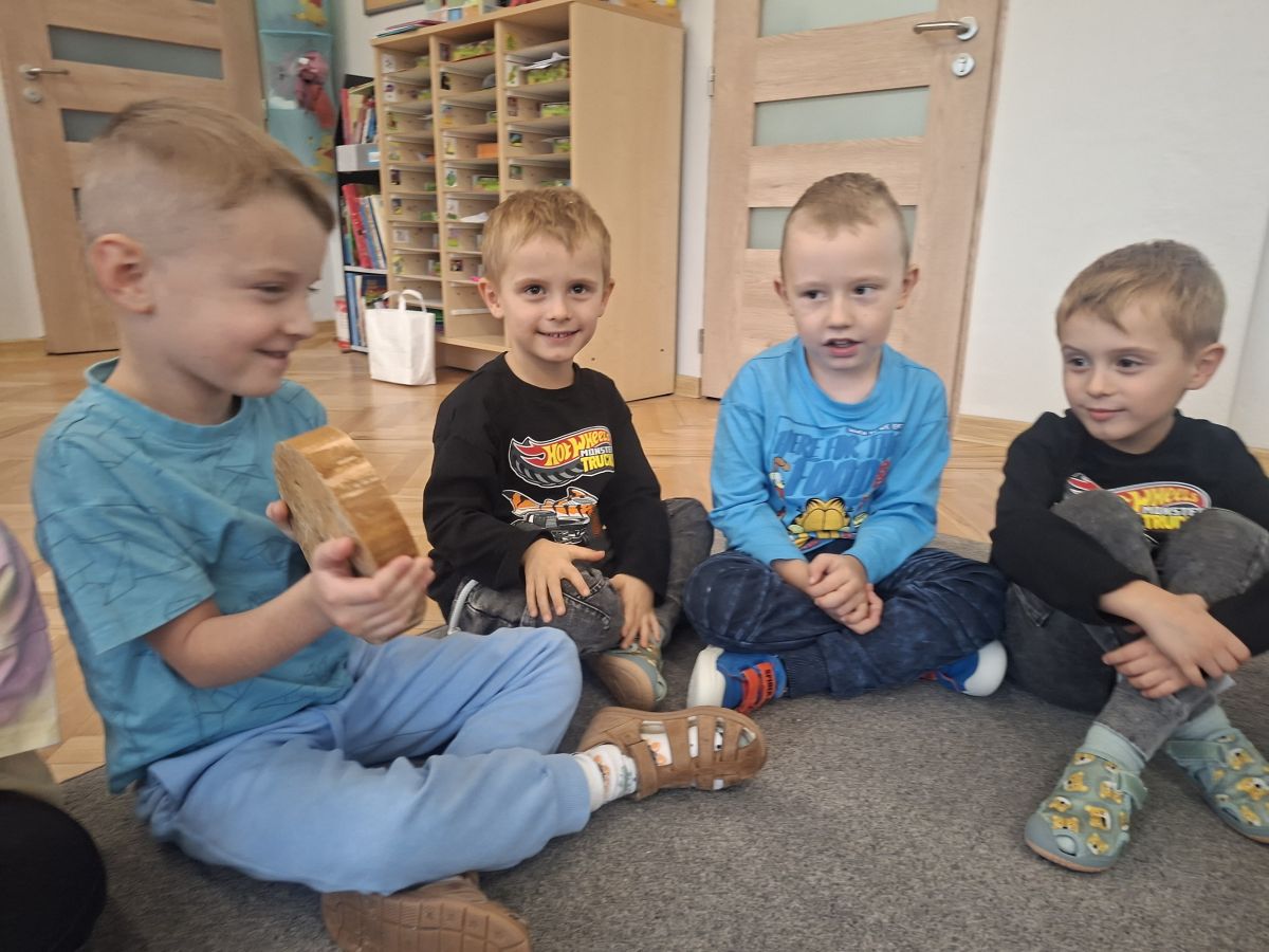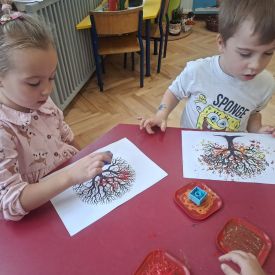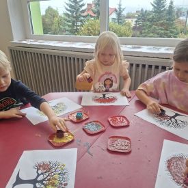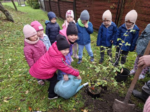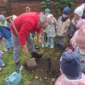 Z okazji Dnia Drzewa dzieci z grupy Jeżyki wzięły udział w wyjątkowych zajęciach poświęconych budowie i znaczeniu drzew. Dzieci dowiedziały się, z czego składa się drzewo, a także rozmawiały o tym, dlaczego drzewa są tak ważne dla ludzi i zwierząt. Później nadszedł czas na zajęcia plastyczne – dzieci za pomocą farb i klocków stemplowały kolorowe liście, tworząc barwne prace inspirowane jesienną przyrodą. Każde drzewko było inne – tak jak różne są drzewa w naturze! Najważniejszym momentem dnia było jednak zasadzenie drzewka leszczyny w naszym przedszkolnym ogrodzie. Z pomocą pana Sławka wykopaliśmy dołek, wsadziliśmy młodą roślinkę i podlaliśmy ją z nadzieją, że wyrośnie silna i zdrowa. Dzieci wiedzą, że w przyszłości, gdy leszczyna podrośnie, jej orzeszki będą pyszną przekąską dla wiewiórek odwiedzających nasz przedszkolny ogród.
