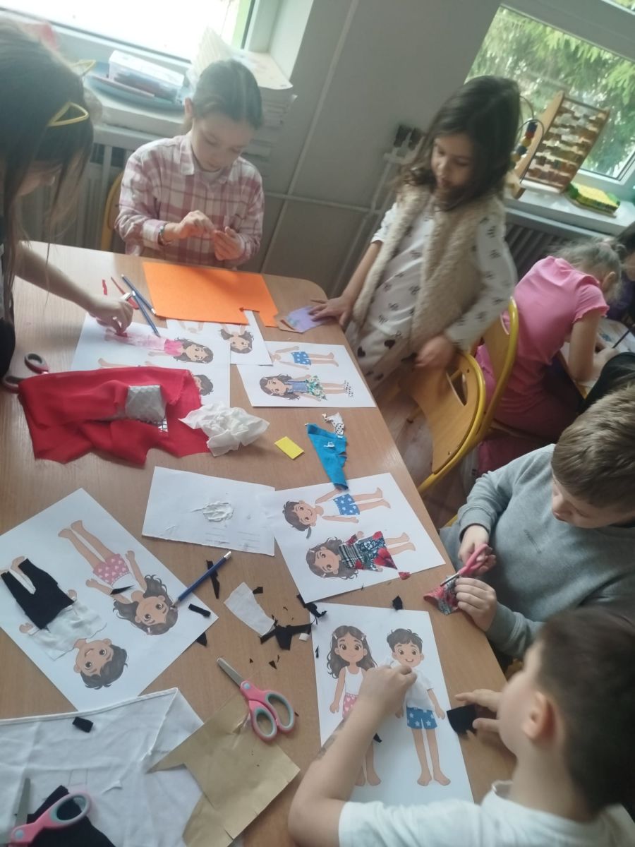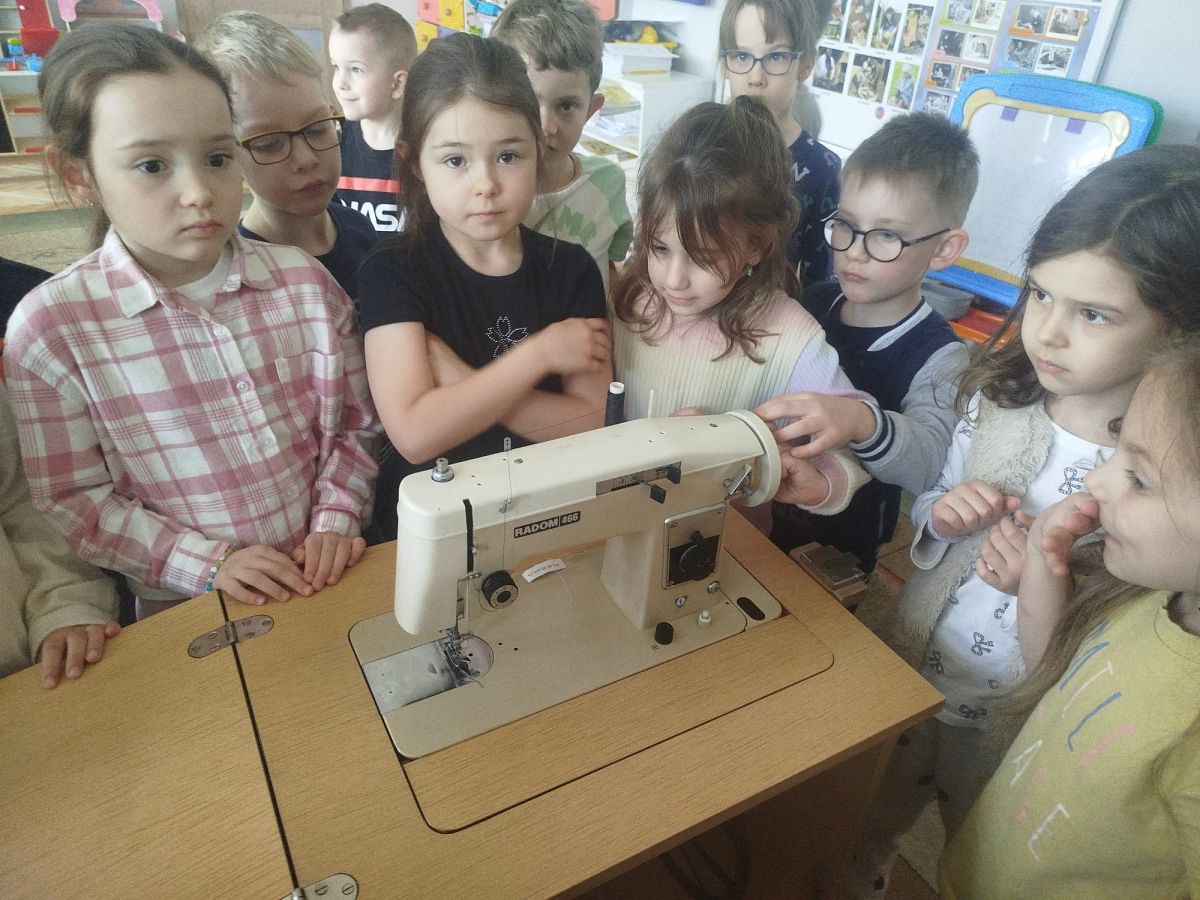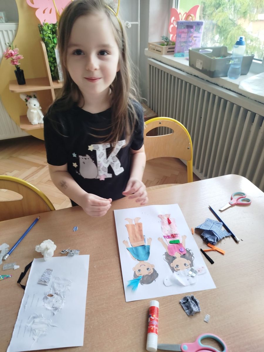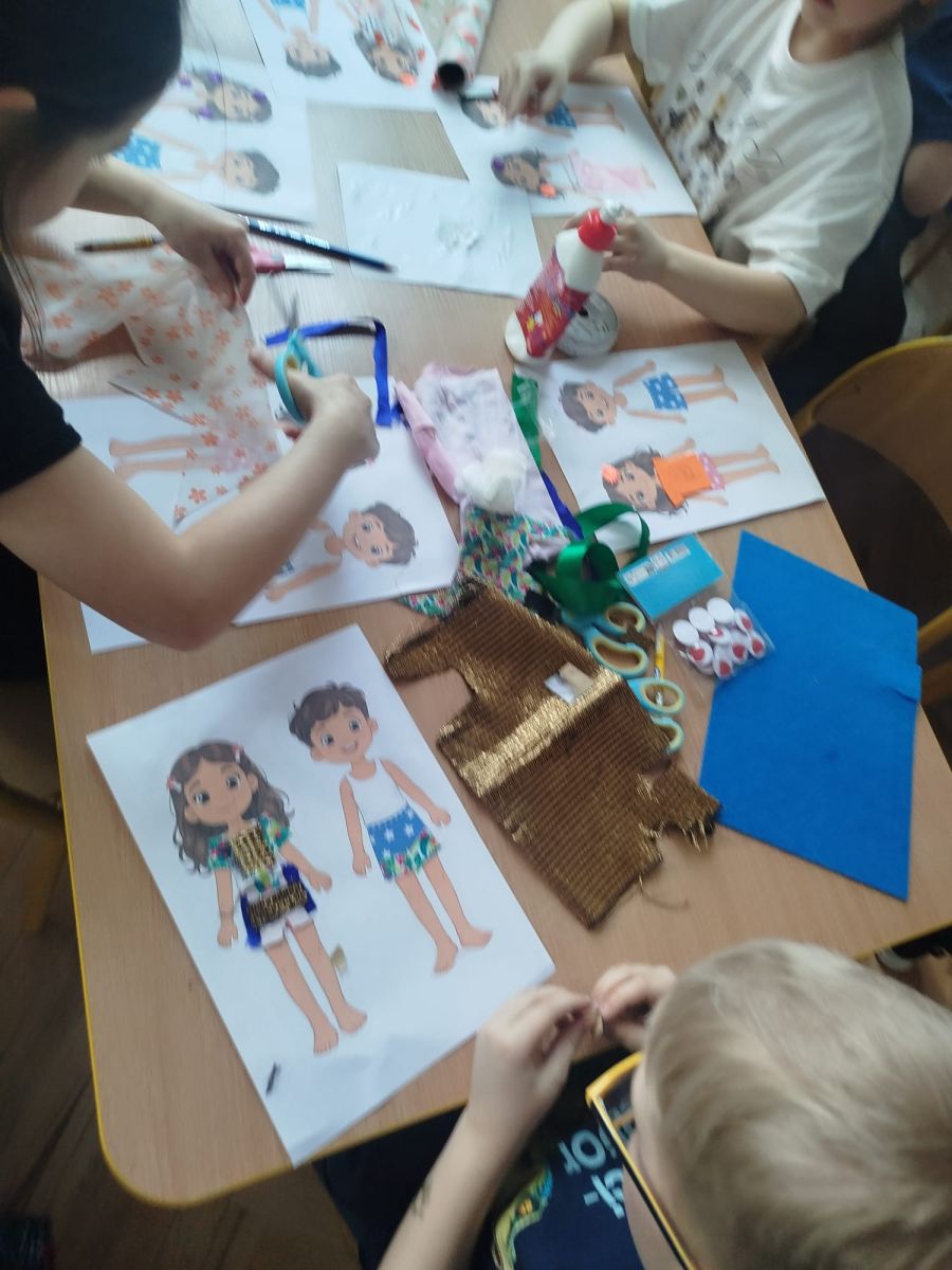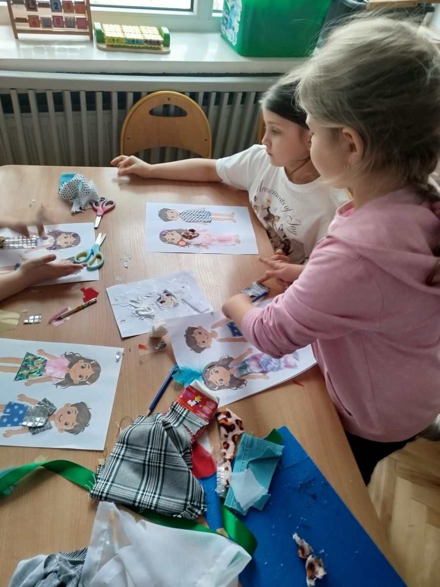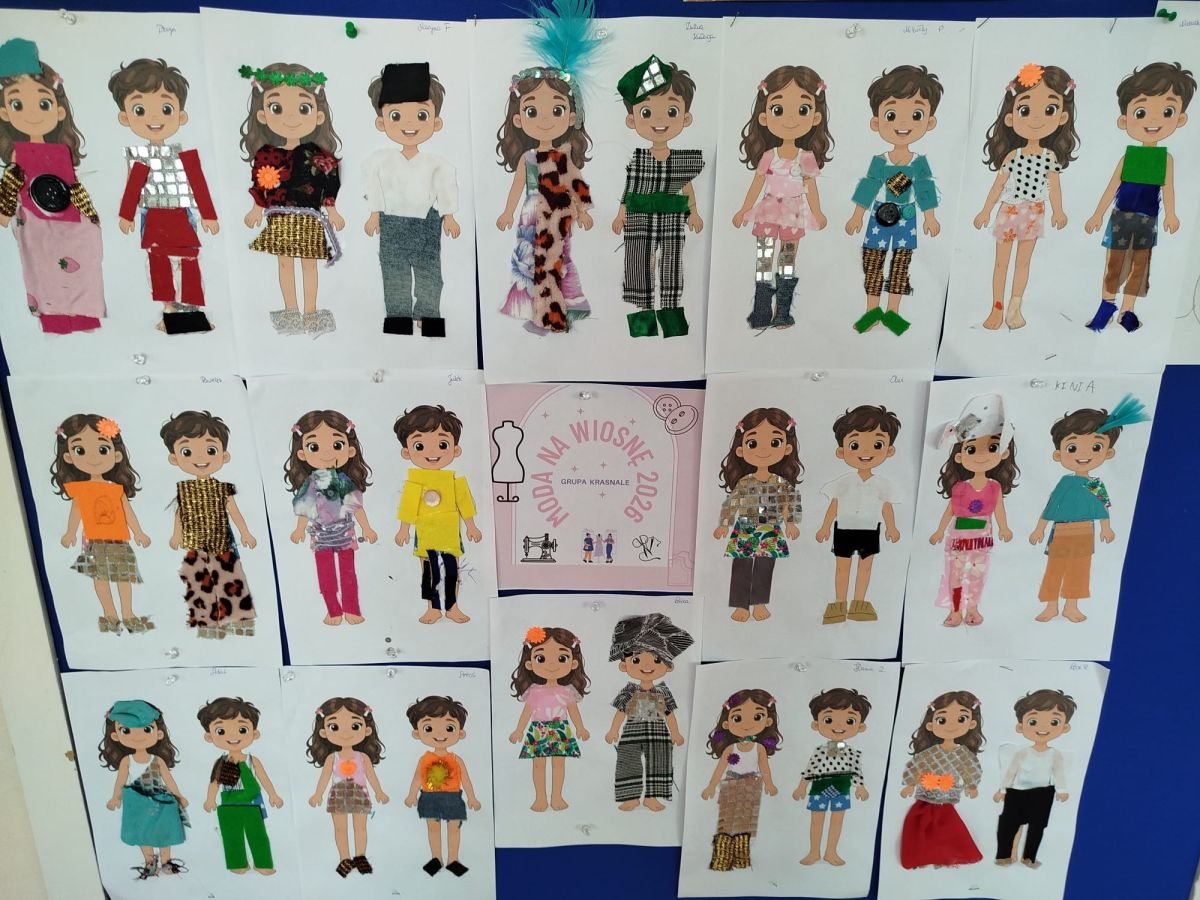 Podczas zajęć dzieci miały okazję zobaczyć prawdziwą, starą maszynę do szycia. Z dużym zainteresowaniem oglądały jej budowę i słuchały opowieści o tym, jak dawniej pracowały krawcowe, zanim pojawiły się nowoczesne urządzenia. Następnie dzieci zamieniły się w dawne krawcowe i projektantów mody. Projektowały własne stroje, wycinały elementy ubrań z różnych materiałów, naklejały je na postacie dzieci. W ten sposób powstały kolorowe i bardzo pomysłowe propozycje mody na wiosnę 2026 roku.