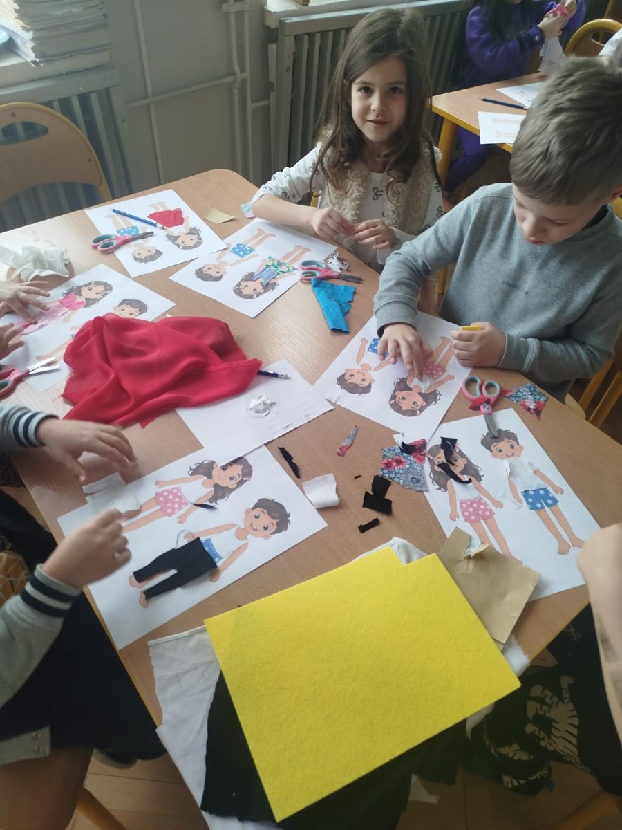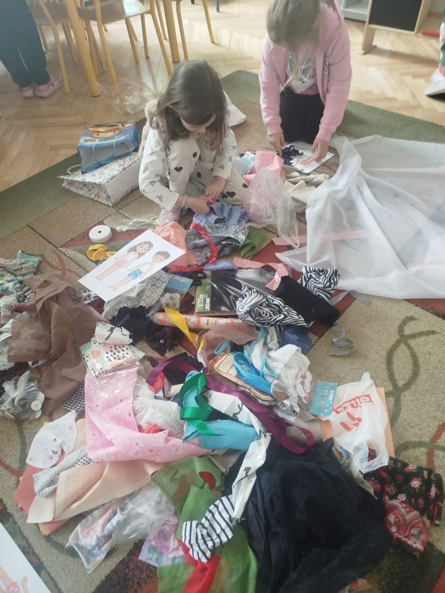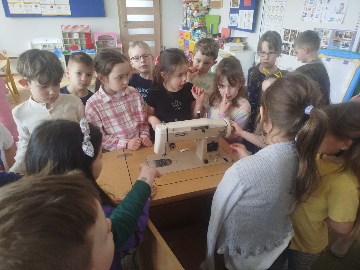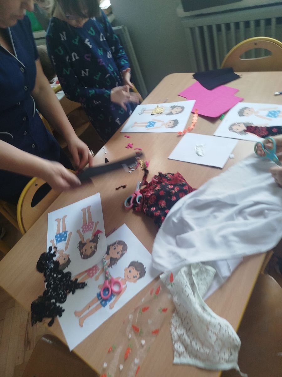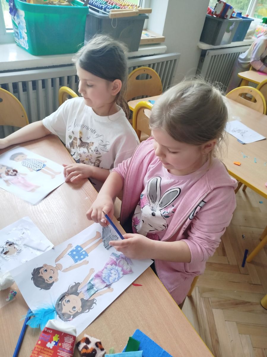 Podczas zajęć dzieci miały okazję zobaczyć prawdziwą, starą maszynę do szycia. Z dużym zainteresowaniem oglądały jej budowę i słuchały opowieści o tym, jak dawniej pracowały krawcowe, zanim pojawiły się nowoczesne urządzenia. Następnie dzieci zamieniły się w dawne krawcowe i projektantów mody. Projektowały własne stroje, wycinały elementy ubrań z różnych materiałów, naklejały je na postacie dzieci. W ten sposób powstały kolorowe i bardzo pomysłowe propozycje mody na wiosnę 2026 roku.
