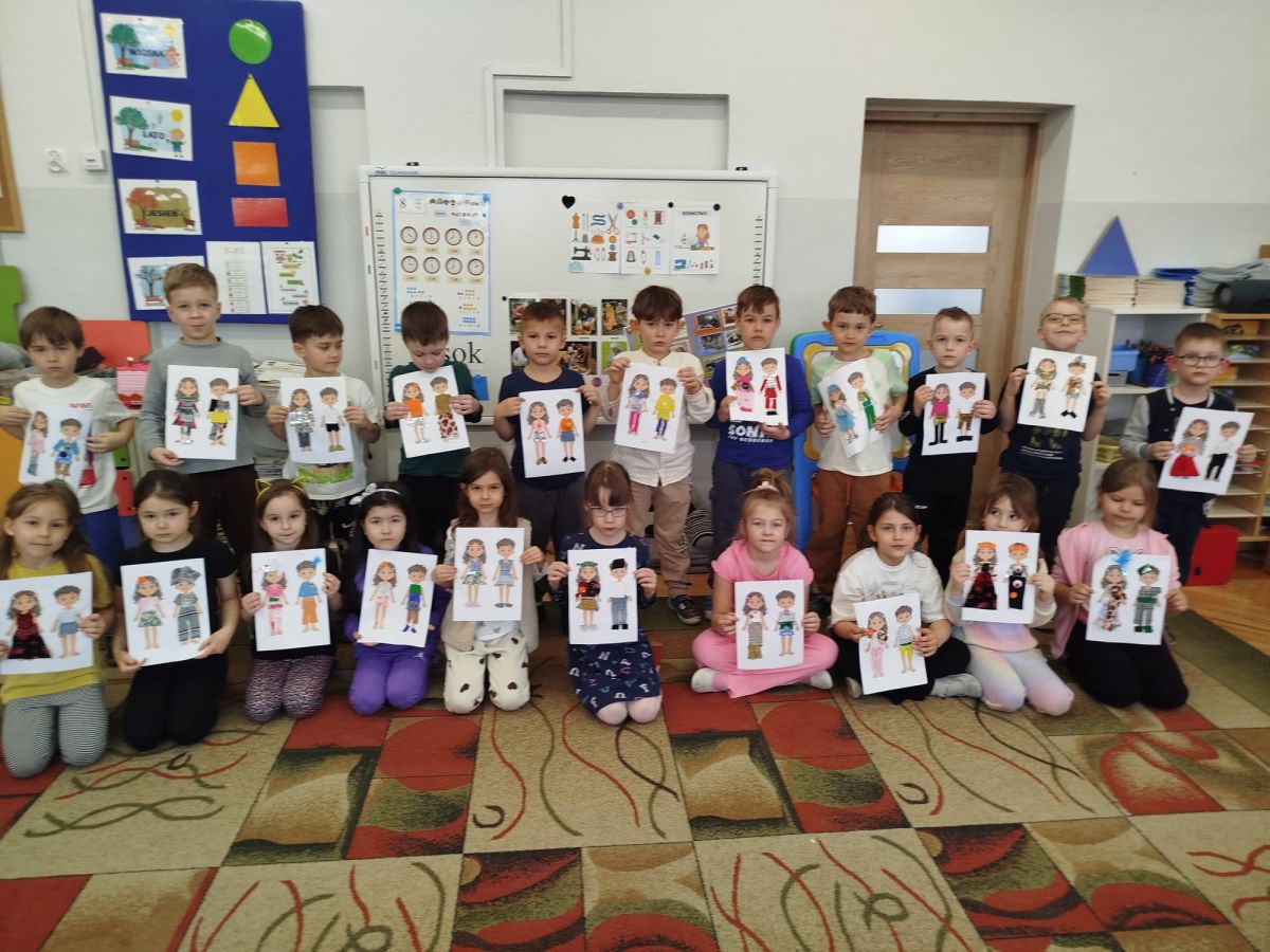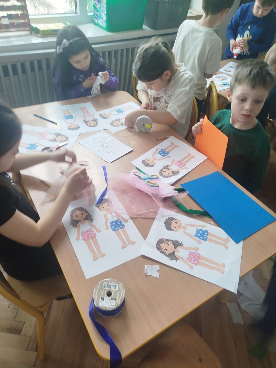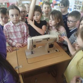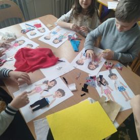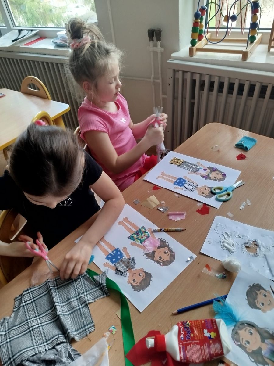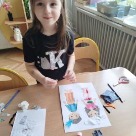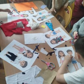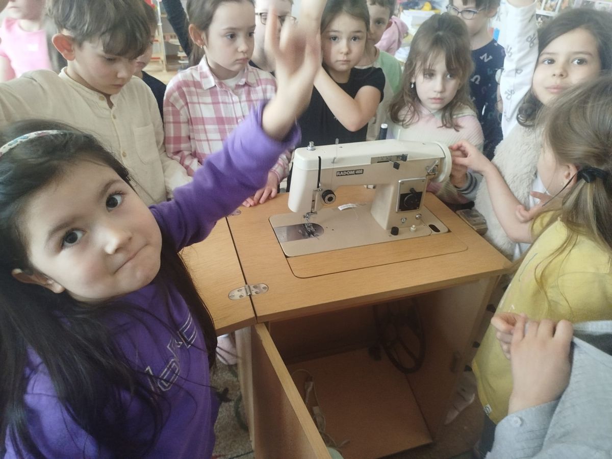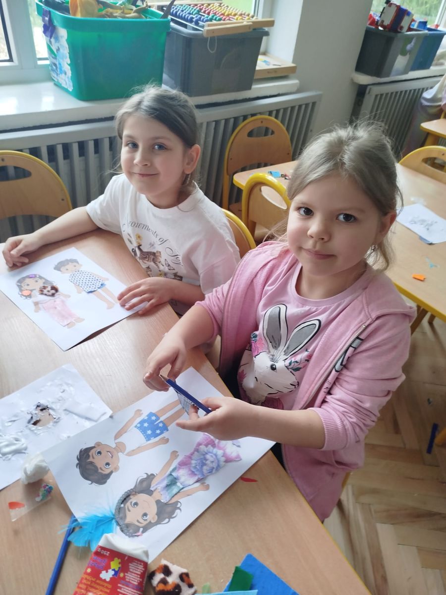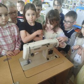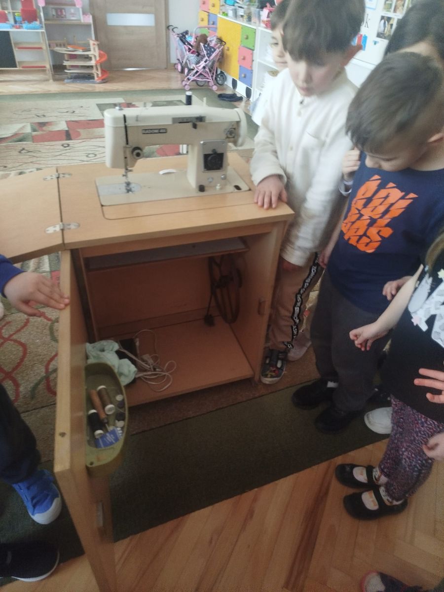 Podczas zajęć dzieci miały okazję zobaczyć prawdziwą, starą maszynę do szycia. Z dużym zainteresowaniem oglądały jej budowę i słuchały opowieści o tym, jak dawniej pracowały krawcowe, zanim pojawiły się nowoczesne urządzenia. Następnie dzieci zamieniły się w dawne krawcowe i projektantów mody. Projektowały własne stroje, wycinały elementy ubrań z różnych materiałów, naklejały je na postacie dzieci. W ten sposób powstały kolorowe i bardzo pomysłowe propozycje mody na wiosnę 2026 roku.