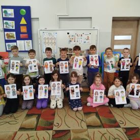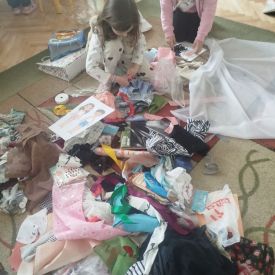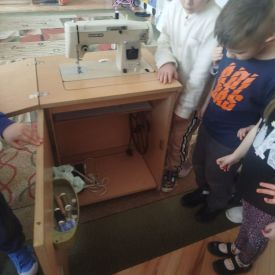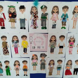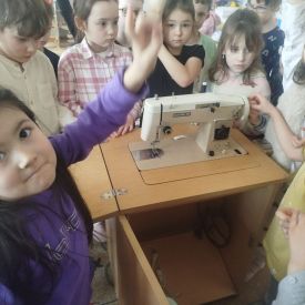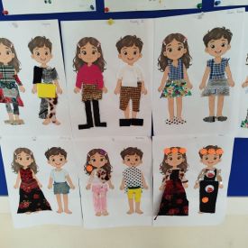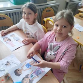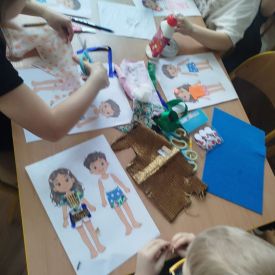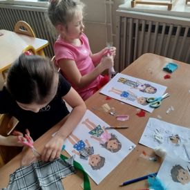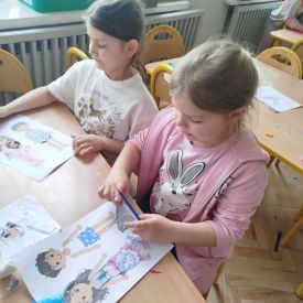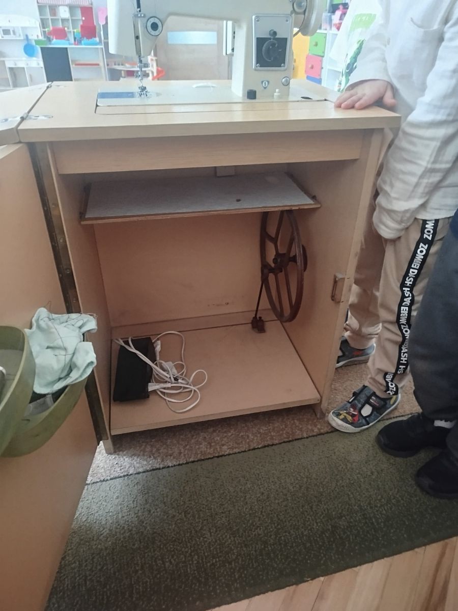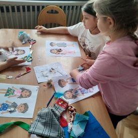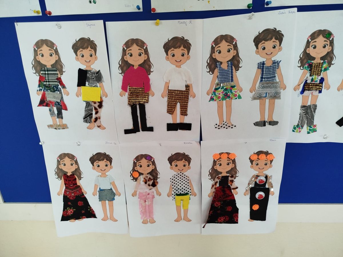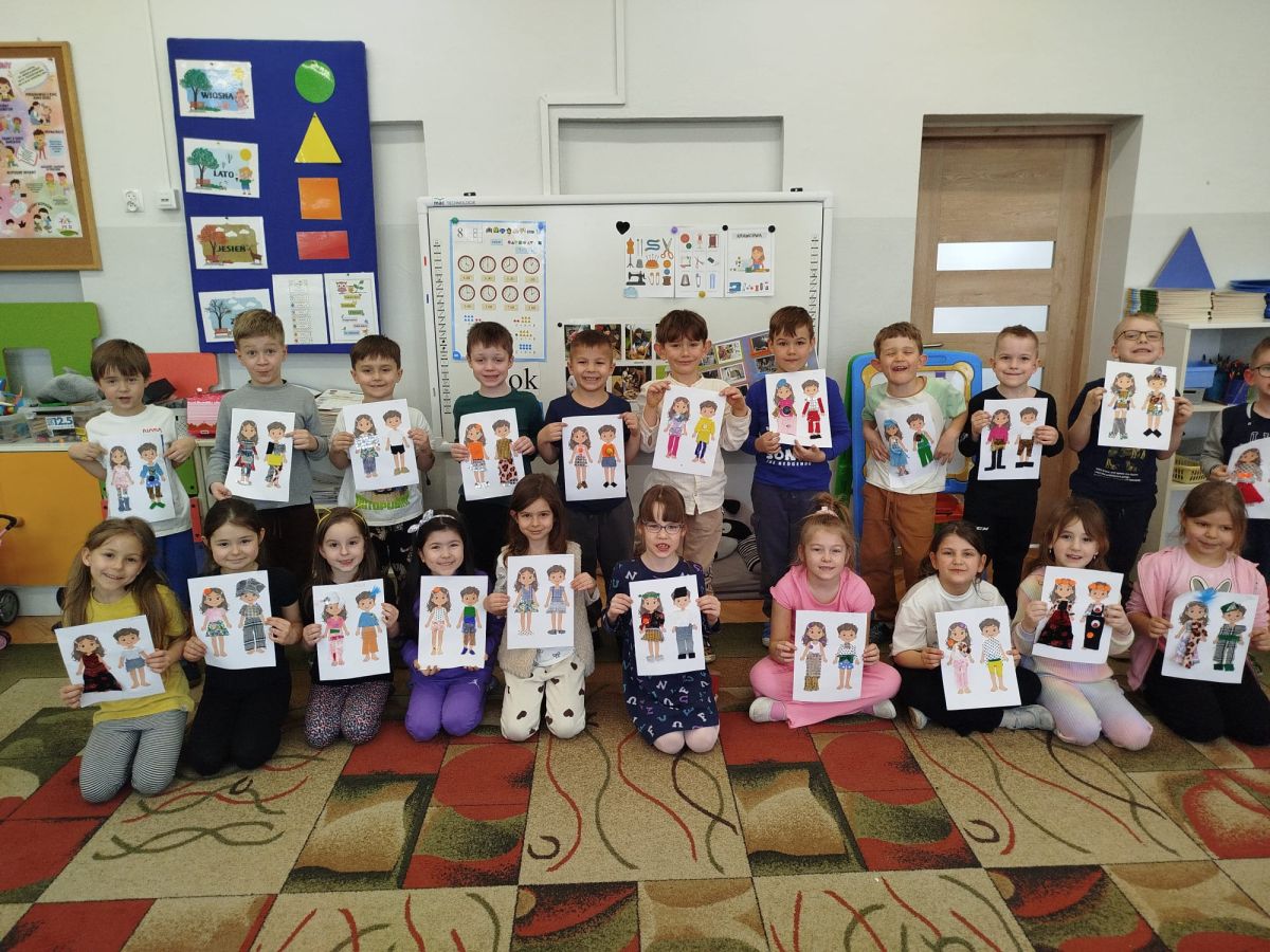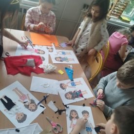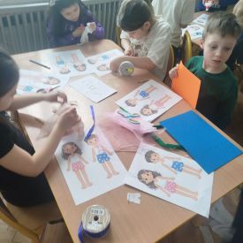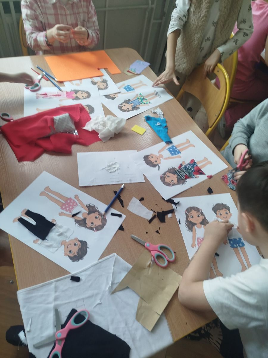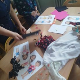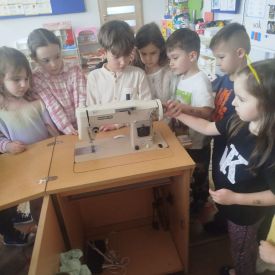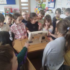 Podczas zajęć dzieci miały okazję zobaczyć prawdziwą, starą maszynę do szycia. Z dużym zainteresowaniem oglądały jej budowę i słuchały opowieści o tym, jak dawniej pracowały krawcowe, zanim pojawiły się nowoczesne urządzenia. Następnie dzieci zamieniły się w dawne krawcowe i projektantów mody. Projektowały własne stroje, wycinały elementy ubrań z różnych materiałów, naklejały je na postacie dzieci. W ten sposób powstały kolorowe i bardzo pomysłowe propozycje mody na wiosnę 2026 roku.
