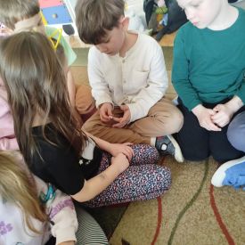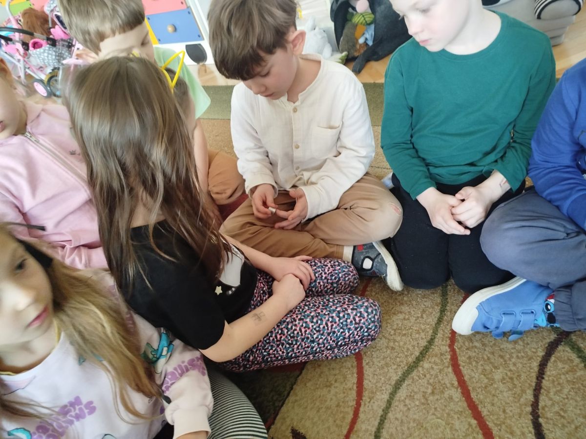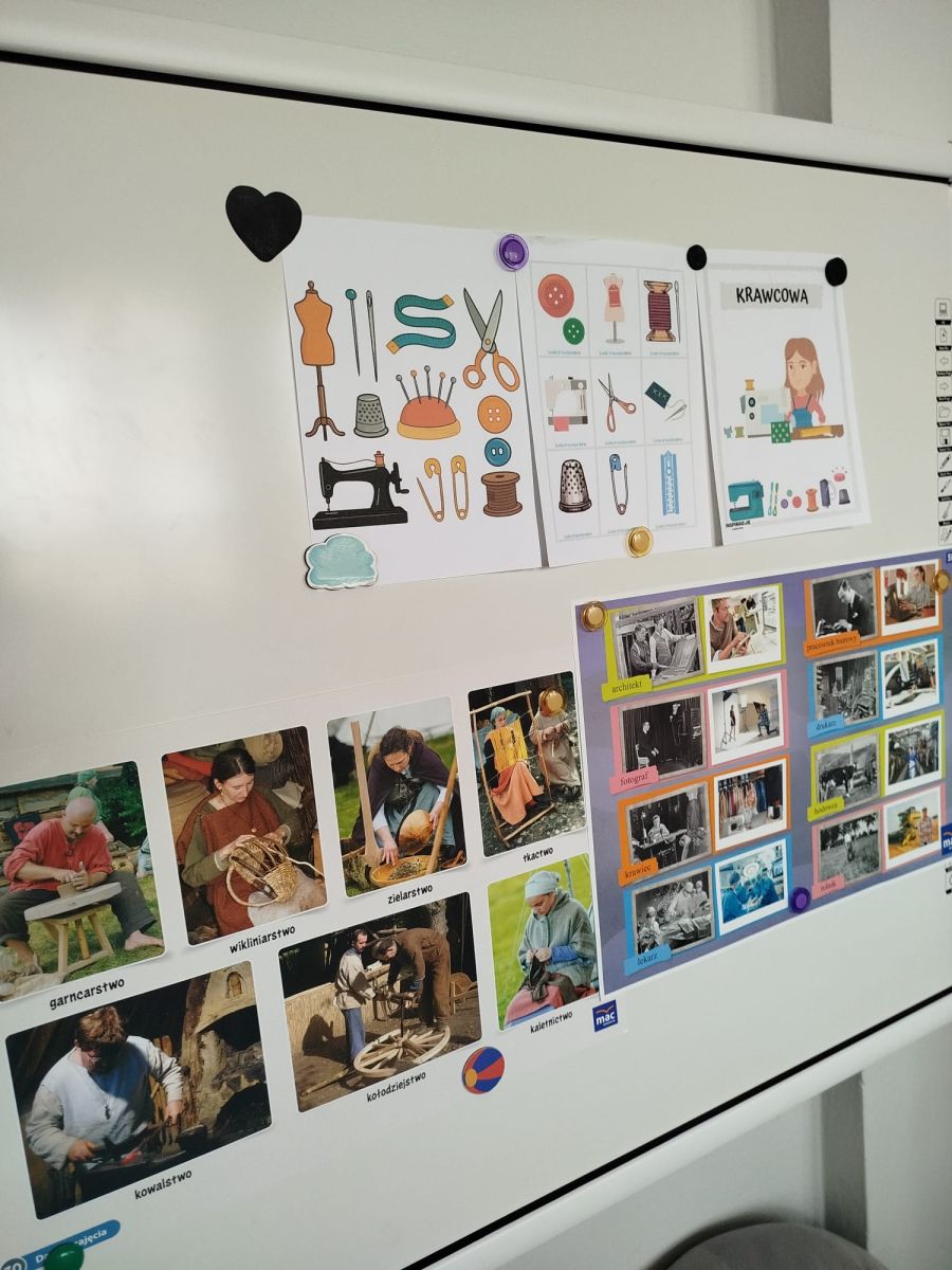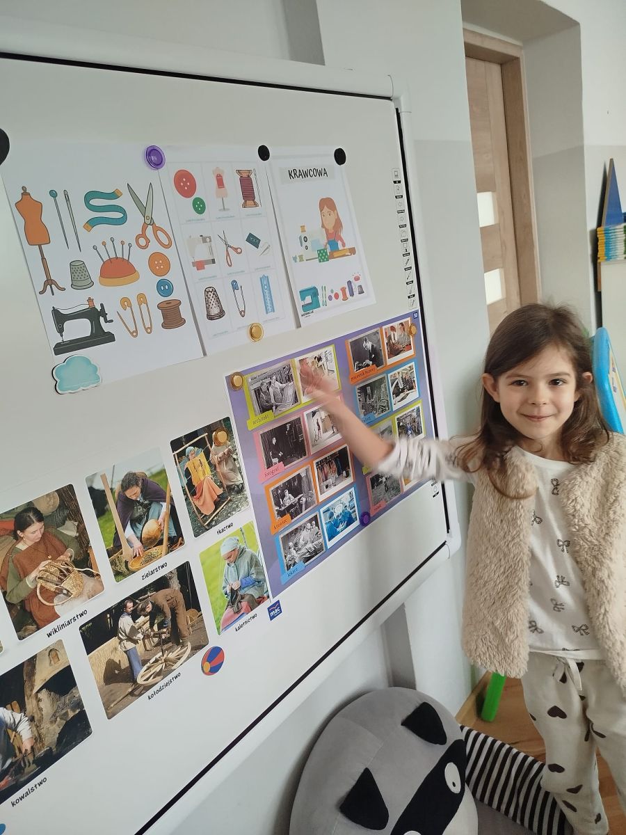 W tym tygodniu Krasnale poznawały dawne zawody wykonywane przez ludzi, takie jak garncarstwo, wikliniarstwo, zielarstwo, tkactwo i wiele innych. Dzieci dowiedziały się, czym zajmowali się dawniej rzemieślnicy, jakich narzędzi używali oraz jak powstawały przedmioty codziennego użytku. Rozmawialiśmy o tym, że kiedyś większość rzeczy wykonywano ręcznie, z naturalnych materiałów, a praca ta wymagała dużej cierpliwości, umiejętności i doświadczenia. Następnie przyglądaliśmy się zawodom, które nadal istnieją, ale dziś są mniej popularne niż kiedyś. Dzieci zastanawiały się, dlaczego takie zawody jak szewc, krawiec czy zegarmistrz są obecnie rzadziej spotykane. Rozmawialiśmy o tym, jak duży wpływ na zmiany w tych zawodach ma rozwój technologii oraz produkcja masowa – wiele rzeczy jest dziś wytwarzanych w fabrykach, a uszkodzone przedmioty często po prostu się wymienia zamiast naprawiać.