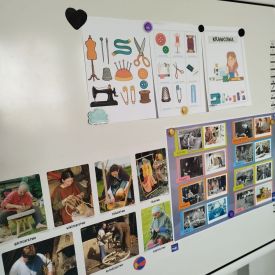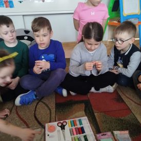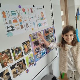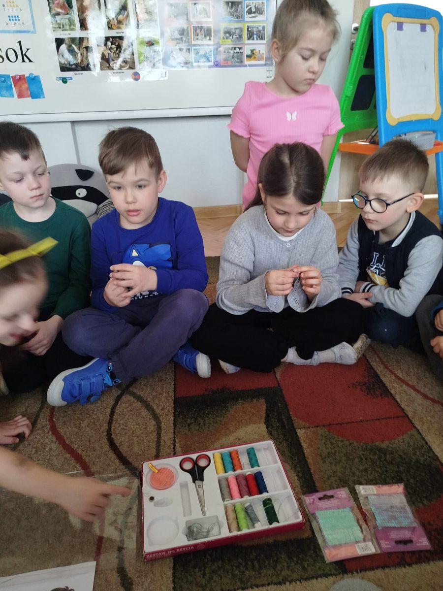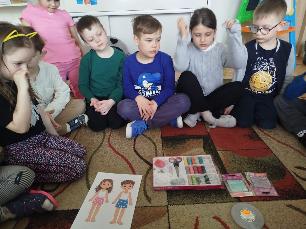 W dalszej części zajęć dzieci przyjrzały się bliżej zawodowi krawcowej. Poznały zawód, który dziś jest trochę mniej popularny niż kiedyś, ale nadal bardzo potrzebny i ważny. Podczas zajęć dowiedziały się, na czym polega praca krawcowej. Poznały narzędzia używane w tej pracy, takie jak igły, nici, nożyczki krawieckie, centymetr krawiecki czy maszyna do szycia. Rozmawialiśmy o tym, że krawcowa szyje nowe ubrania, naprawia te zniszczone oraz dopasowuje odzież do sylwetki. Dzieci dowiedziały się również, że nie jest to zawód dla każdego. Aby zostać krawcową, trzeba być cierpliwym, dokładnym i starannym. Ważna jest także wyobraźnia, zdolności manualne oraz poczucie estetyki, ponieważ projektowanie i szycie ubrań wymaga kreatywności i dbałości o szczegóły.