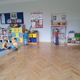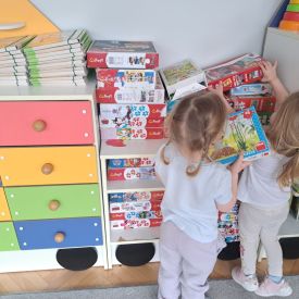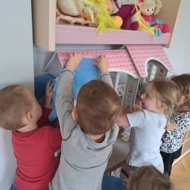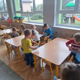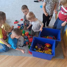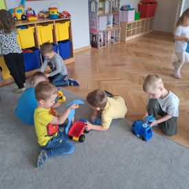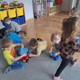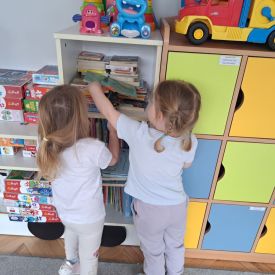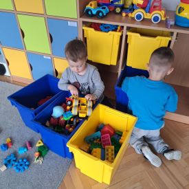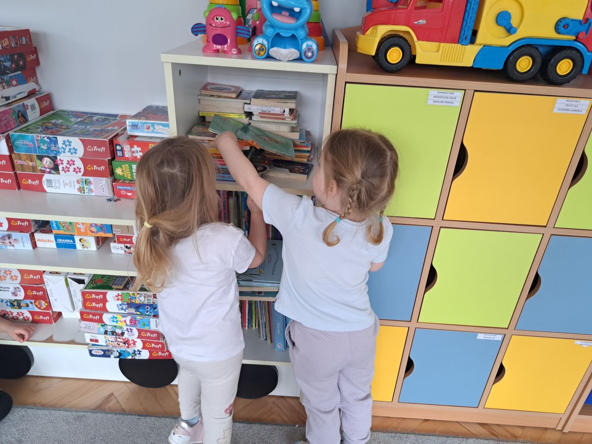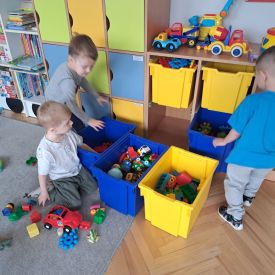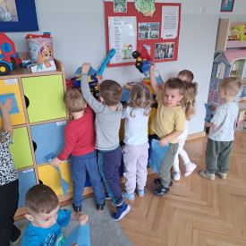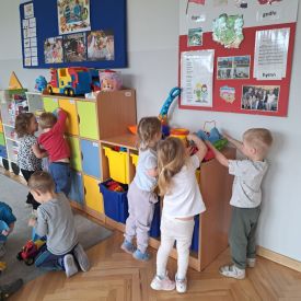 Po lekturze przedszkolaki z entuzjazmem zabrały się do pracy. Maluchy segregowały zabawki, układały książki i puzzle na półkach, wycierały stoliki oraz dbały o porządek w kącikach tematycznych.