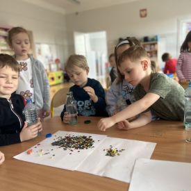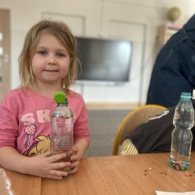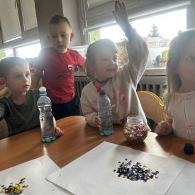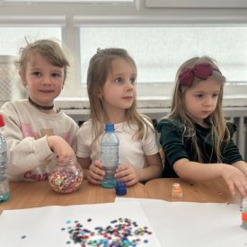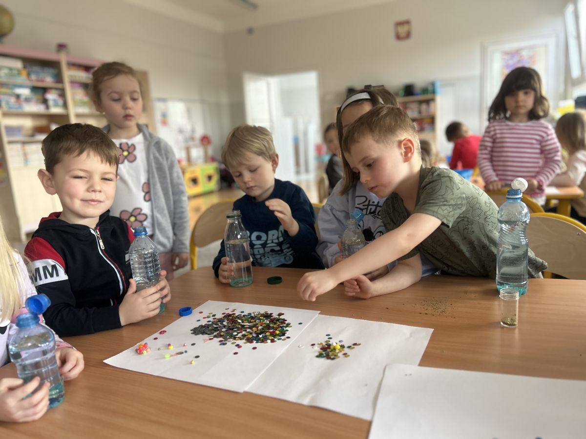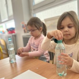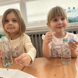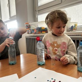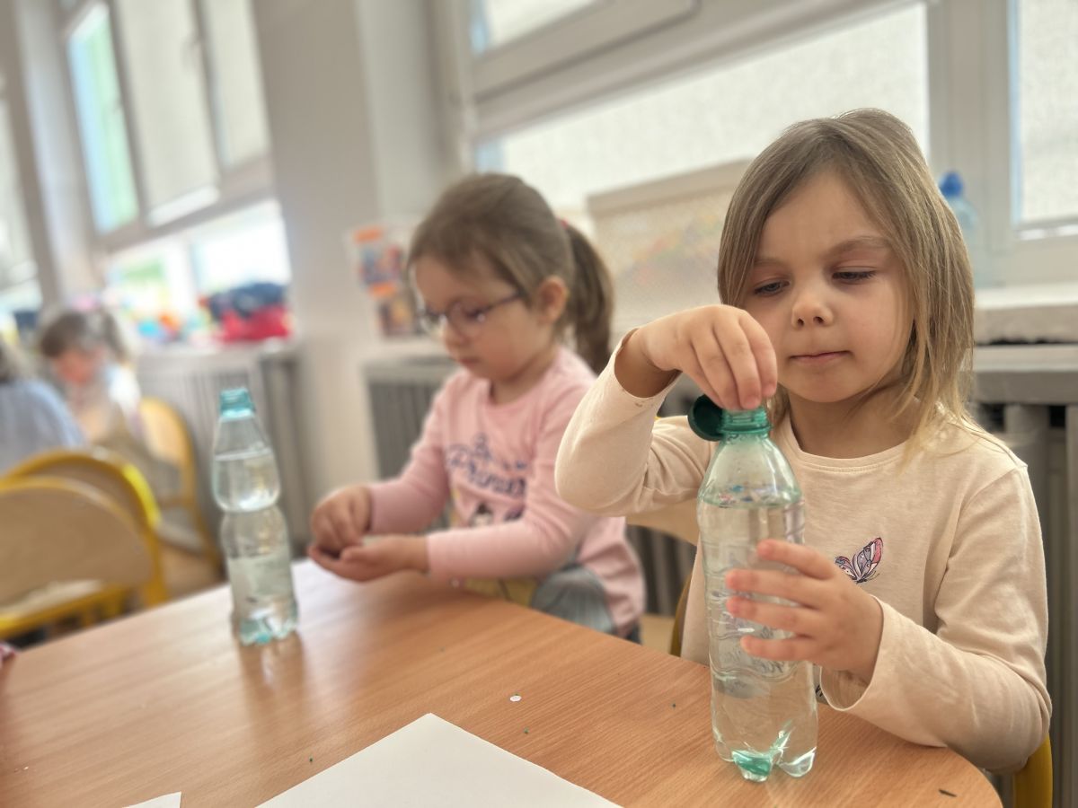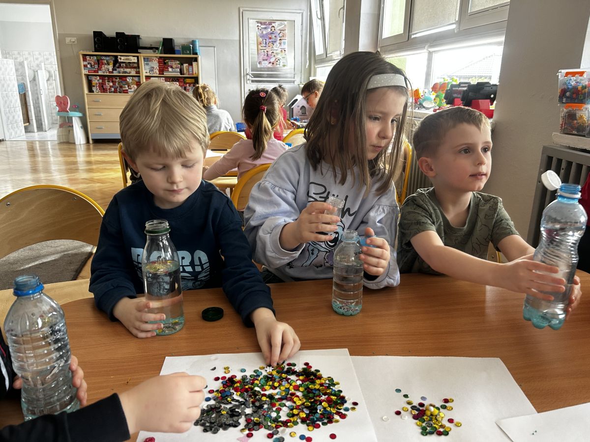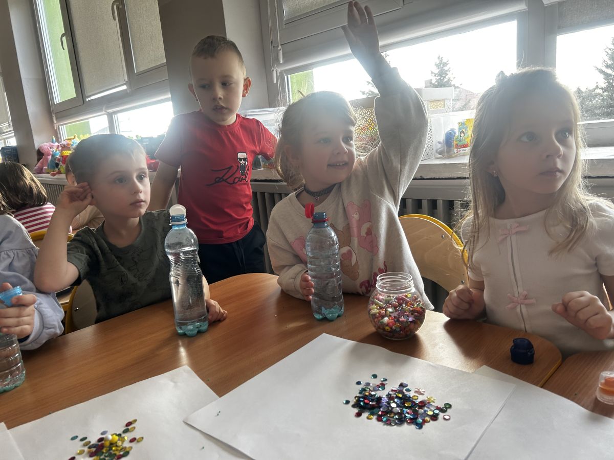 Jeże wzięły udział w ciekawych zajęciach sensorycznych, podczas których samodzielnie wykonały kolorowe butelki sensoryczne. Do przezroczystych butelek dzieci nalały wodę, a następnie dodały brokat, drobne ozdoby i różne błyszczące elementy. Dzięki temu powstały wyjątkowe, mieniące się kolorami kompozycje.