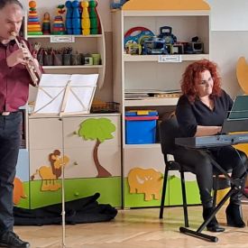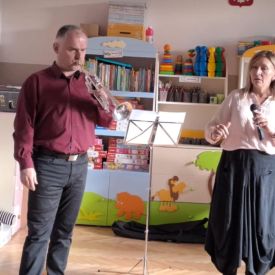 Dzieci mogły też obejrzeć trąbkę – instrument dęty blaszany. Dowiedziały się, z czego się składa, jak wydobywa się z niej dźwięk oraz słuchały jej brzmienia na żywo.