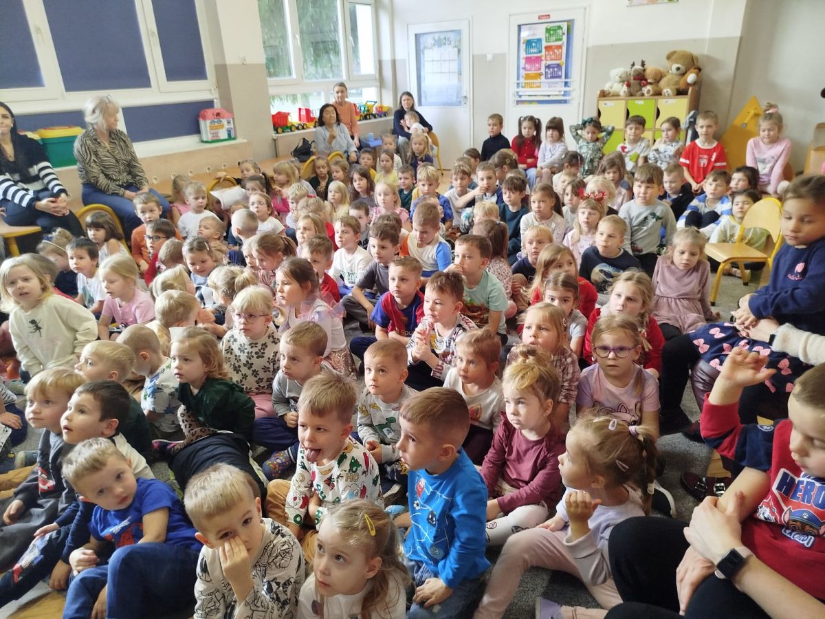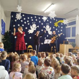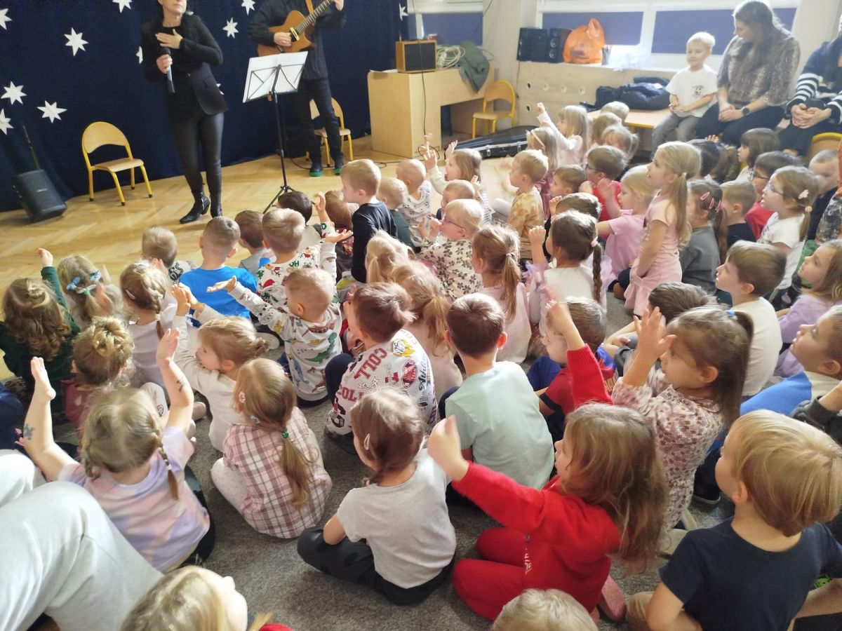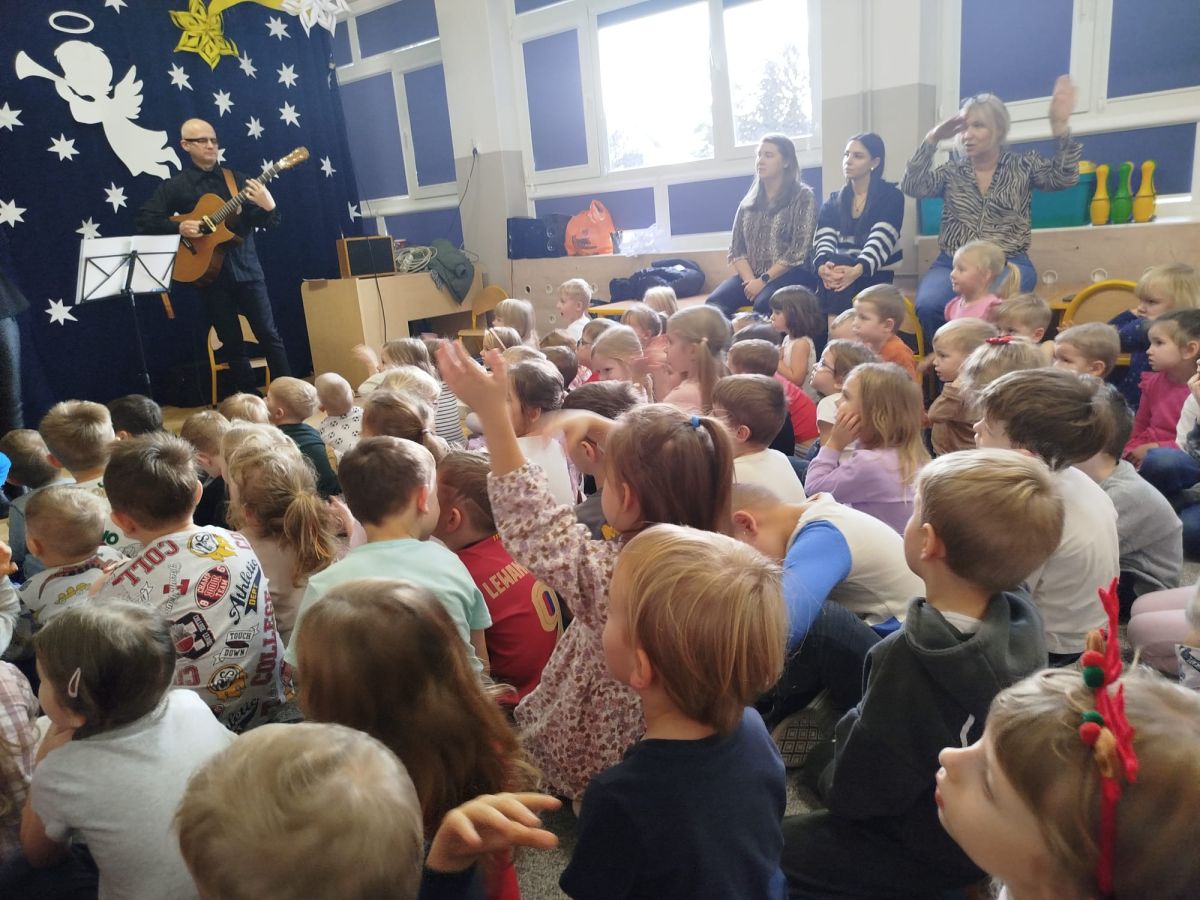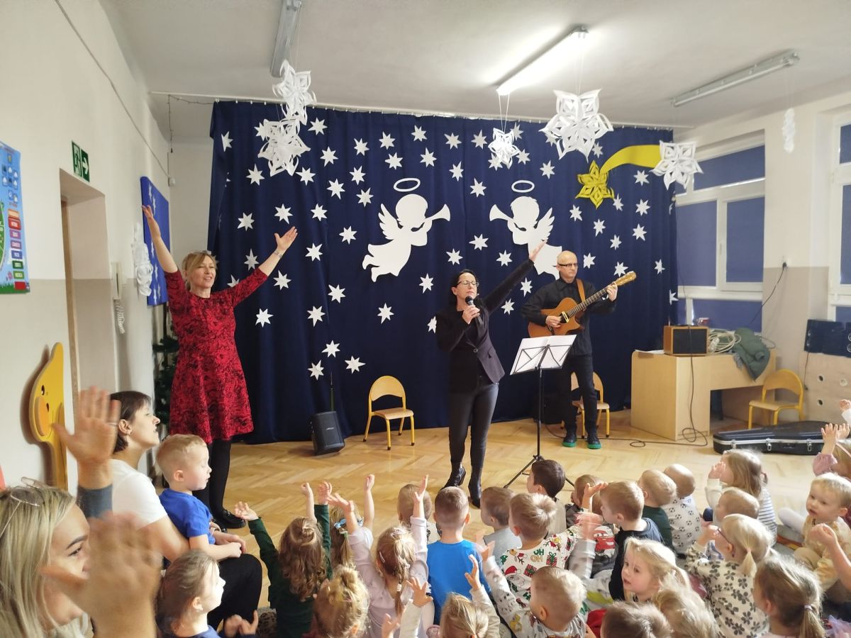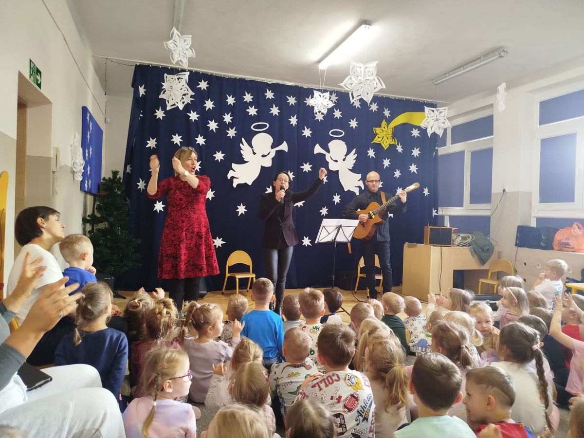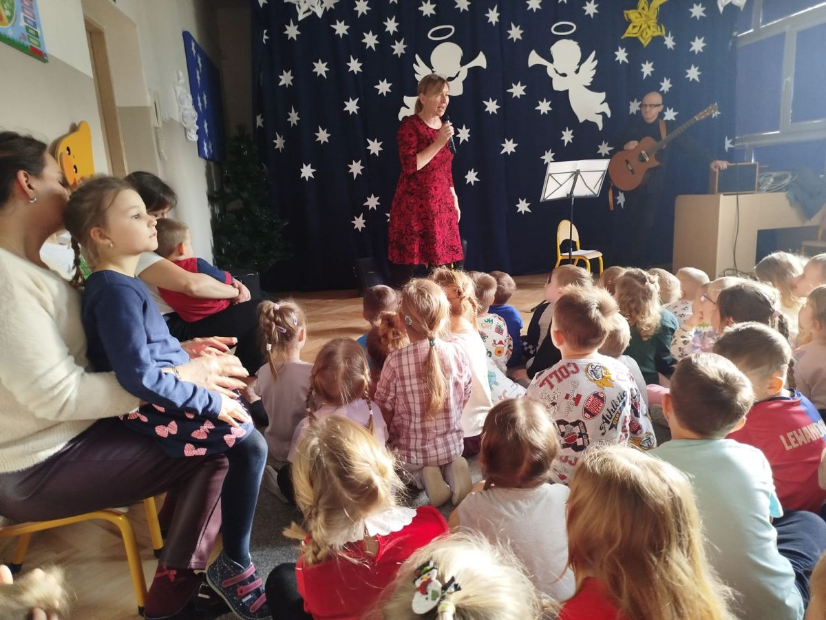 Podczas spotkania przedszkolaki z ogromnym zainteresowaniem słuchały znanych i lubianych utworów, takich jak „Zima, zima, zima”, „Jest taki dzień”, a także pięknych kolęd: „Skrzypi wóz”, „Gore gwiazda” oraz „Przybieżeli do Betlejem”. Muzyka wprowadziła wszystkich w świąteczny nastrój, pełen radości, ciepła i magii nadchodzących Świąt Bożego Narodzenia.