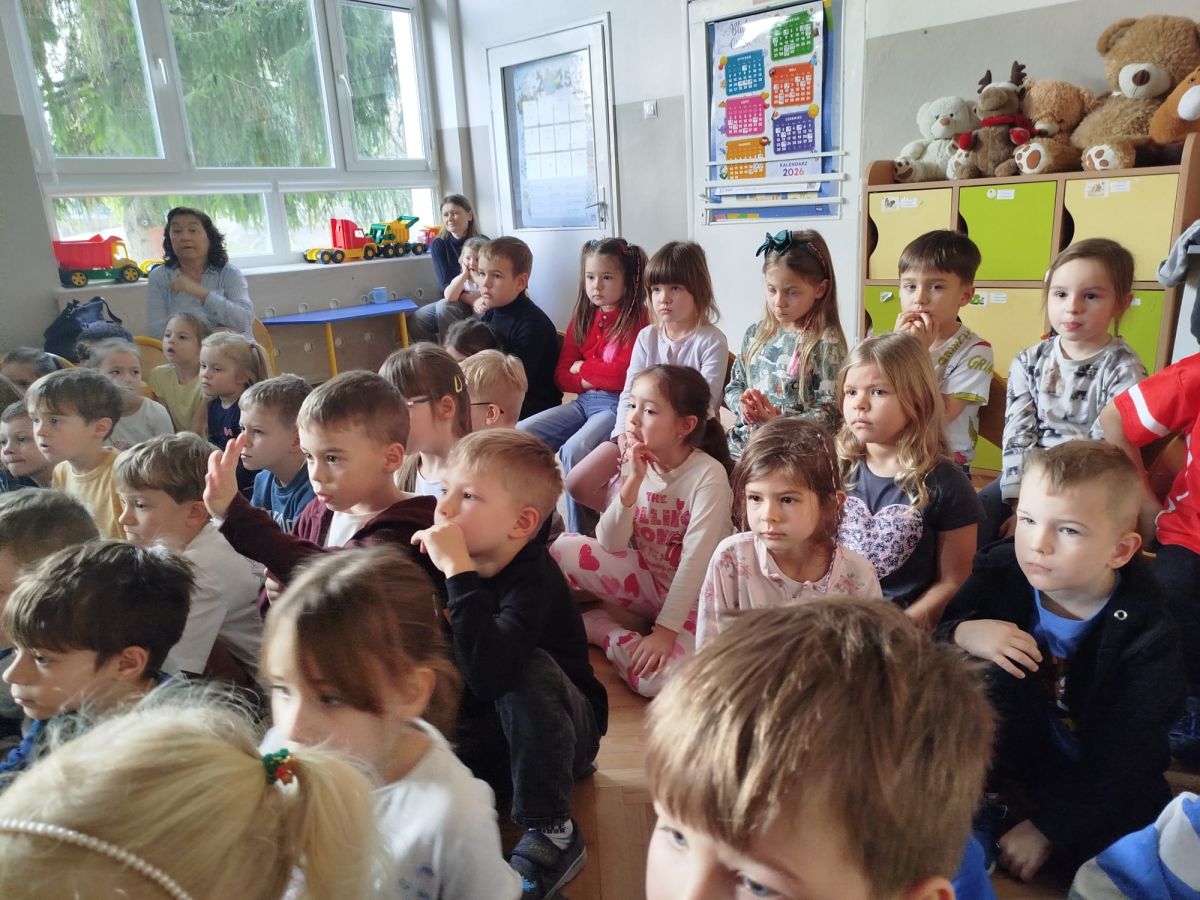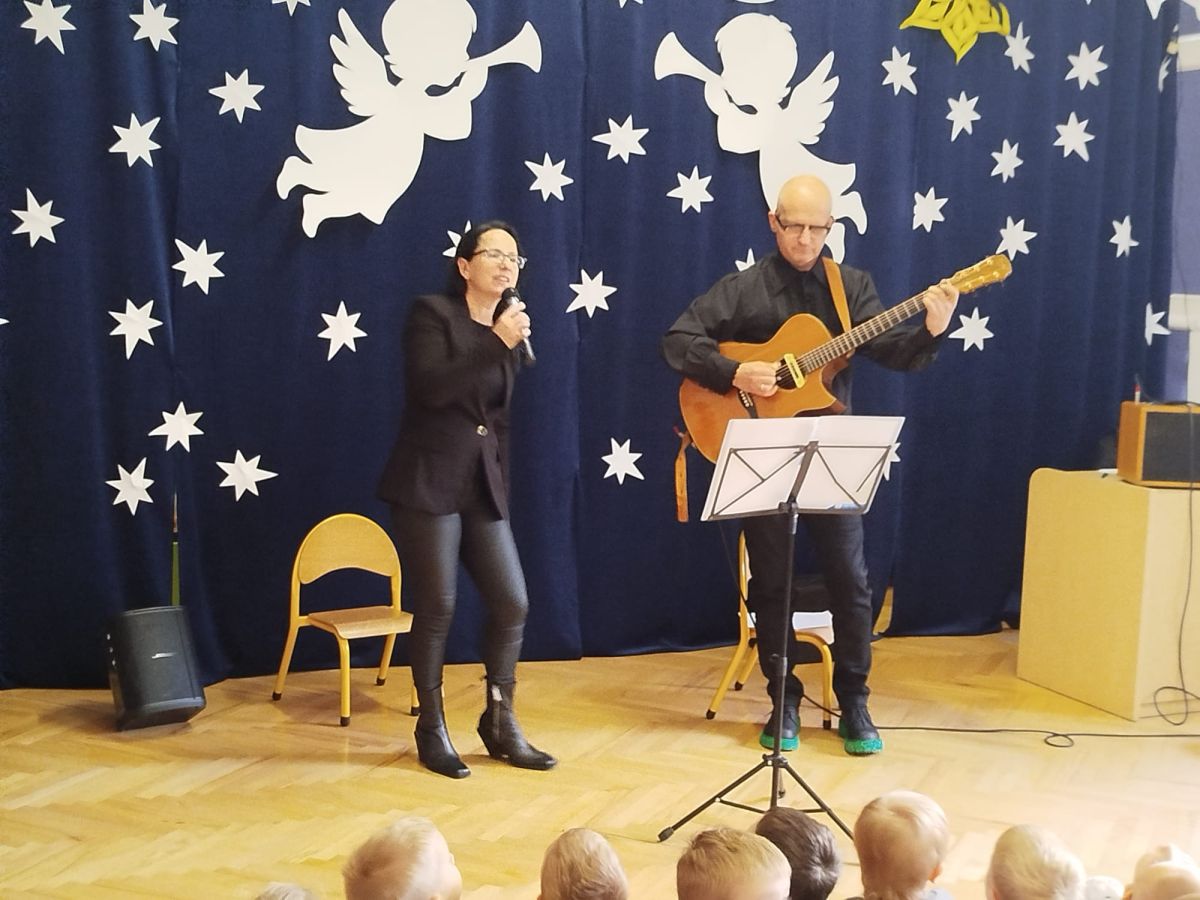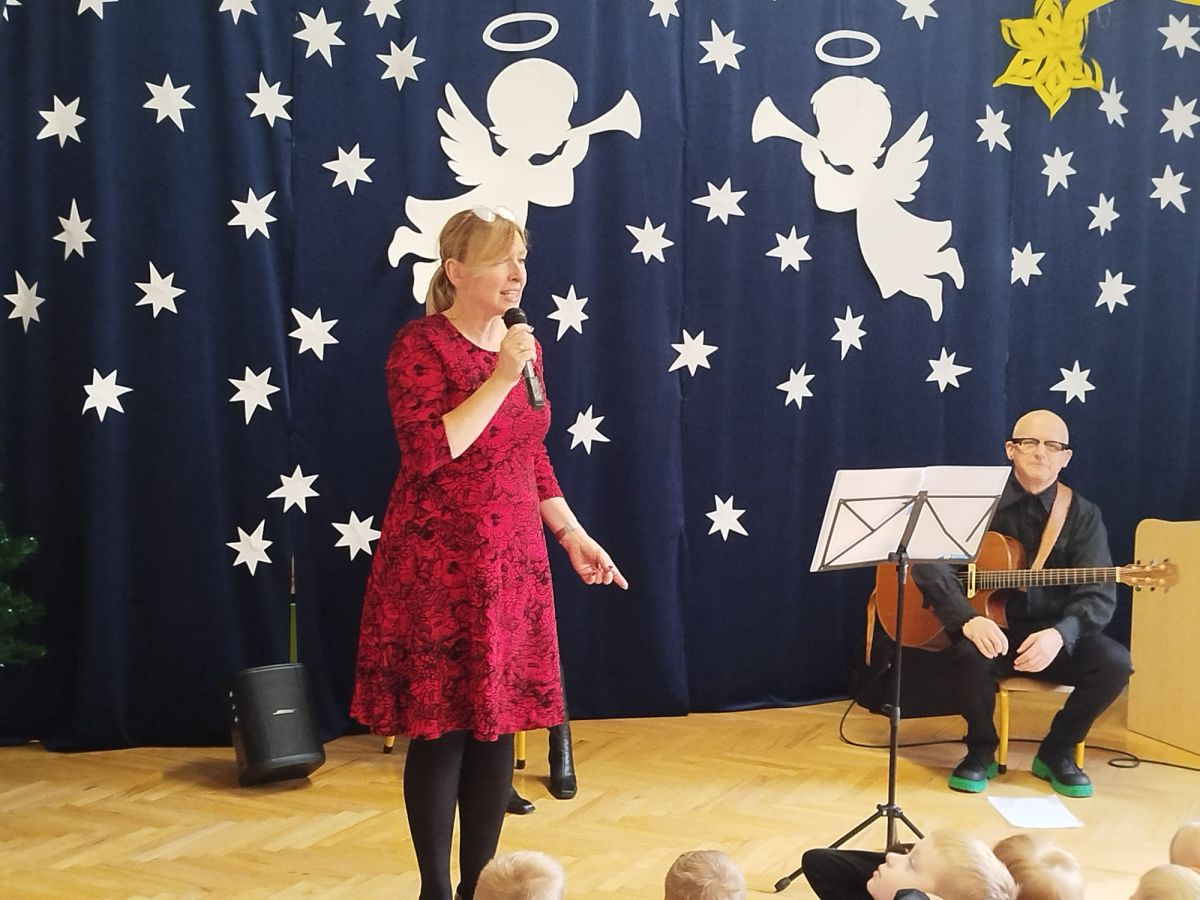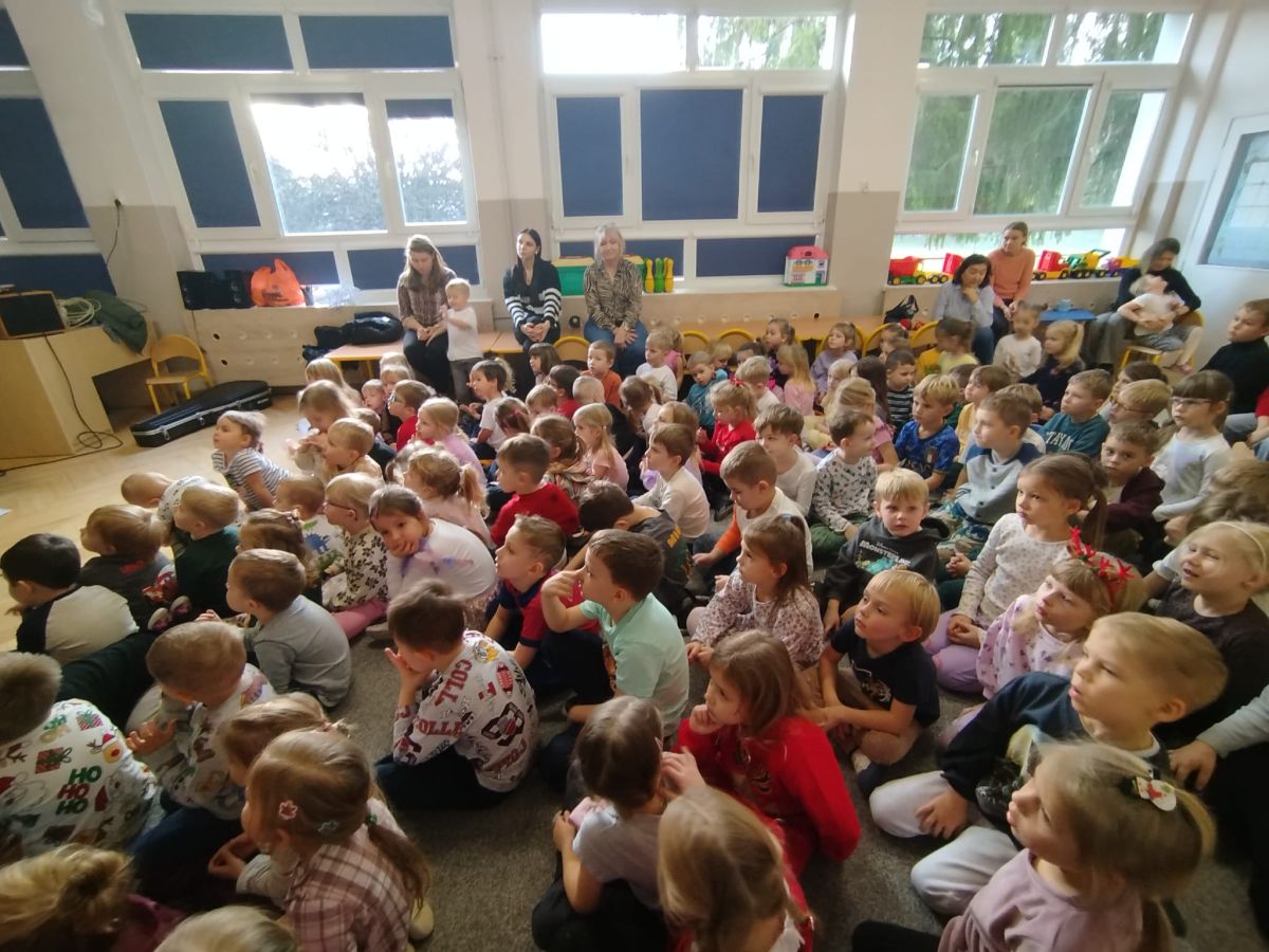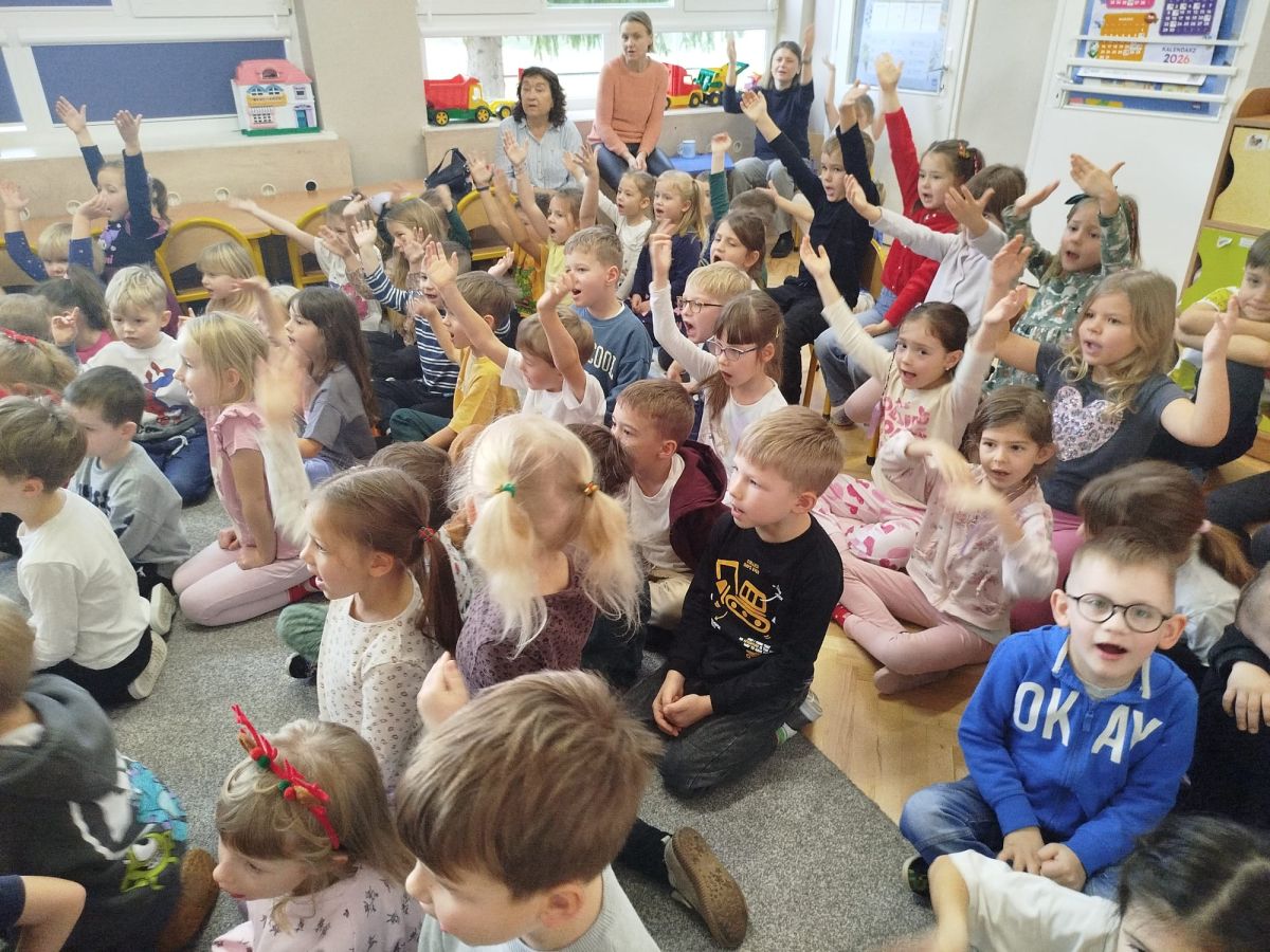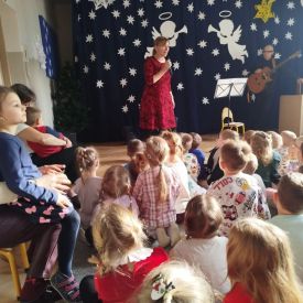 Podczas spotkania przedszkolaki z ogromnym zainteresowaniem słuchały znanych i lubianych utworów, takich jak „Zima, zima, zima”, „Jest taki dzień”, a także pięknych kolęd: „Skrzypi wóz”, „Gore gwiazda” oraz „Przybieżeli do Betlejem”. Muzyka wprowadziła wszystkich w świąteczny nastrój, pełen radości, ciepła i magii nadchodzących Świąt Bożego Narodzenia.