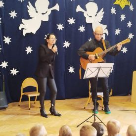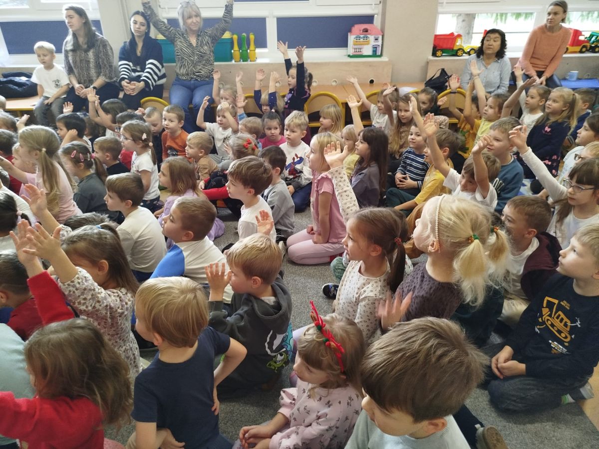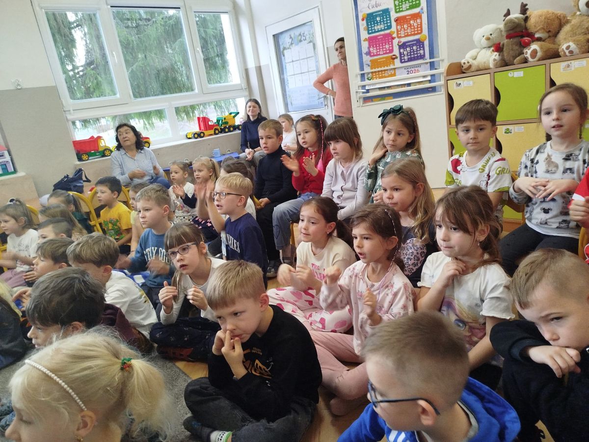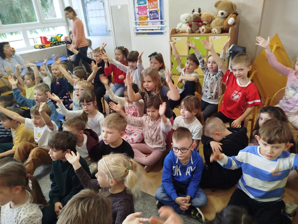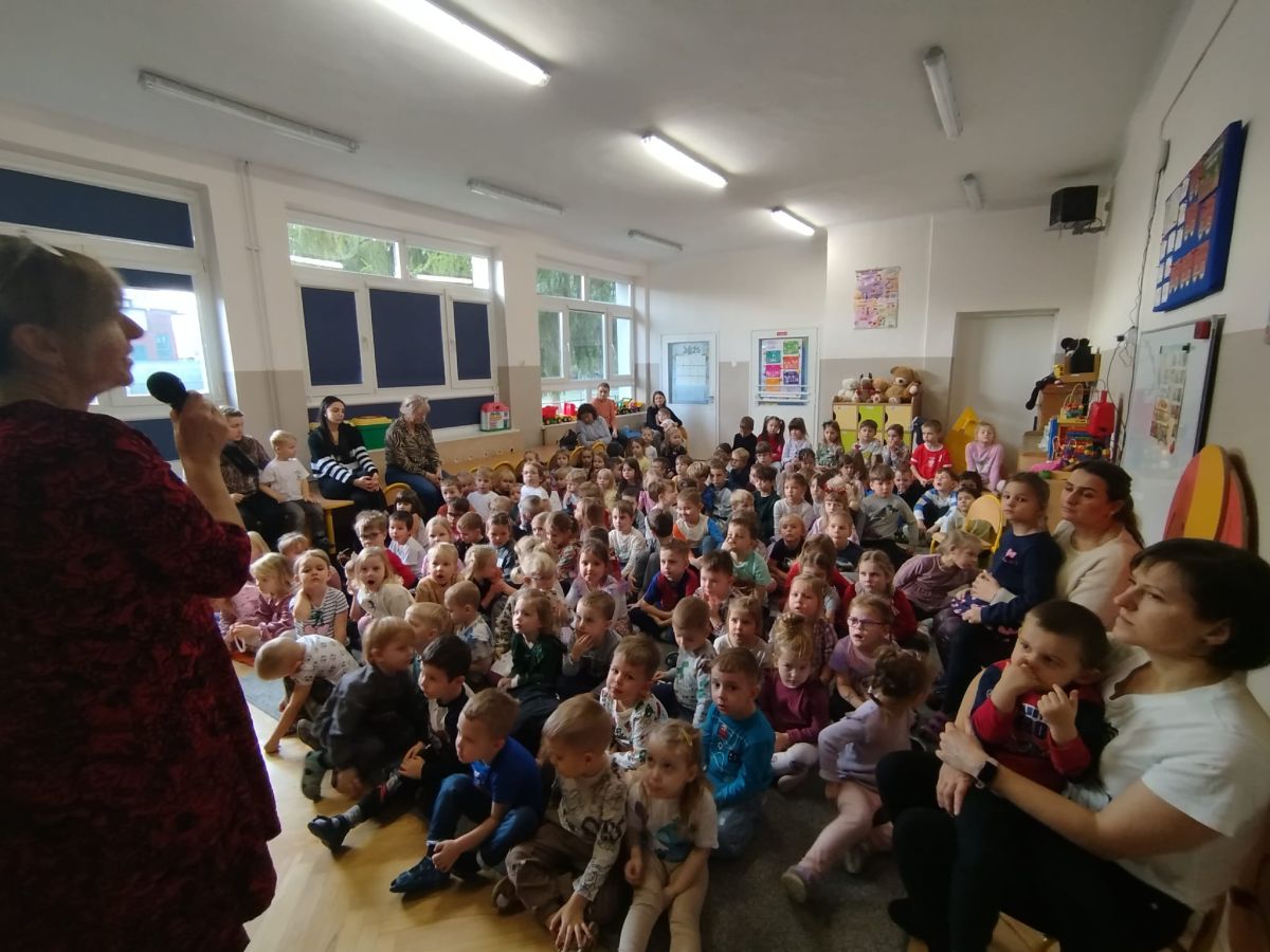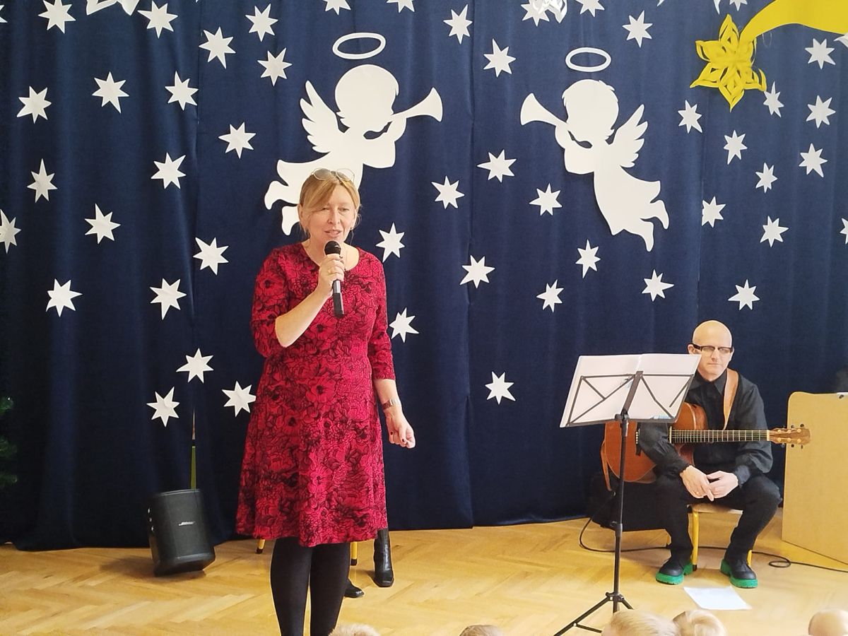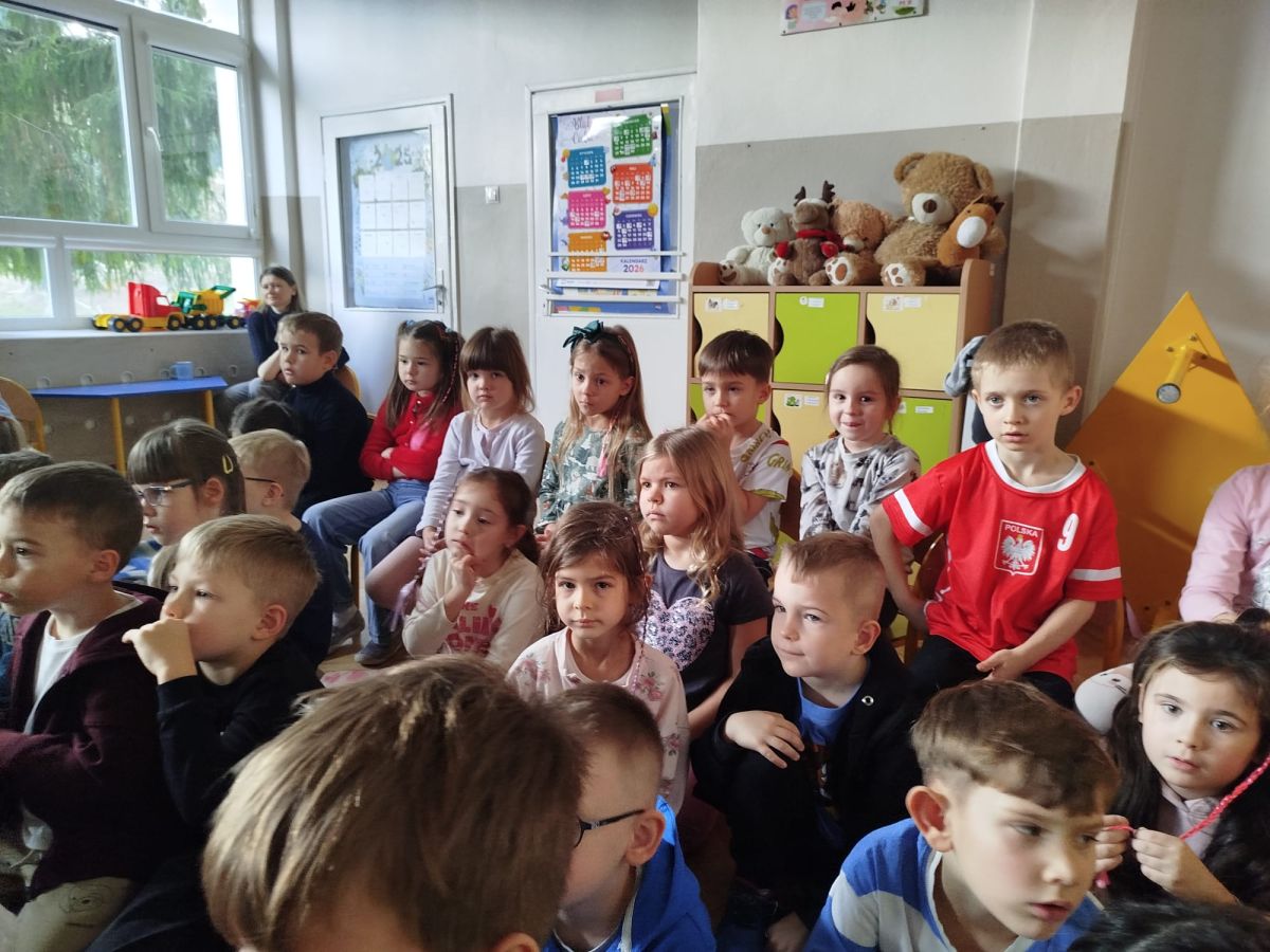 Podczas spotkania przedszkolaki z ogromnym zainteresowaniem słuchały znanych i lubianych utworów, takich jak „Zima, zima, zima”, „Jest taki dzień”, a także pięknych kolęd: „Skrzypi wóz”, „Gore gwiazda” oraz „Przybieżeli do Betlejem”. Muzyka wprowadziła wszystkich w świąteczny nastrój, pełen radości, ciepła i magii nadchodzących Świąt Bożego Narodzenia.