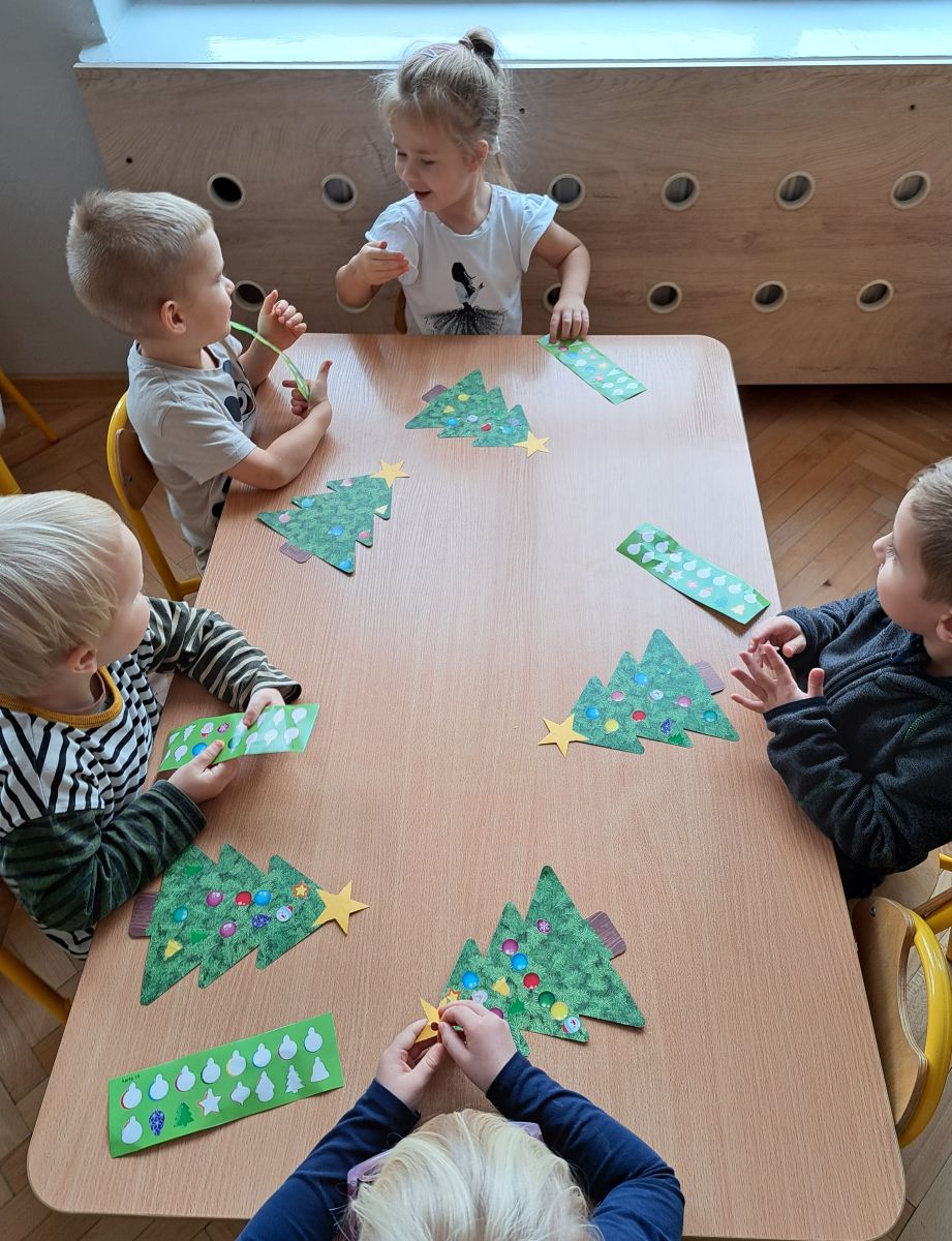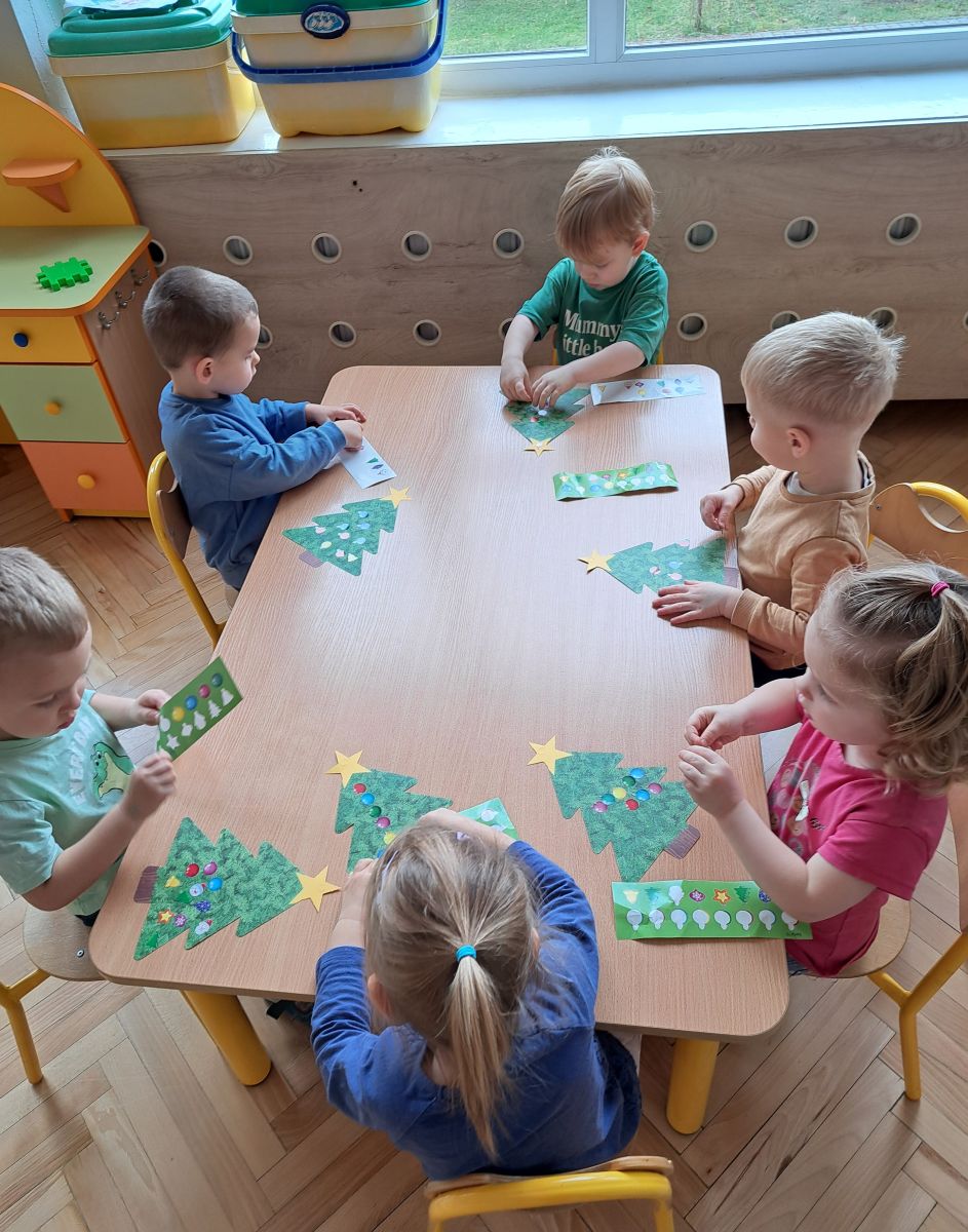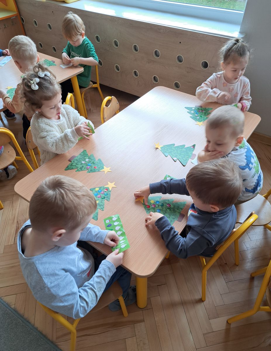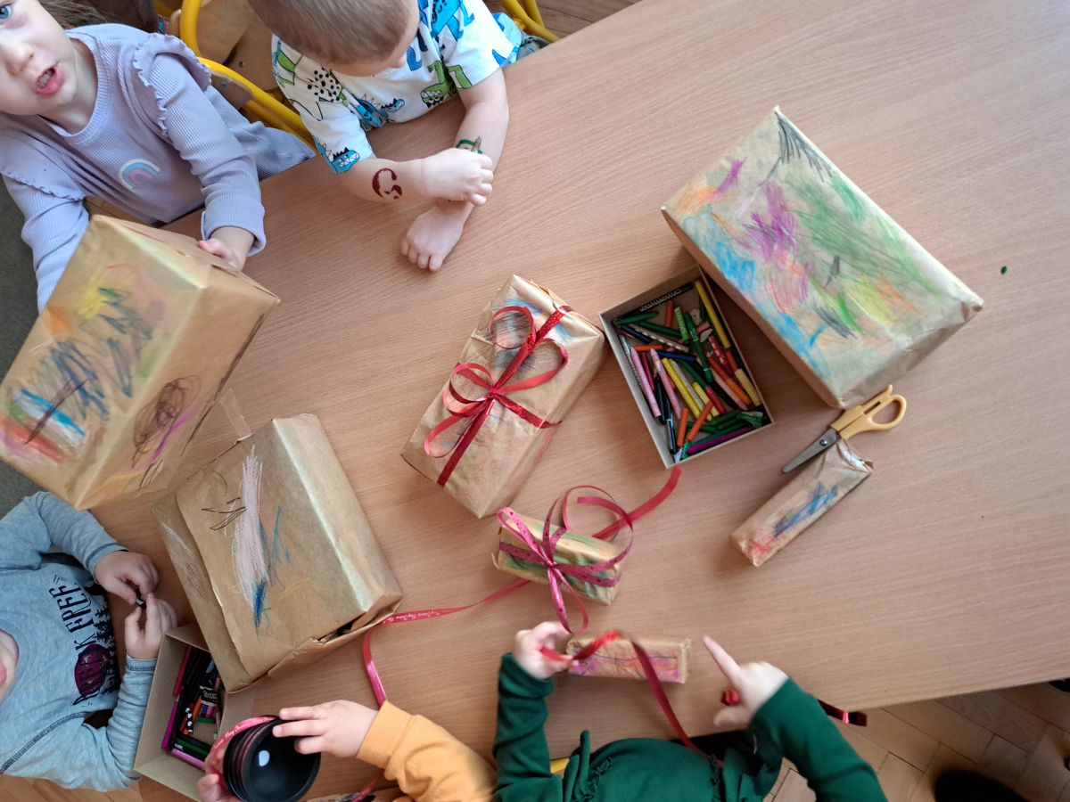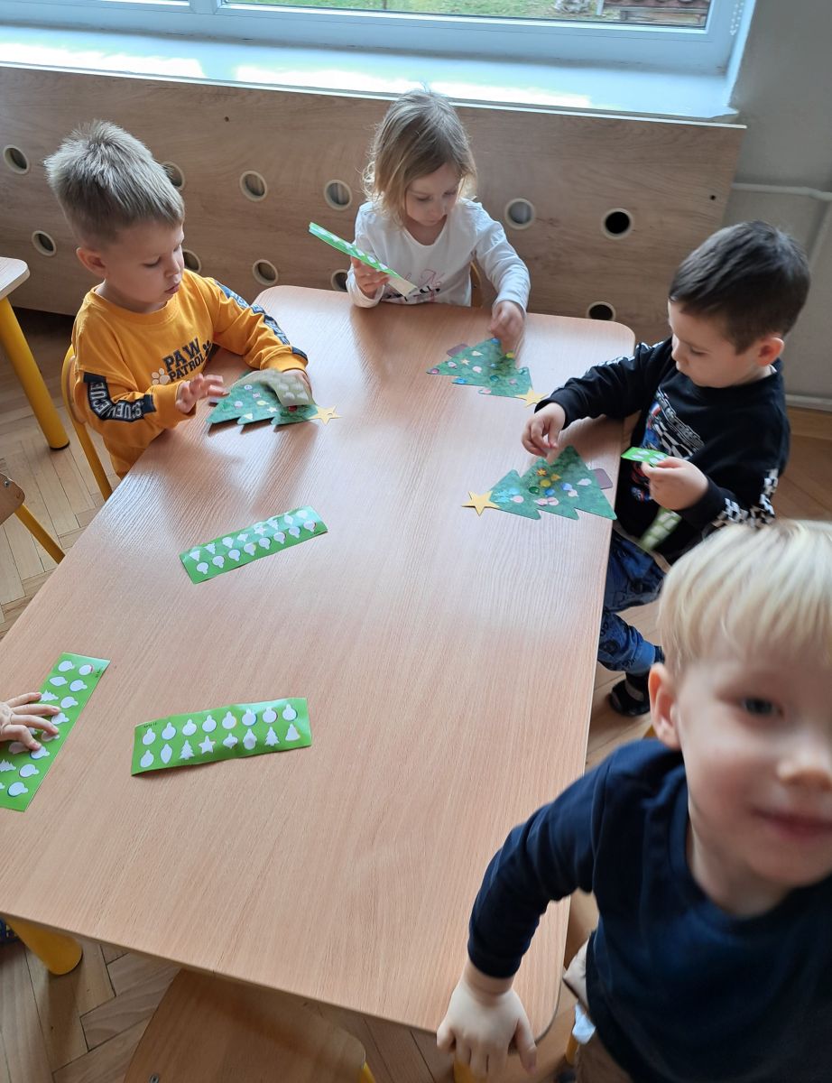 Nasze najmłodsze przedszkolaki z grupy Kotków już od dłuższego czasu z radością przygotowują się do świąt. W sali każdego dnia rozbrzmiewają dźwięki kolęd, a dzieci z wielkim zaangażowaniem włączają się w świąteczne przygotowania. Przedszkolaki chętnie ozdabiały choinki, którymi udekorowaliśmy naszą szatnię. Dzieci pakowały także świąteczne prezenty, które później wykorzystaliśmy do zabaw matematycznych.