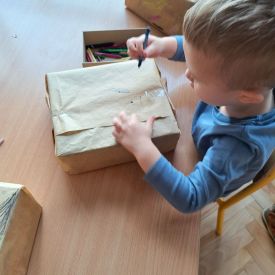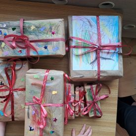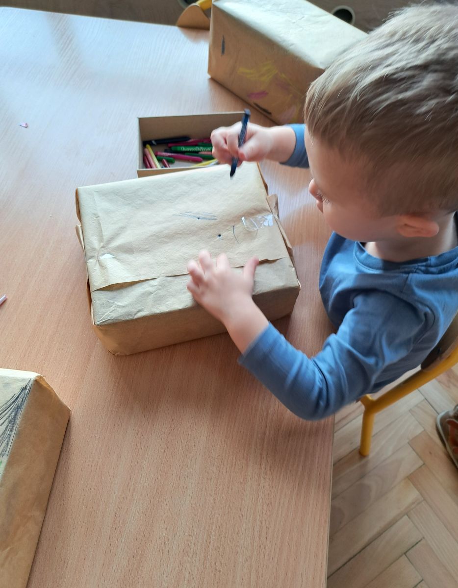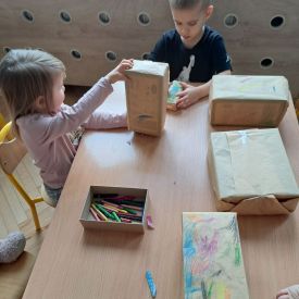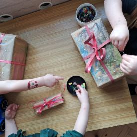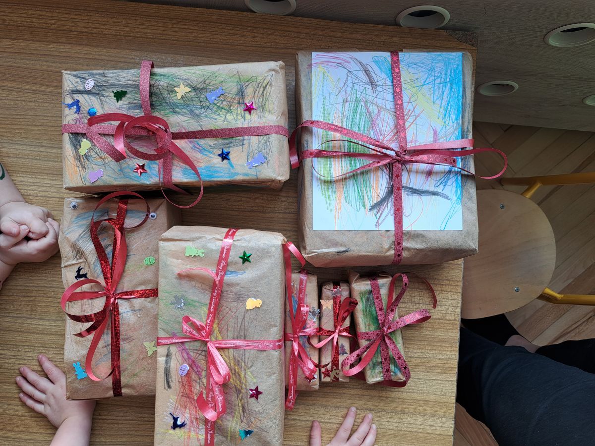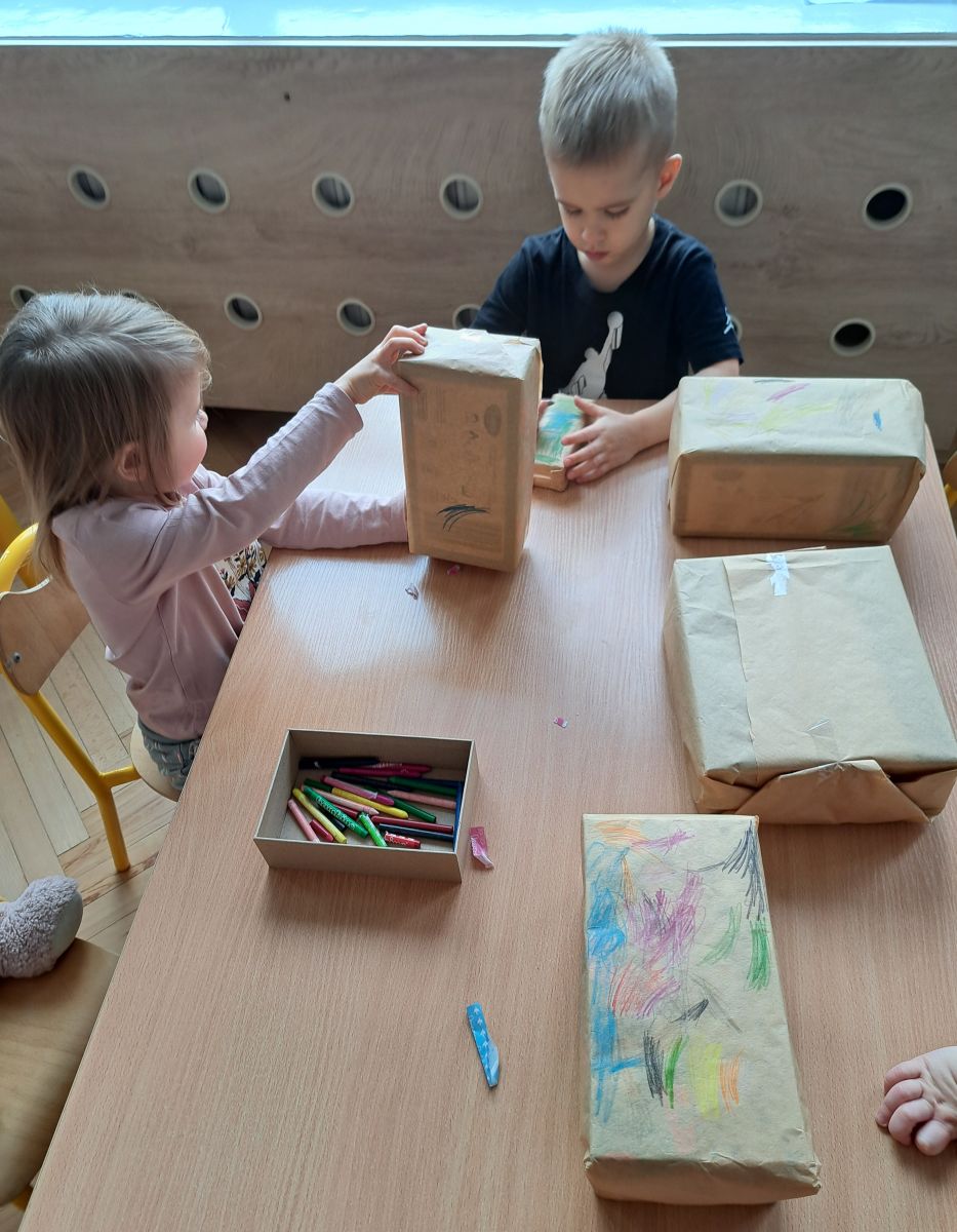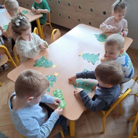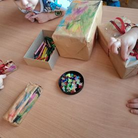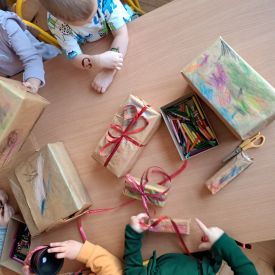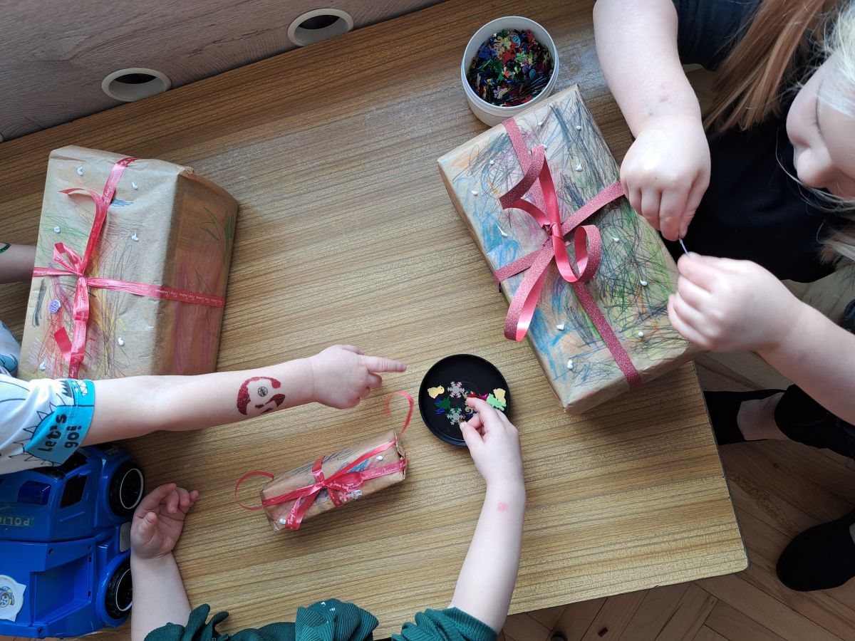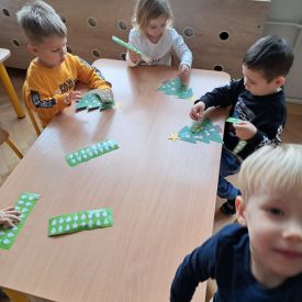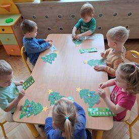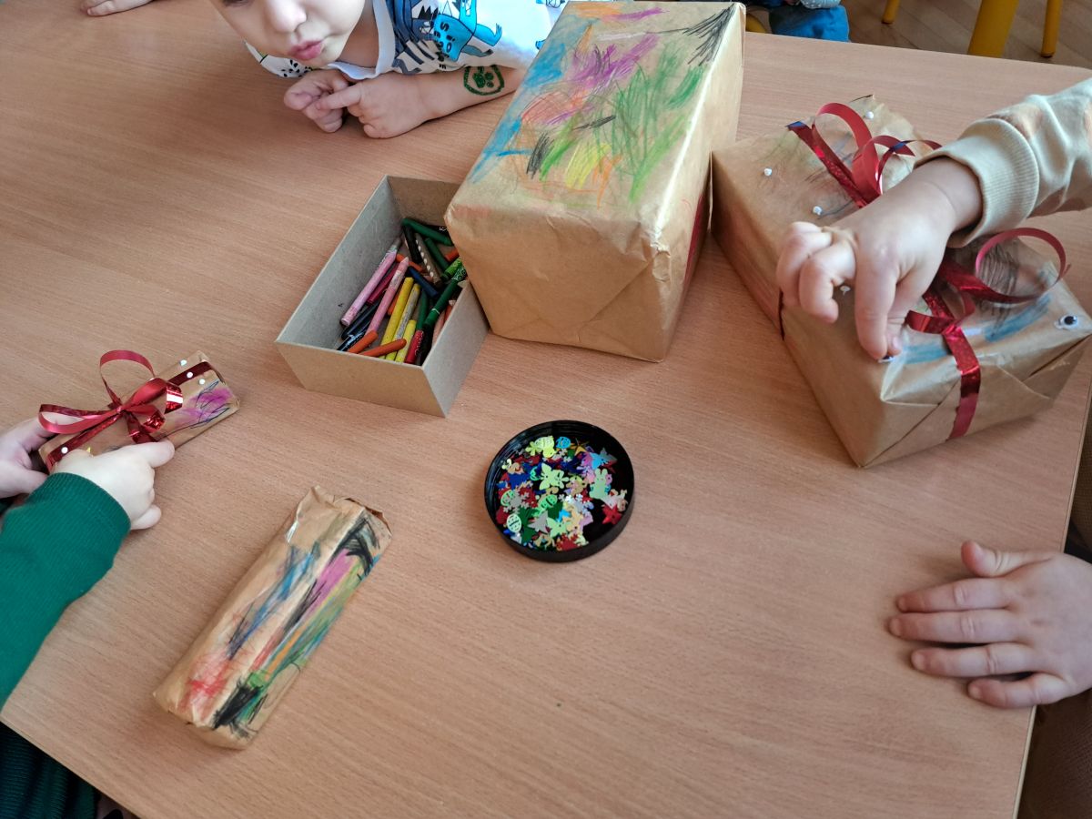 Nasze najmłodsze przedszkolaki z grupy Kotków już od dłuższego czasu z radością przygotowują się do świąt. W sali każdego dnia rozbrzmiewają dźwięki kolęd, a dzieci z wielkim zaangażowaniem włączają się w świąteczne przygotowania. Przedszkolaki chętnie ozdabiały choinki, którymi udekorowaliśmy naszą szatnię. Dzieci pakowały także świąteczne prezenty, które później wykorzystaliśmy do zabaw matematycznych.