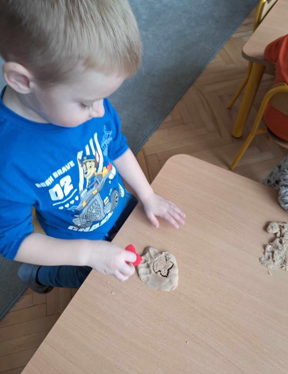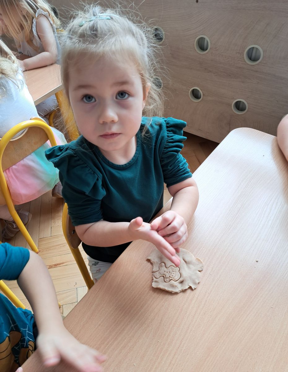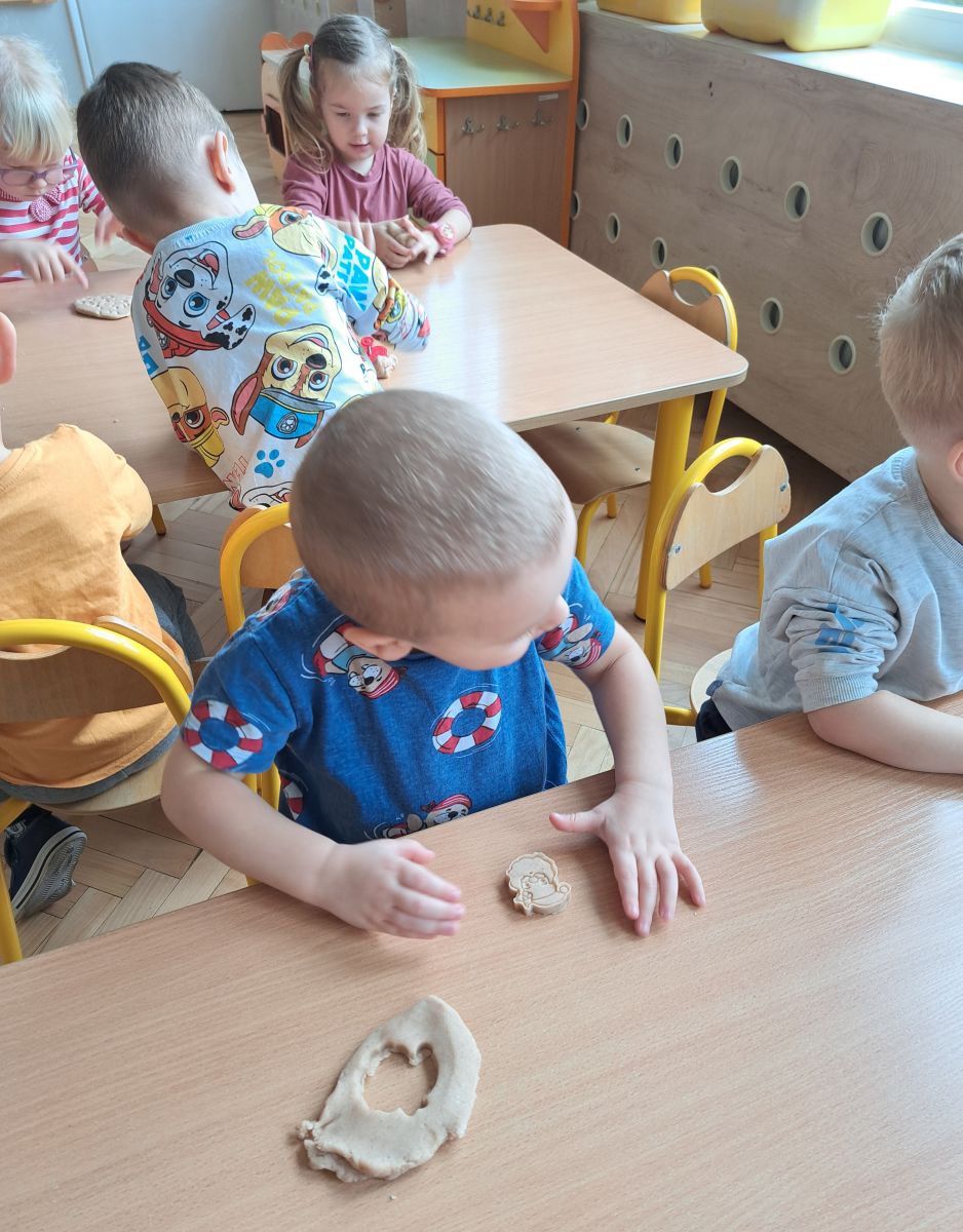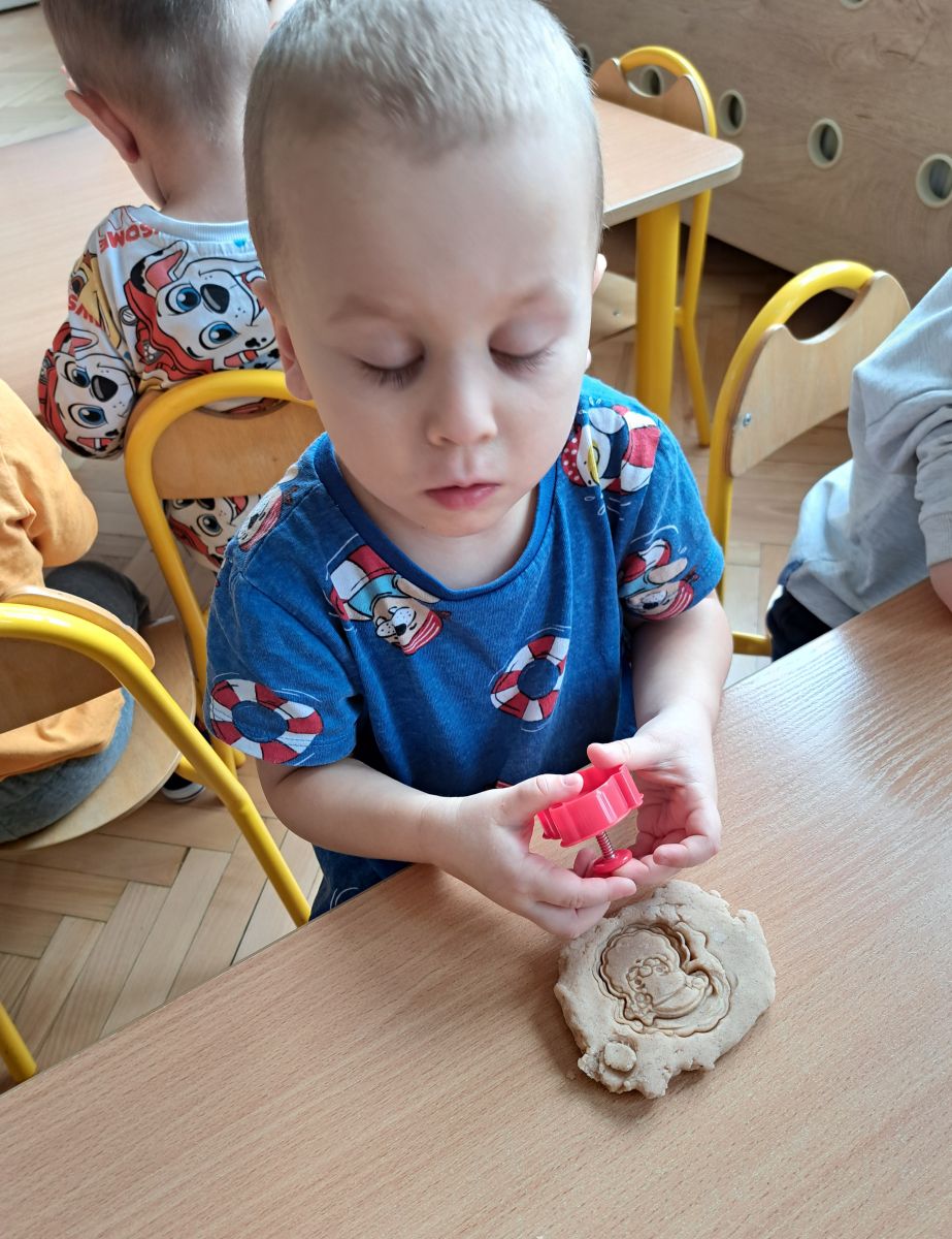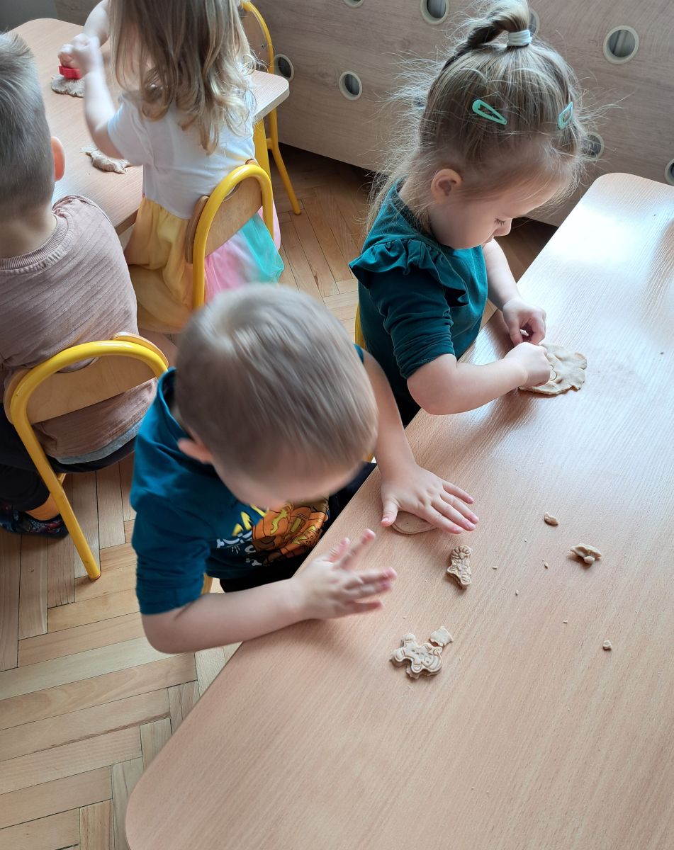 Szczególną radość sprawiły maluchom zabawy sensoryczne. Przedszkolaki robiły świąteczne „pierniki” z ciastoliny pachnącej przyprawą do piernika. Zapach „piernikoliny” unosił się w całej sali, wprowadzając wszystkich w prawdziwie magiczny nastrój. Kotki tworzyły również sensoryczne bombki za pomocą farb ukrytych w magicznych woreczkach. Mieszanie kolorów oraz „przesuwanie” farby za pomocą dłoni było dla dzieci ciekawym doświadczeniem.