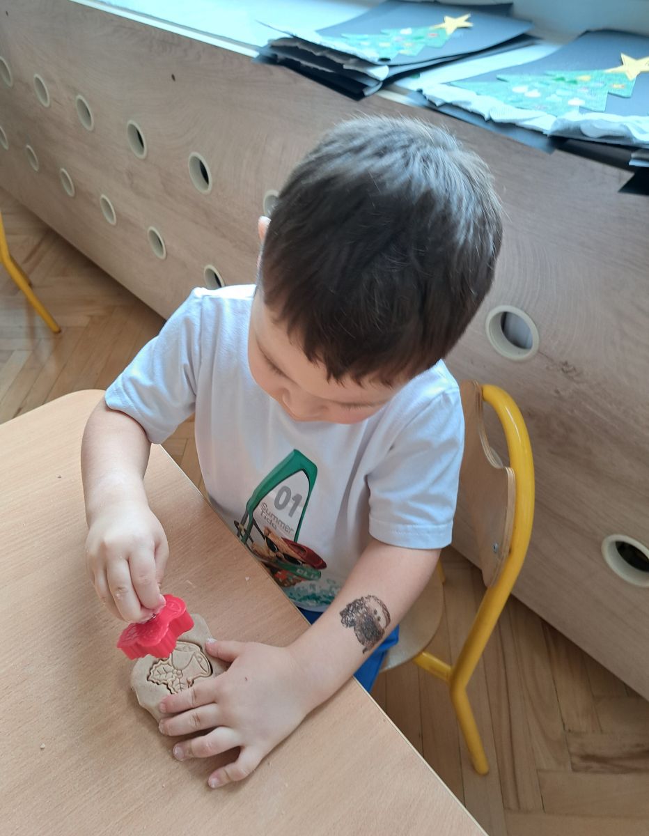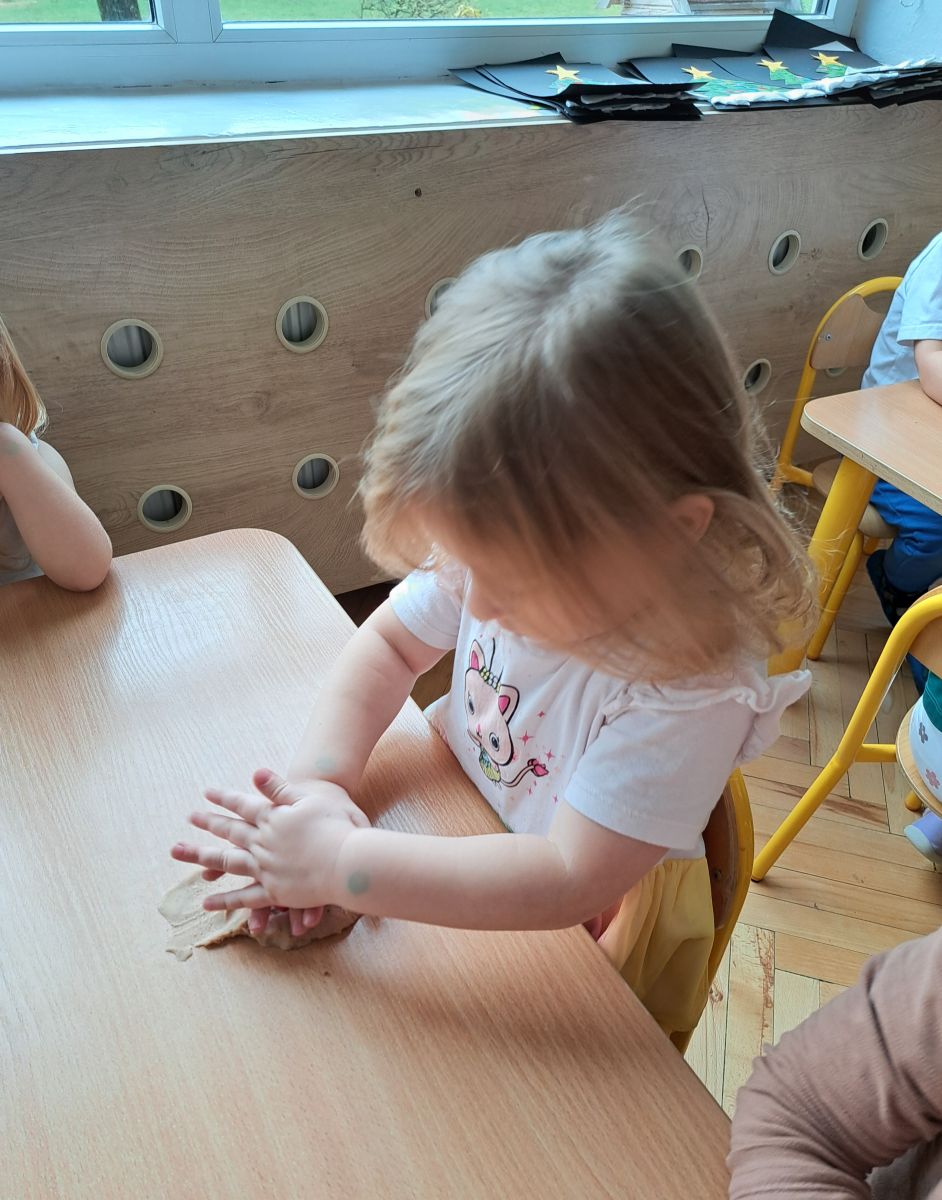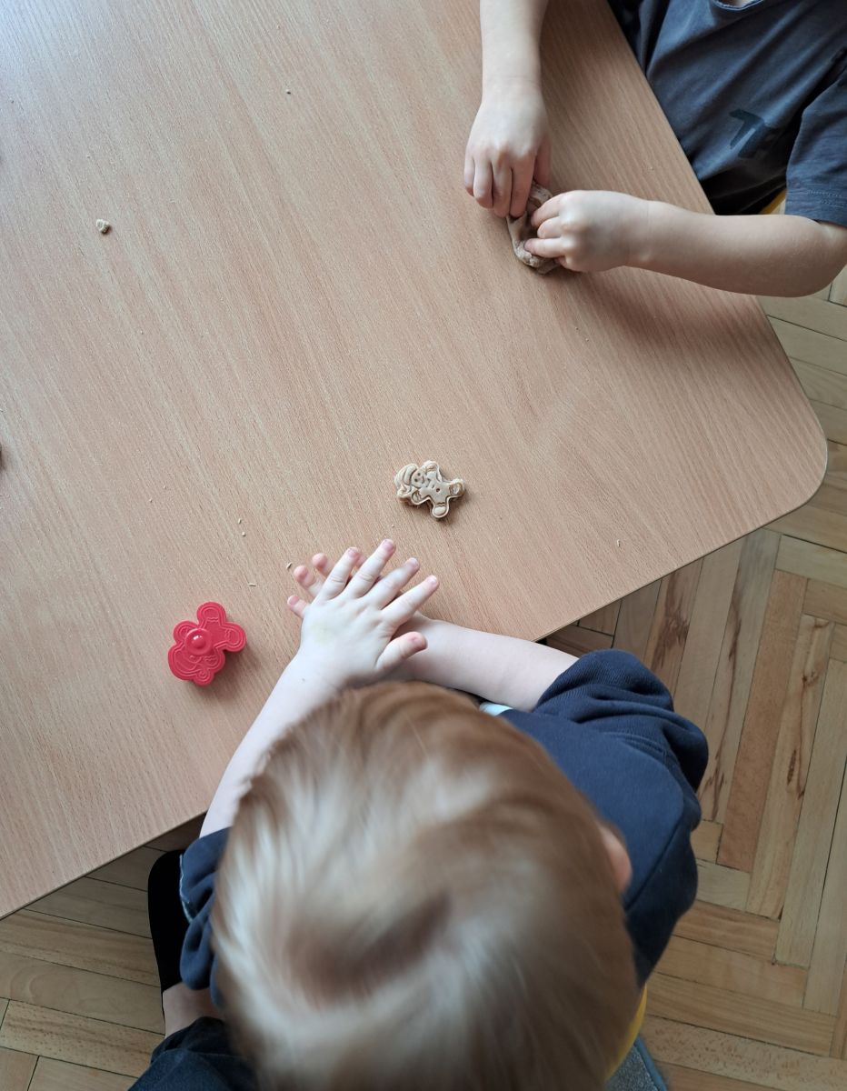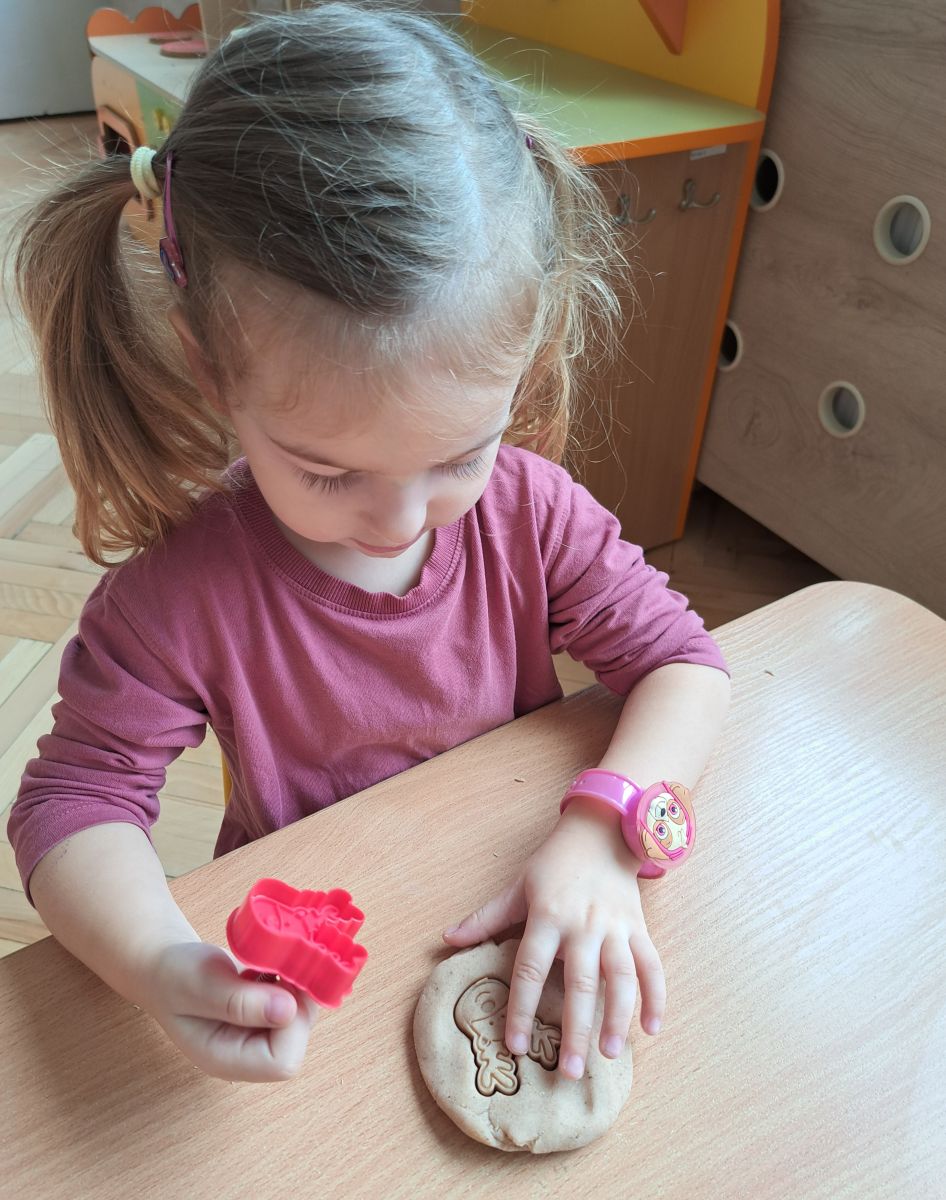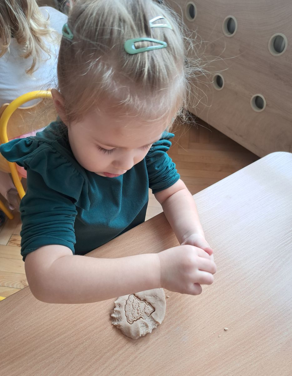 Szczególną radość sprawiły maluchom zabawy sensoryczne. Przedszkolaki robiły świąteczne „pierniki” z ciastoliny pachnącej przyprawą do piernika. Zapach „piernikoliny” unosił się w całej sali, wprowadzając wszystkich w prawdziwie magiczny nastrój. Kotki tworzyły również sensoryczne bombki za pomocą farb ukrytych w magicznych woreczkach. Mieszanie kolorów oraz „przesuwanie” farby za pomocą dłoni było dla dzieci ciekawym doświadczeniem.