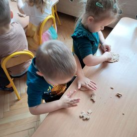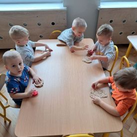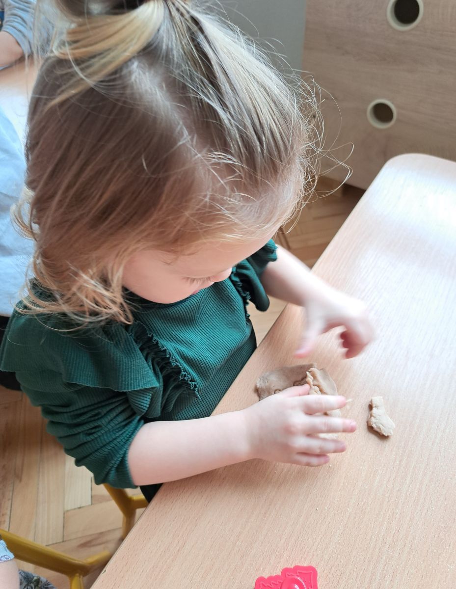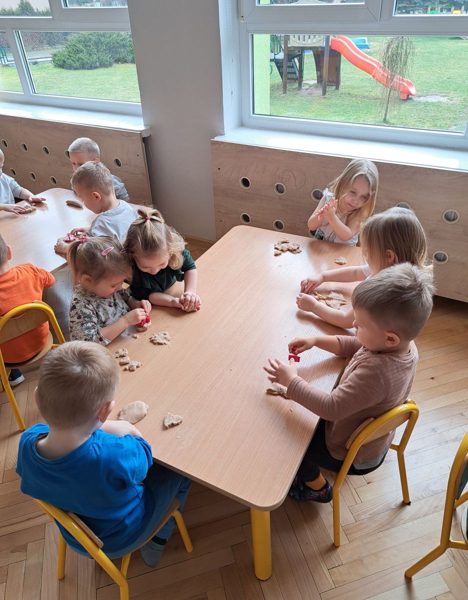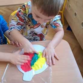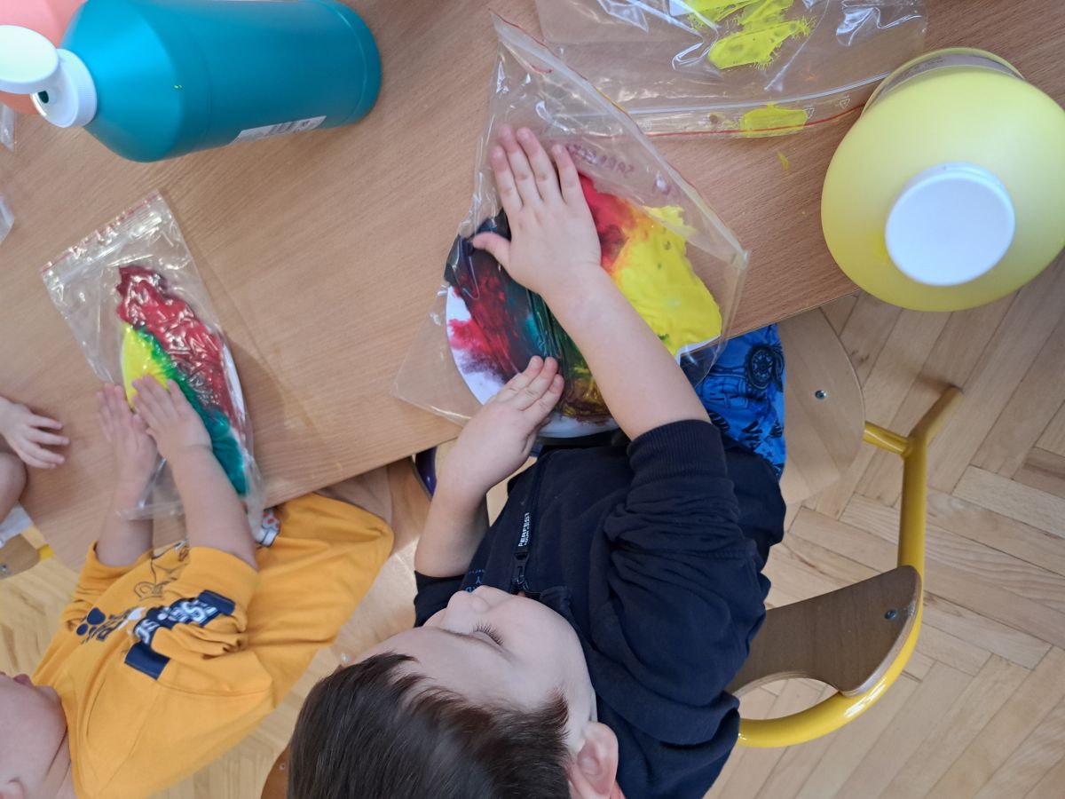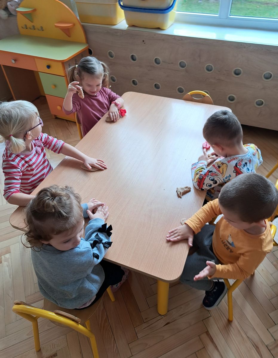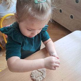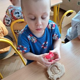Szczególną radość sprawiły maluchom zabawy sensoryczne. Przedszkolaki robiły świąteczne „pierniki” z ciastoliny pachnącej przyprawą do piernika. Zapach „piernikoliny” unosił się w całej sali, wprowadzając wszystkich w prawdziwie magiczny nastrój. Kotki tworzyły również sensoryczne bombki za pomocą farb ukrytych w magicznych woreczkach. Mieszanie kolorów oraz „przesuwanie” farby za pomocą dłoni było dla dzieci ciekawym doświadczeniem.