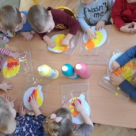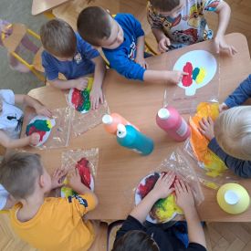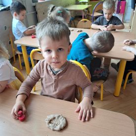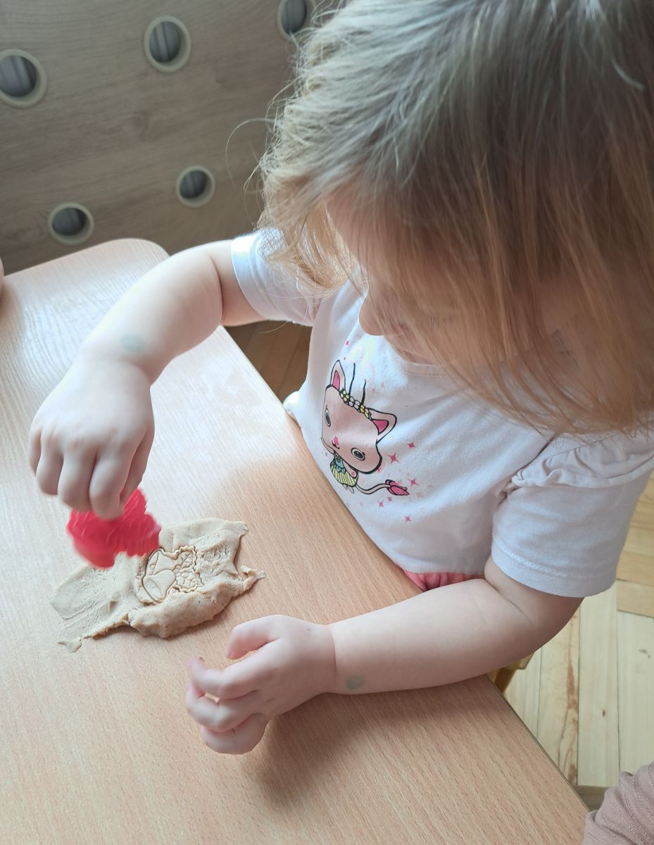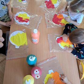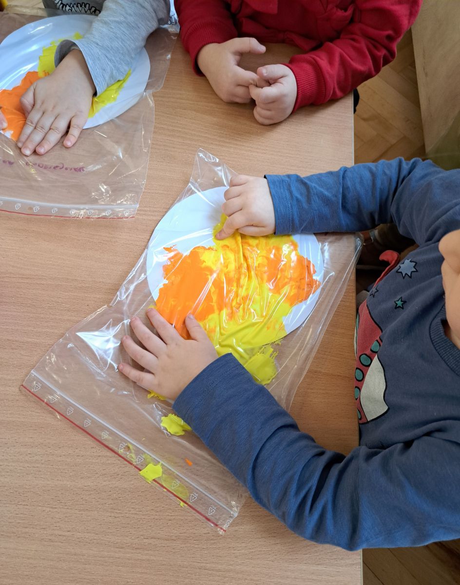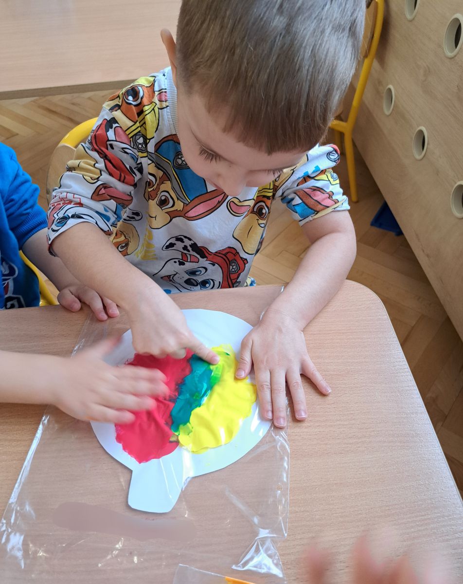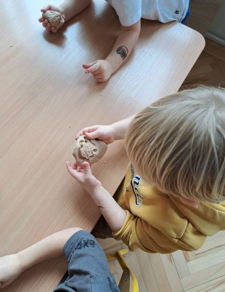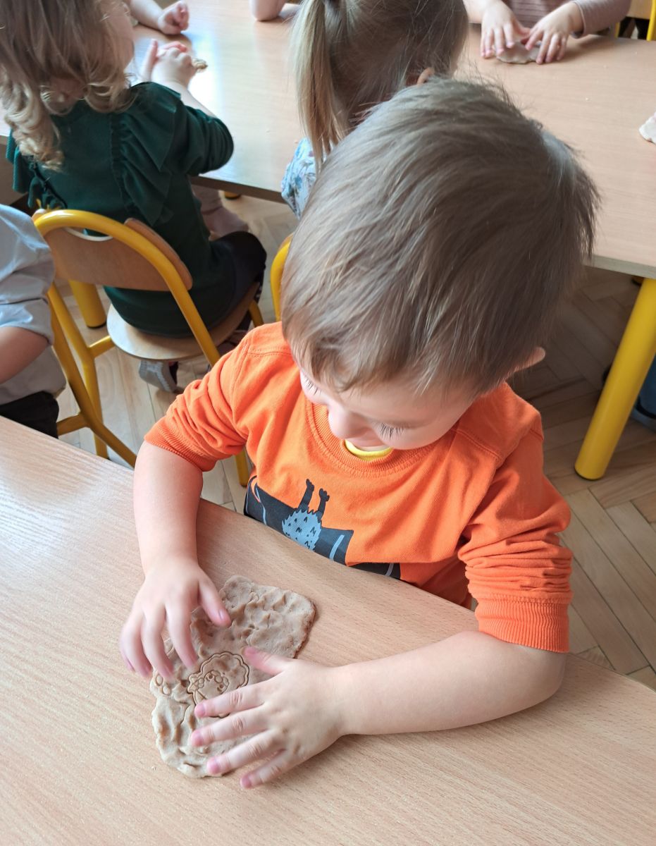 Szczególną radość sprawiły maluchom zabawy sensoryczne. Przedszkolaki robiły świąteczne „pierniki” z ciastoliny pachnącej przyprawą do piernika. Zapach „piernikoliny” unosił się w całej sali, wprowadzając wszystkich w prawdziwie magiczny nastrój. Kotki tworzyły również sensoryczne bombki za pomocą farb ukrytych w magicznych woreczkach. Mieszanie kolorów oraz „przesuwanie” farby za pomocą dłoni było dla dzieci ciekawym doświadczeniem.