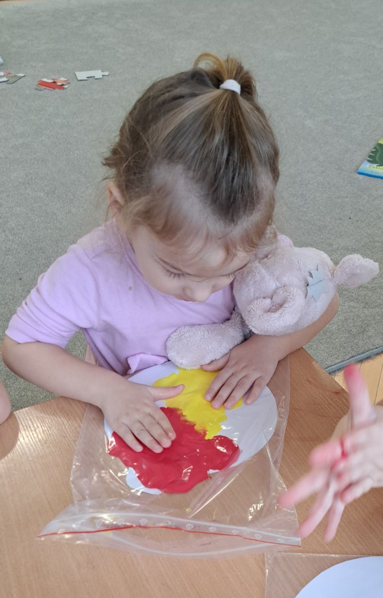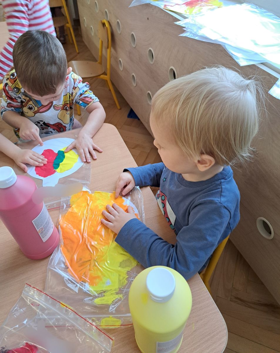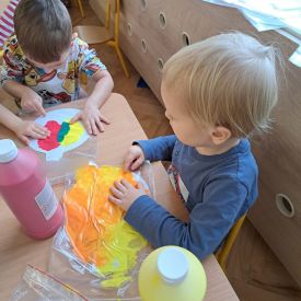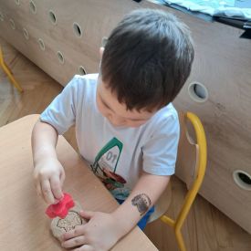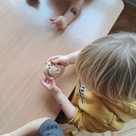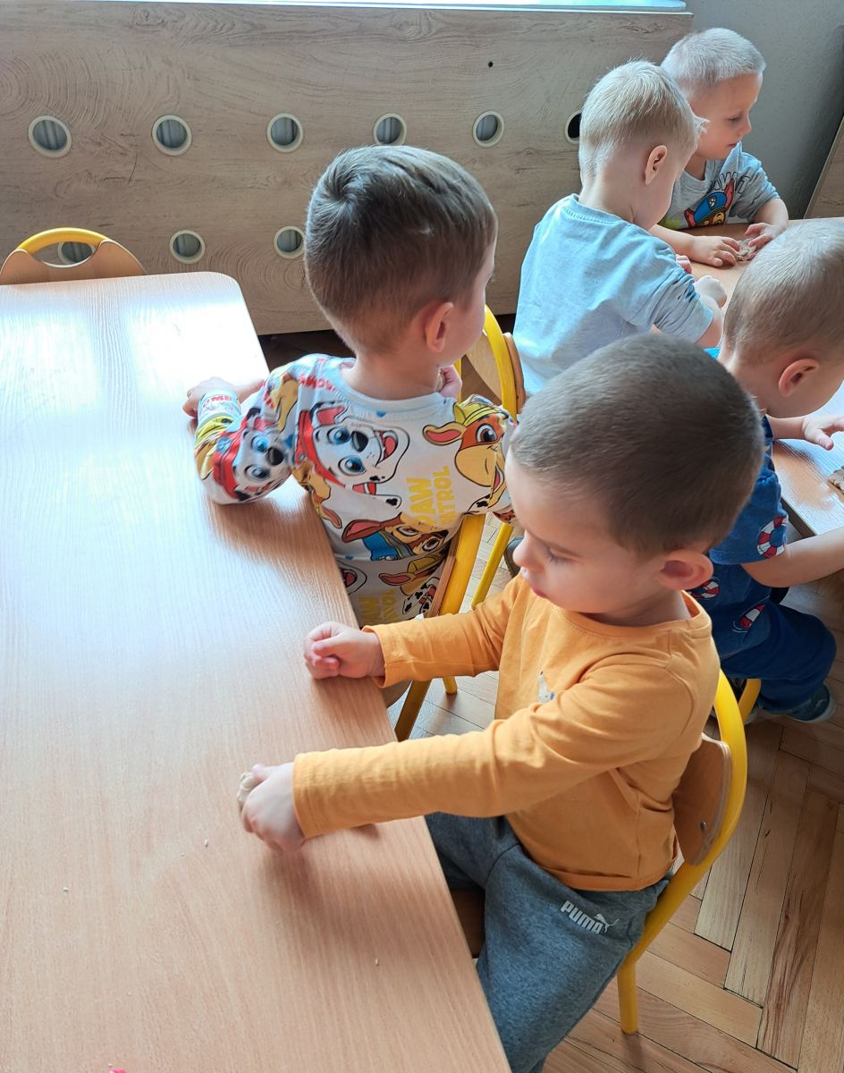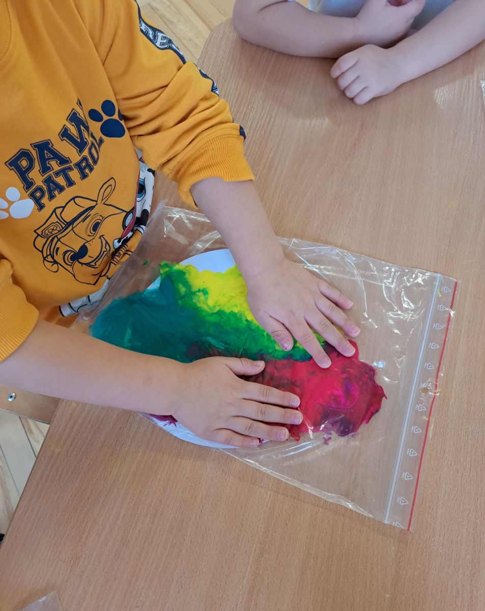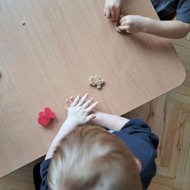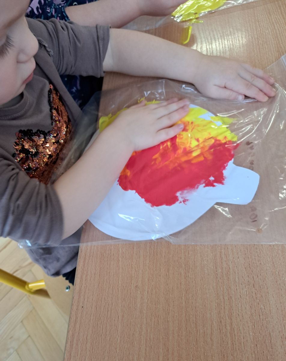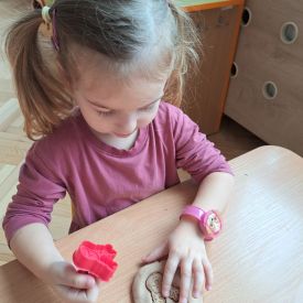 Szczególną radość sprawiły maluchom zabawy sensoryczne. Przedszkolaki robiły świąteczne „pierniki” z ciastoliny pachnącej przyprawą do piernika. Zapach „piernikoliny” unosił się w całej sali, wprowadzając wszystkich w prawdziwie magiczny nastrój. Kotki tworzyły również sensoryczne bombki za pomocą farb ukrytych w magicznych woreczkach. Mieszanie kolorów oraz „przesuwanie” farby za pomocą dłoni było dla dzieci ciekawym doświadczeniem.