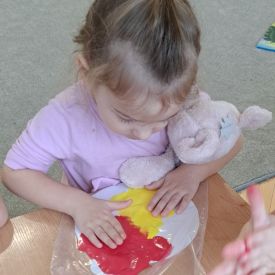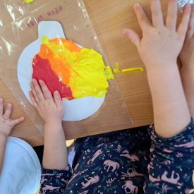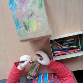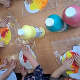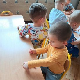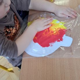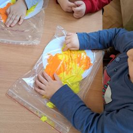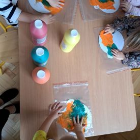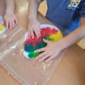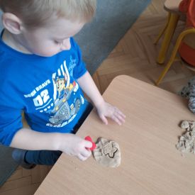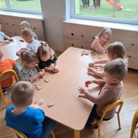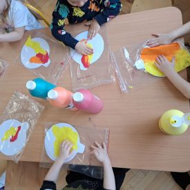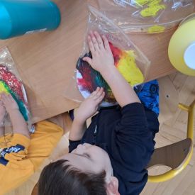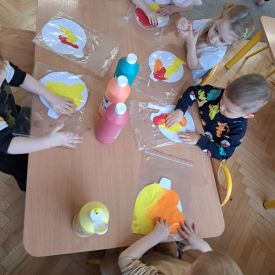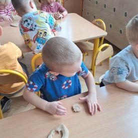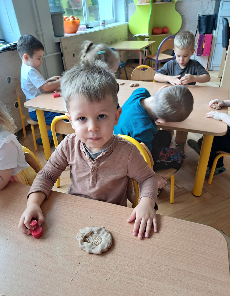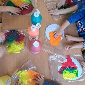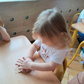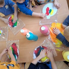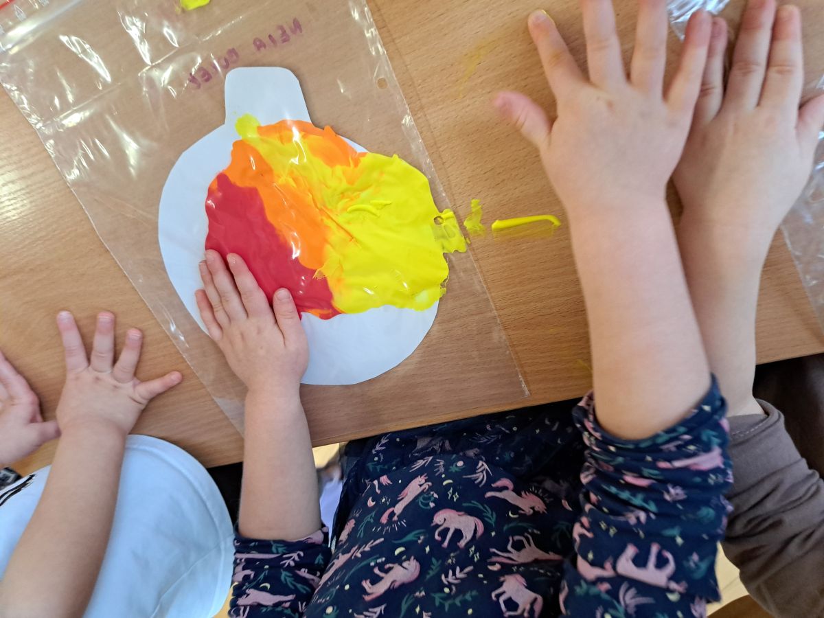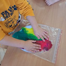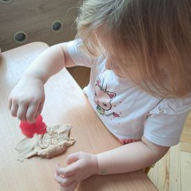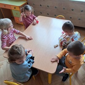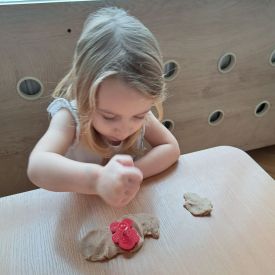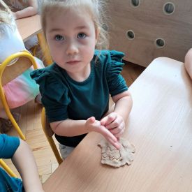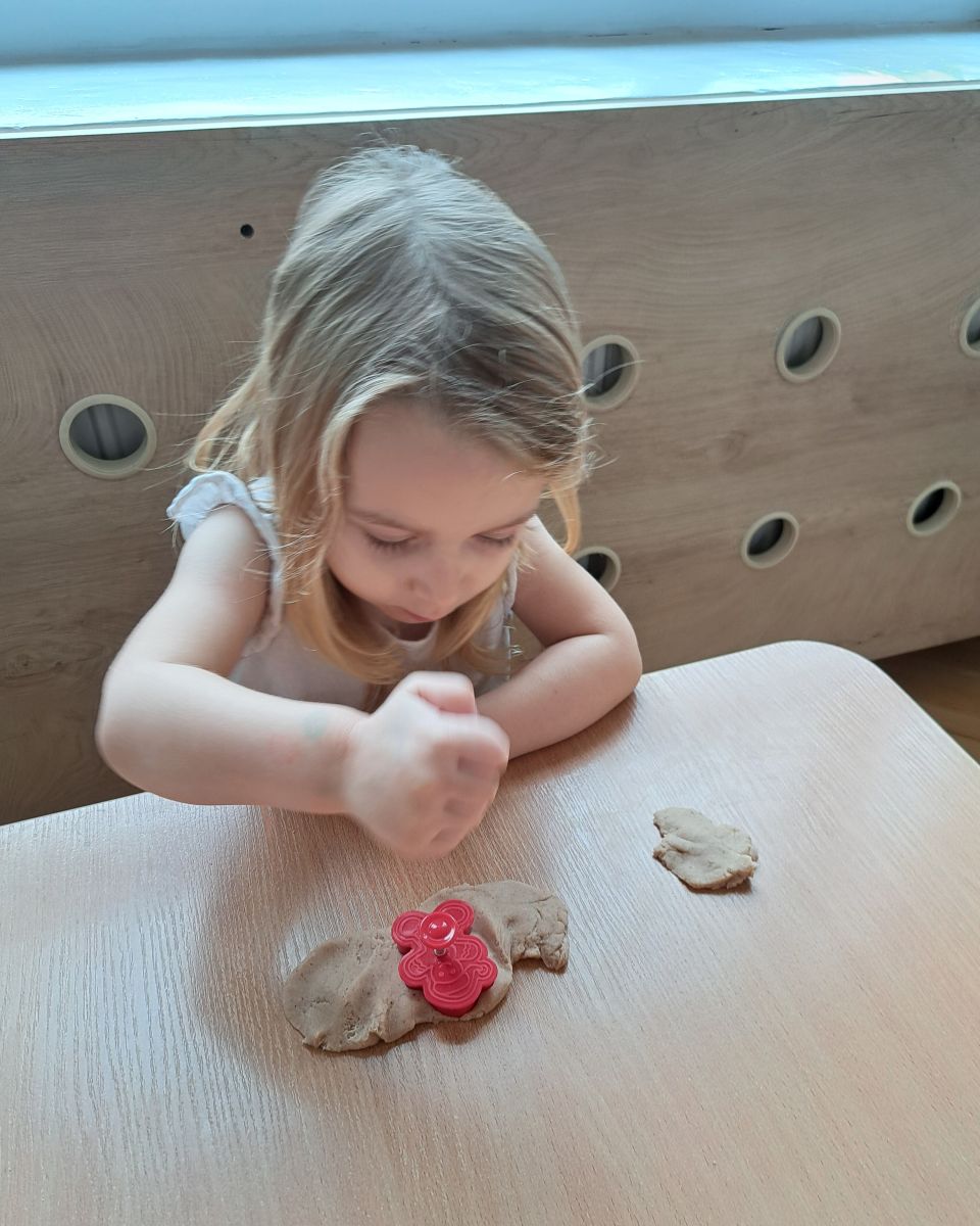Szczególną radość sprawiły maluchom zabawy sensoryczne. Przedszkolaki robiły świąteczne „pierniki” z ciastoliny pachnącej przyprawą do piernika. Zapach „piernikoliny” unosił się w całej sali, wprowadzając wszystkich w prawdziwie magiczny nastrój. Kotki tworzyły również sensoryczne bombki za pomocą farb ukrytych w magicznych woreczkach. Mieszanie kolorów oraz „przesuwanie” farby za pomocą dłoni było dla dzieci ciekawym doświadczeniem.