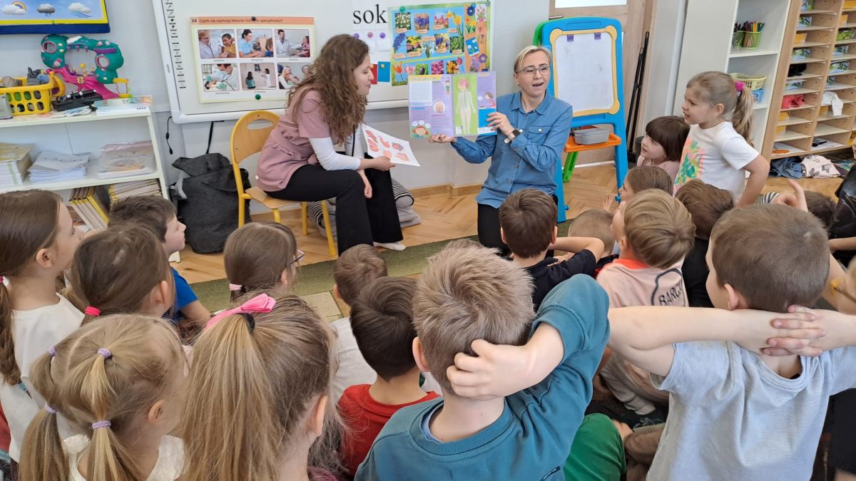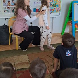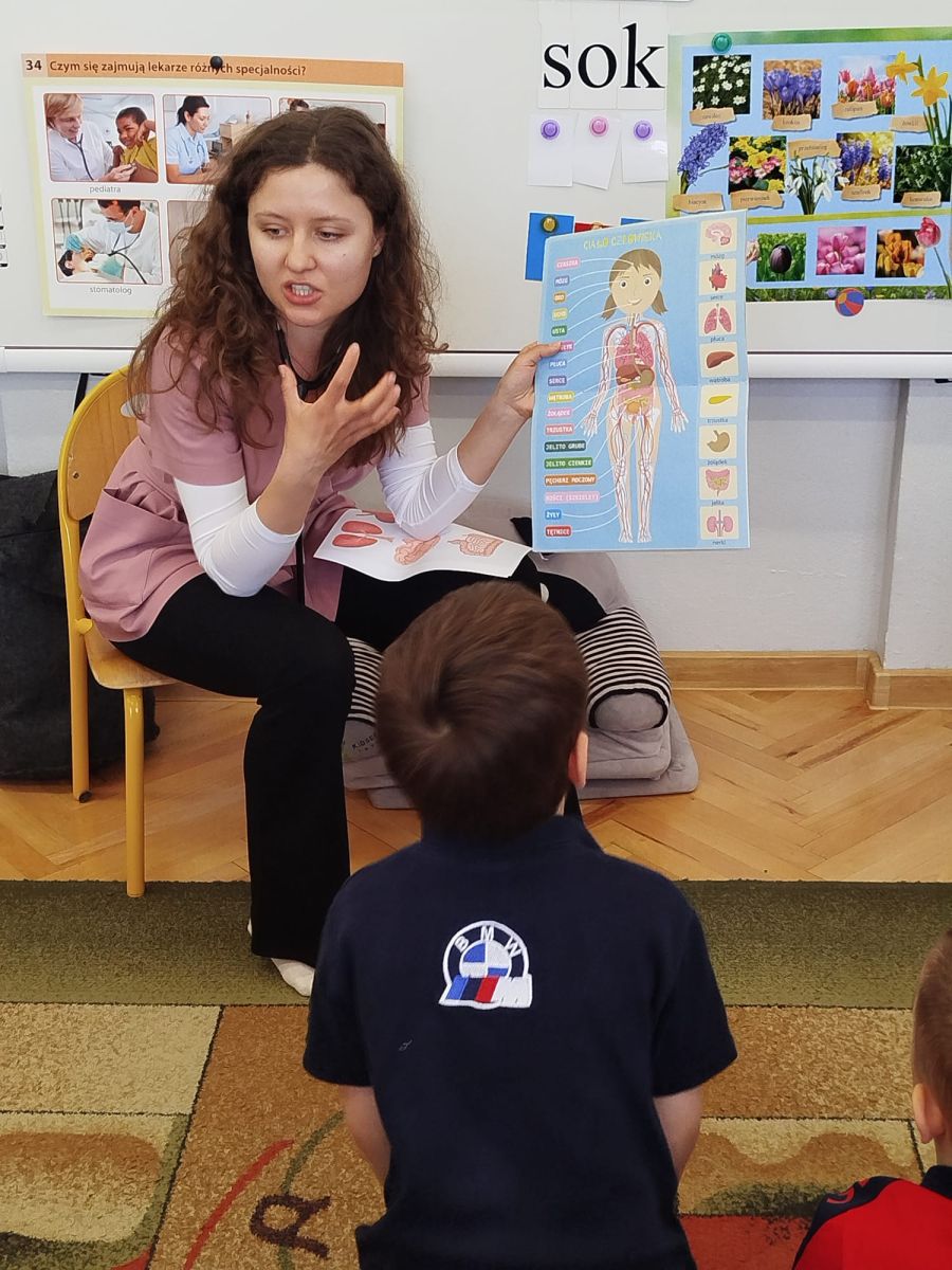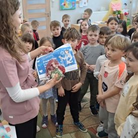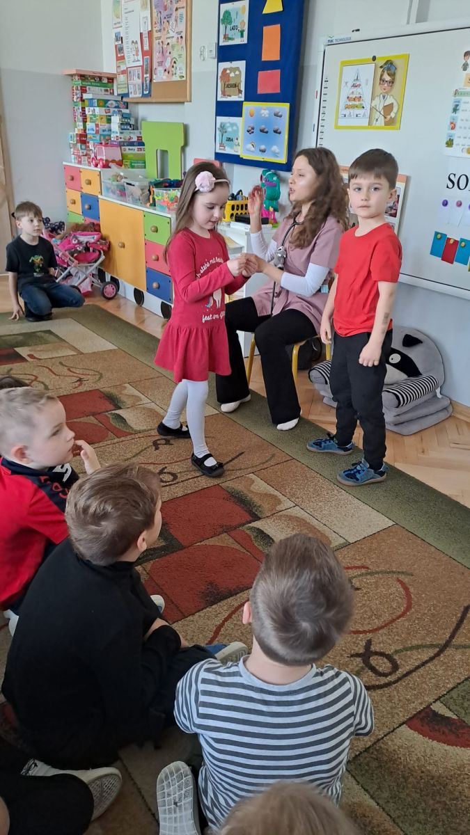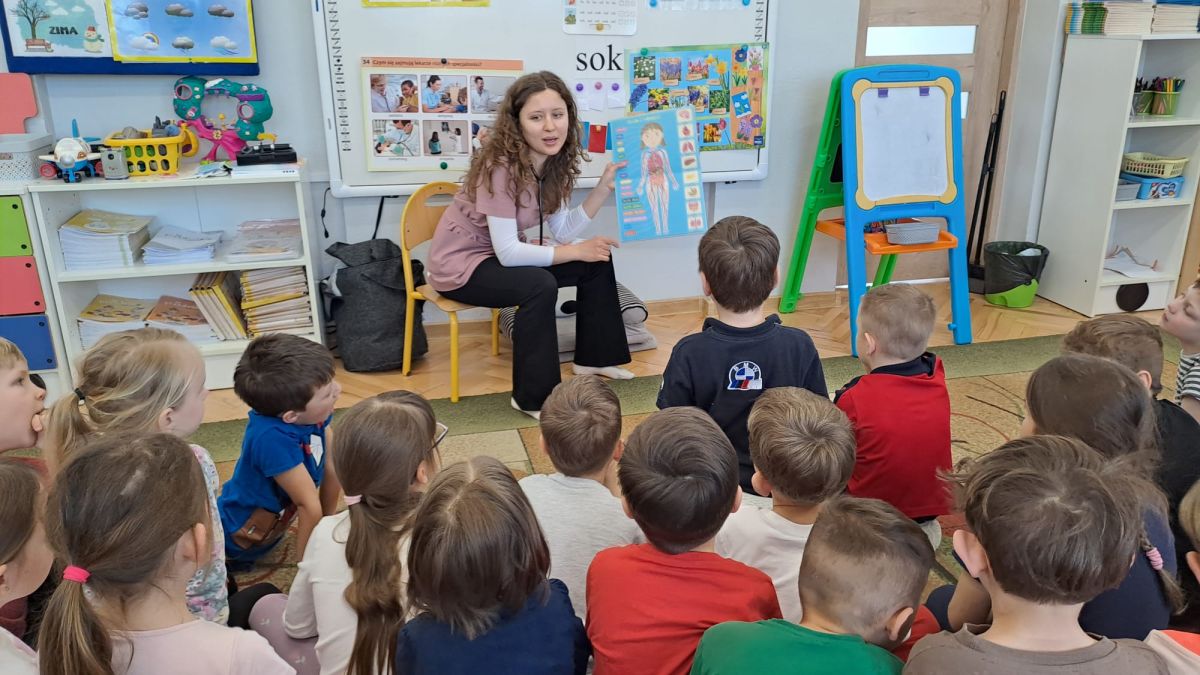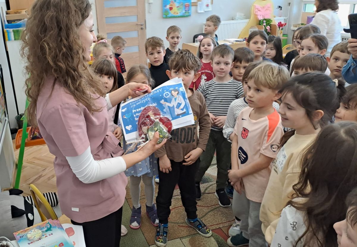 Przedszkolaki bardzo chętnie brały udział w zajęciach – wykazały się dużą wiedzą, odwagą oraz ogromną ciekawością. Zadawały mnóstwo pytań, na które pani Maria cierpliwie i z uśmiechem odpowiadała, tworząc ciepłą i przyjazną atmosferę. W dalszej części spotkania dzieci dowiedziały się, jakie narządy znajdują się w organizmie człowieka, za co odpowiadają oraz dlaczego tak ważne jest dbanie o zdrowie. Pani doktor podkreśliła, jak istotna jest zdrowa dieta, wskazując, jakie produkty warto spożywać, a jakich unikać, aby jak najdłużej cieszyć się zdrowiem i energią. Spotkanie było nie tylko bardzo pouczające, ale również niezwykle interesujące i inspirujące. Na zakończenie pani doktor wręczyła starszakom dyplomy i naklejki, co sprawiło dzieciom ogromną radość.
